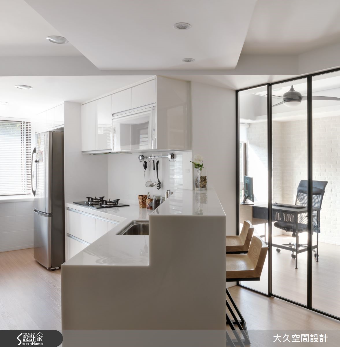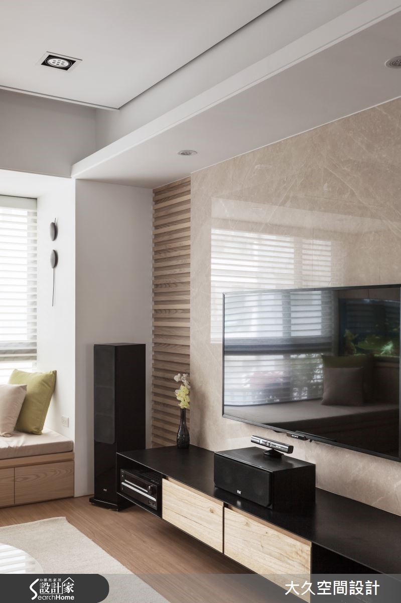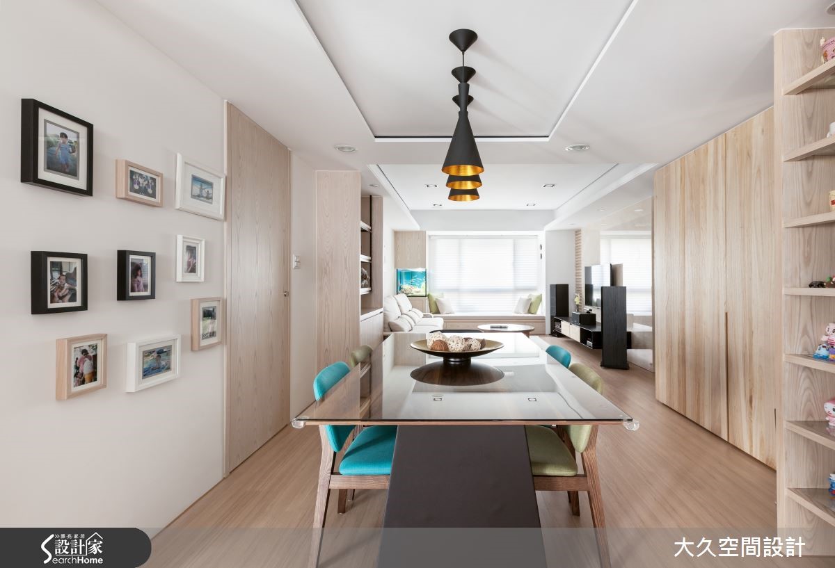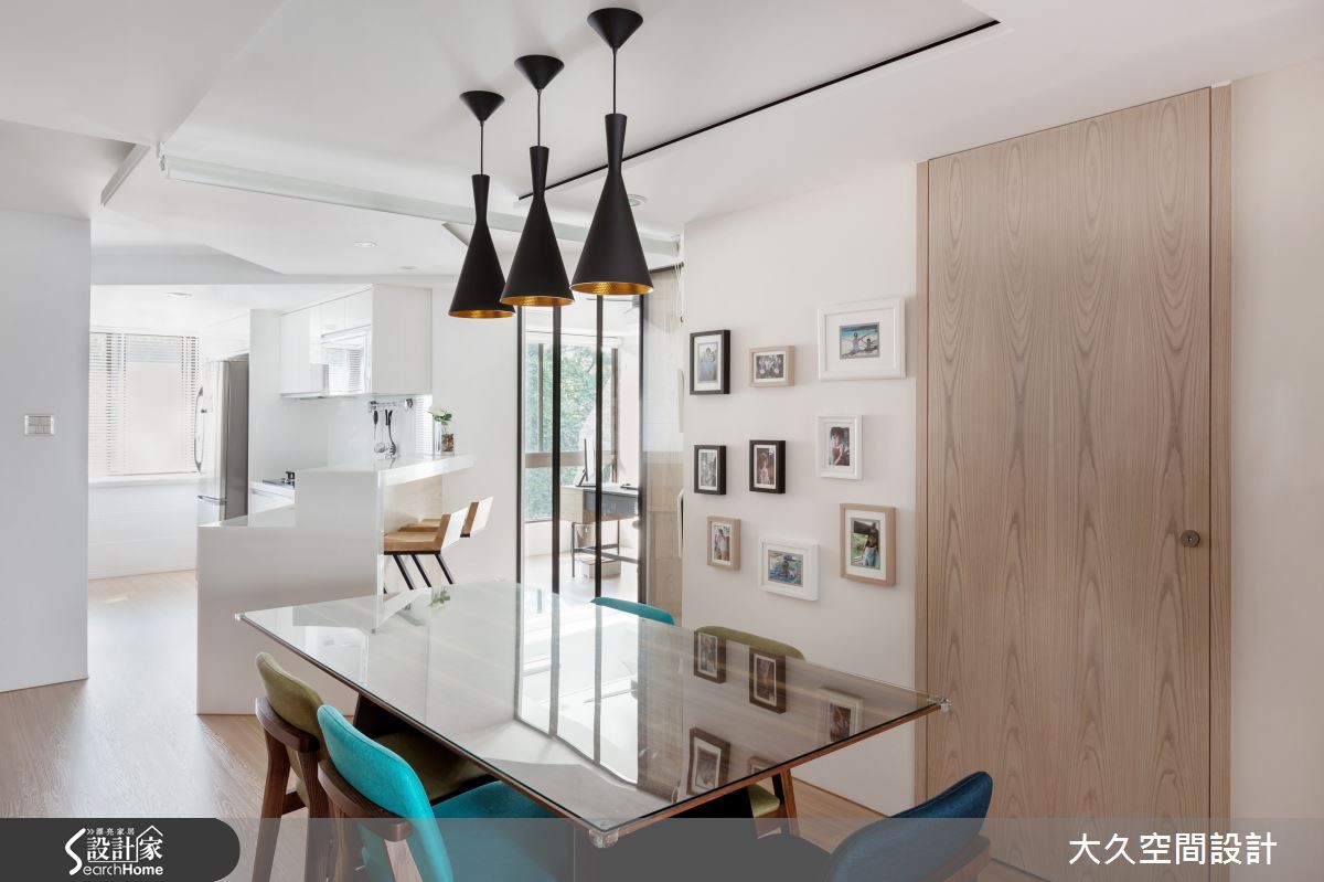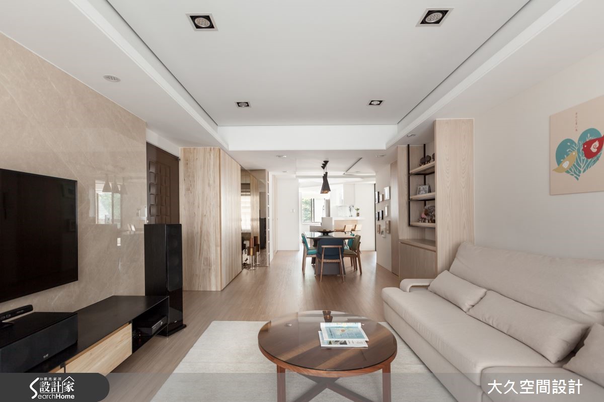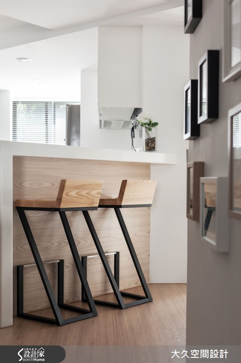 这间99平的空间中,有著大面落地窗的优势,将明亮的光线引进室内。设计师以清爽的浅色木质调和天然石材的搭配,温和色泽铺排舒适的空间氛围,展现简约自在的生活态度。【V型吧台设计,空间增添变化】开放式设计结合客厅与餐厨空间,紧密连系家人情感,以天然石材打造的电视墙面,展现出低调内敛的精致质感。餐厅墙面挂上相框,纪录生活点滴,也可以在用餐时,让一家人的生活回忆成为餐桌聊天话题。机能完备的厨房则以干净的纯白色为基调,延伸出吧台空间划出与餐厅空间界线。书房以落地窗带进充足采光,并利用玻璃与黑铁件的复合材质拉门,保留了视觉的穿透性,隔绝外界的声音干扰,营造安静舒适的阅读空间。