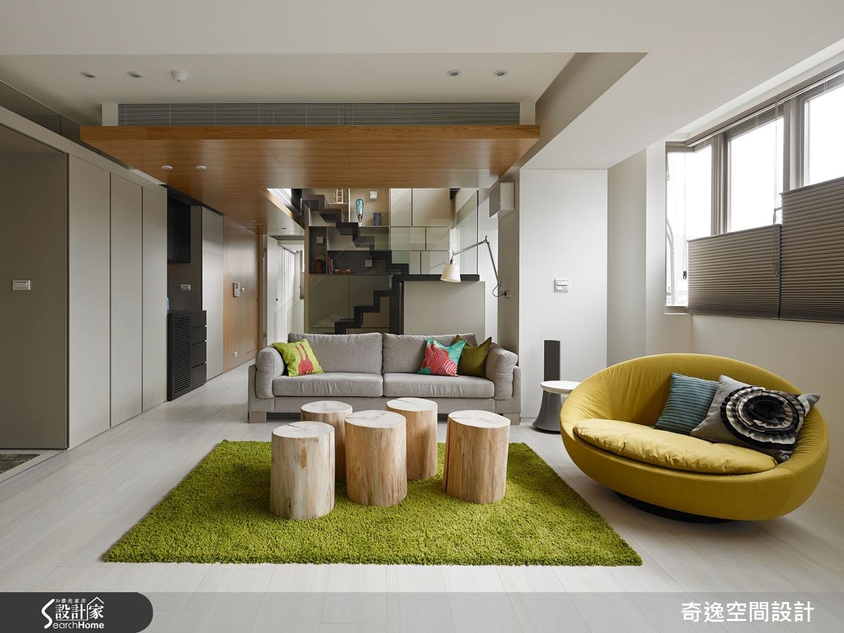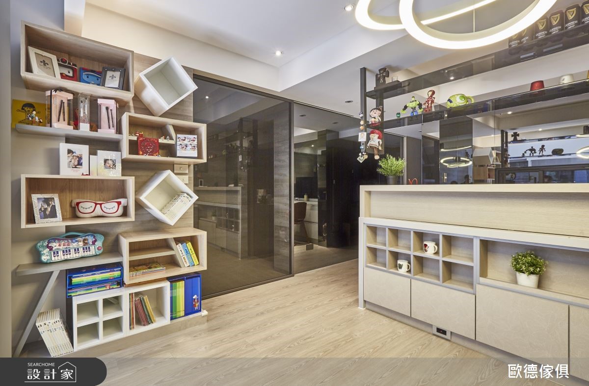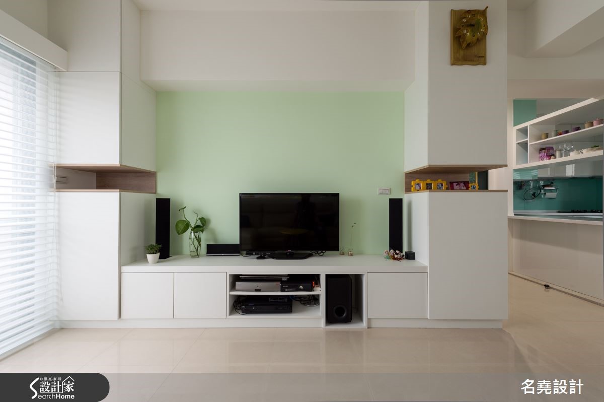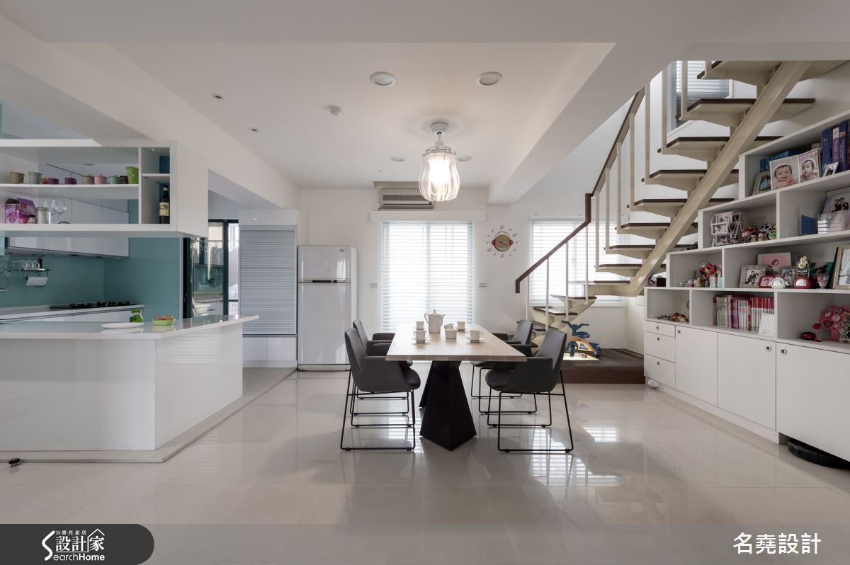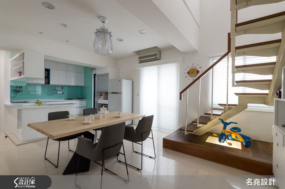 此案二手房原为双层六室格局,设计师因应屋主需求改为四室,且拆除一楼公领域隔断,打造出开放的通透空间。且格外强调空气对流与无毒建材,尤其大部分柜体更精心采用低甲醛建材,替一家人带来明亮、无毒的绿生活。 【薄荷绿墙面,营造清新感】一楼拆除隔断,沙发后方改为矮墙与玻璃隔断,规划出儿童游戏区,打造互动良好的空间。在白色主调中,薄荷绿电视墙搭配通风引流的吊扇,营造清新氛围。而原先密闭厨房则改为开放,并安排无毒低甲醛的系统柜做足收纳,连楼梯下也规划置物,充分运用每平空间。主卧内则拆除既有储物间,改为大容量更衣室,且配置通透推拉门,让室内可采光互通并连贯视野。小孩房以宽敞的开放格局呈现,佐以风格、色调带出热闹缤纷的气息;而随着孩子日渐成长,可增加一道隔断,隔出两间居室。弹性的设计思维,满足未来各种可能。
