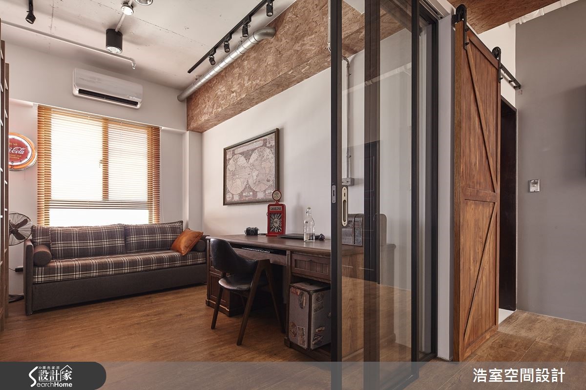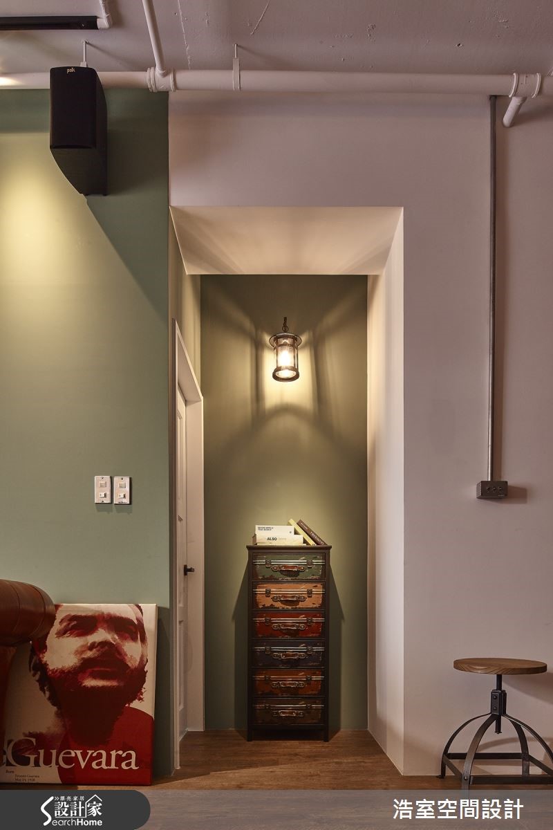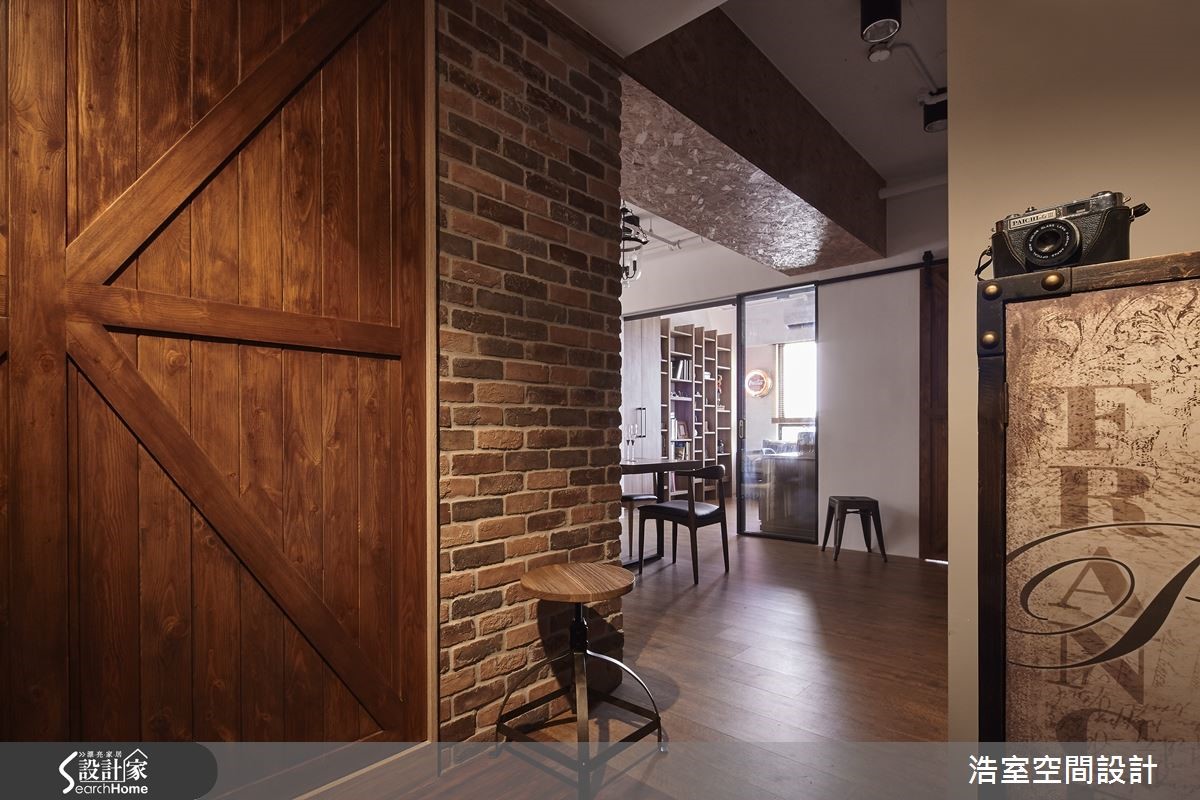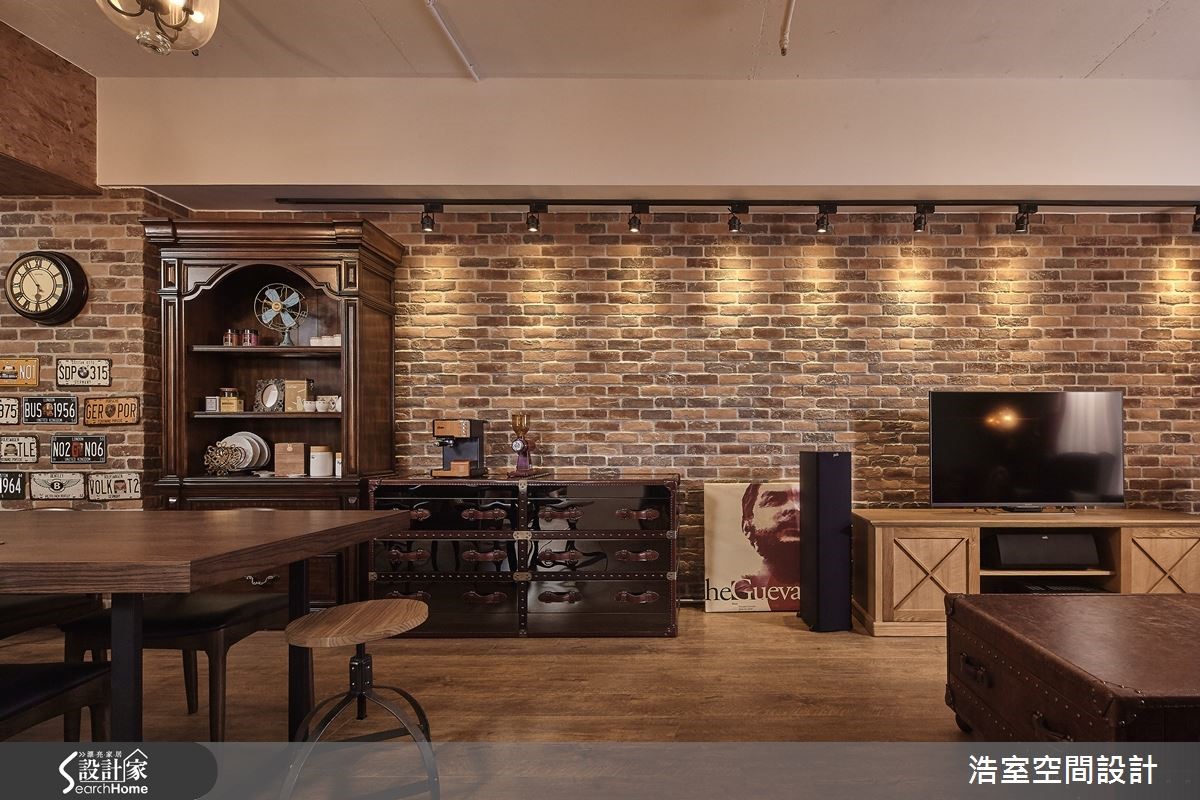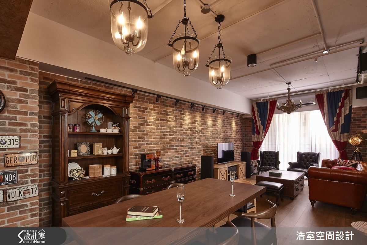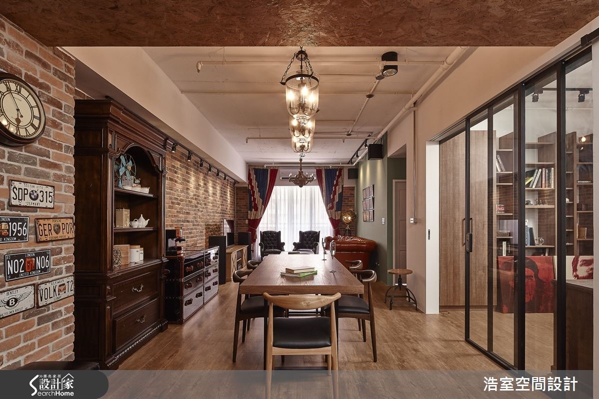 83平方米居宅,运用明管配置呈现Loft风基调,且加入谷仓木门、工业经典元素,佐以风格软件的陈列,打造出浓郁复古的欧风古堡情怀。【以特色家具让空间充满异国情调】玄关以充满特色的谷仓木门作为储藏室门片,打造出吸睛的墙面风景;延伸进入开放式公领域,藉由红砖连贯整个立面,墙面点缀屋主收藏的个性装饰,而天花板的裸露管线则建构出随兴的工业印象;餐厅区悬吊三盏古典吊灯,搭配木质长餐桌、餐椅等,营造精致的用餐氛围。充满缤纷视感的客厅,饱和的清新绿沙发墙,窗边配置英国国旗图案窗帘,搭配古董沙发、皮箱等,让空间盈满独特的异国情调;同时也拆除一面实墙,以清玻、铁件建造书房拉门,赋予无碍明亮的居家视野,并保留书房内的宽敞场域,让书房也可兼做临时客房使用。