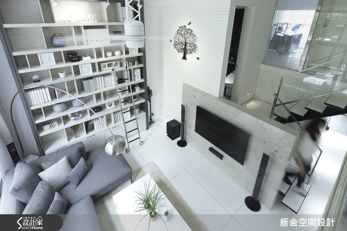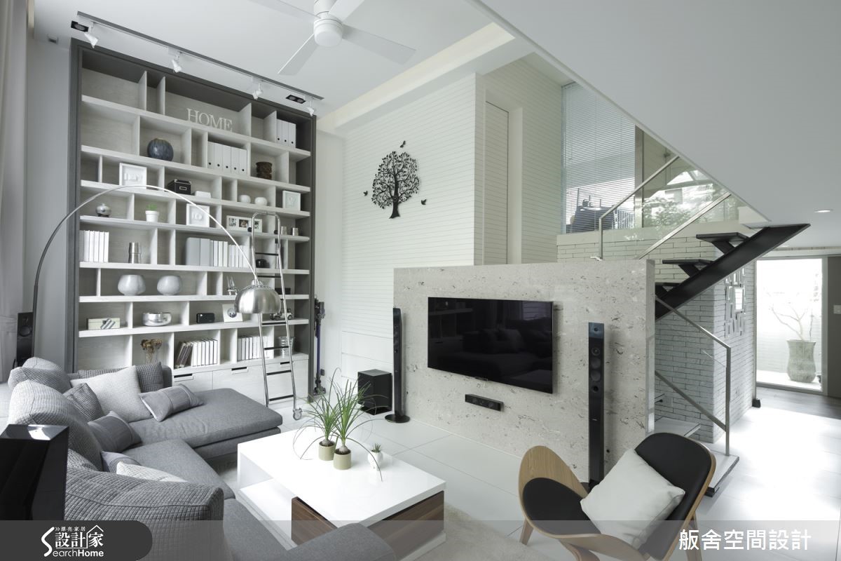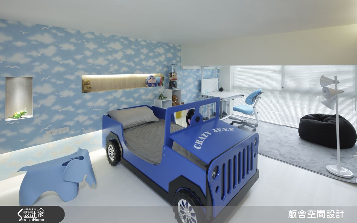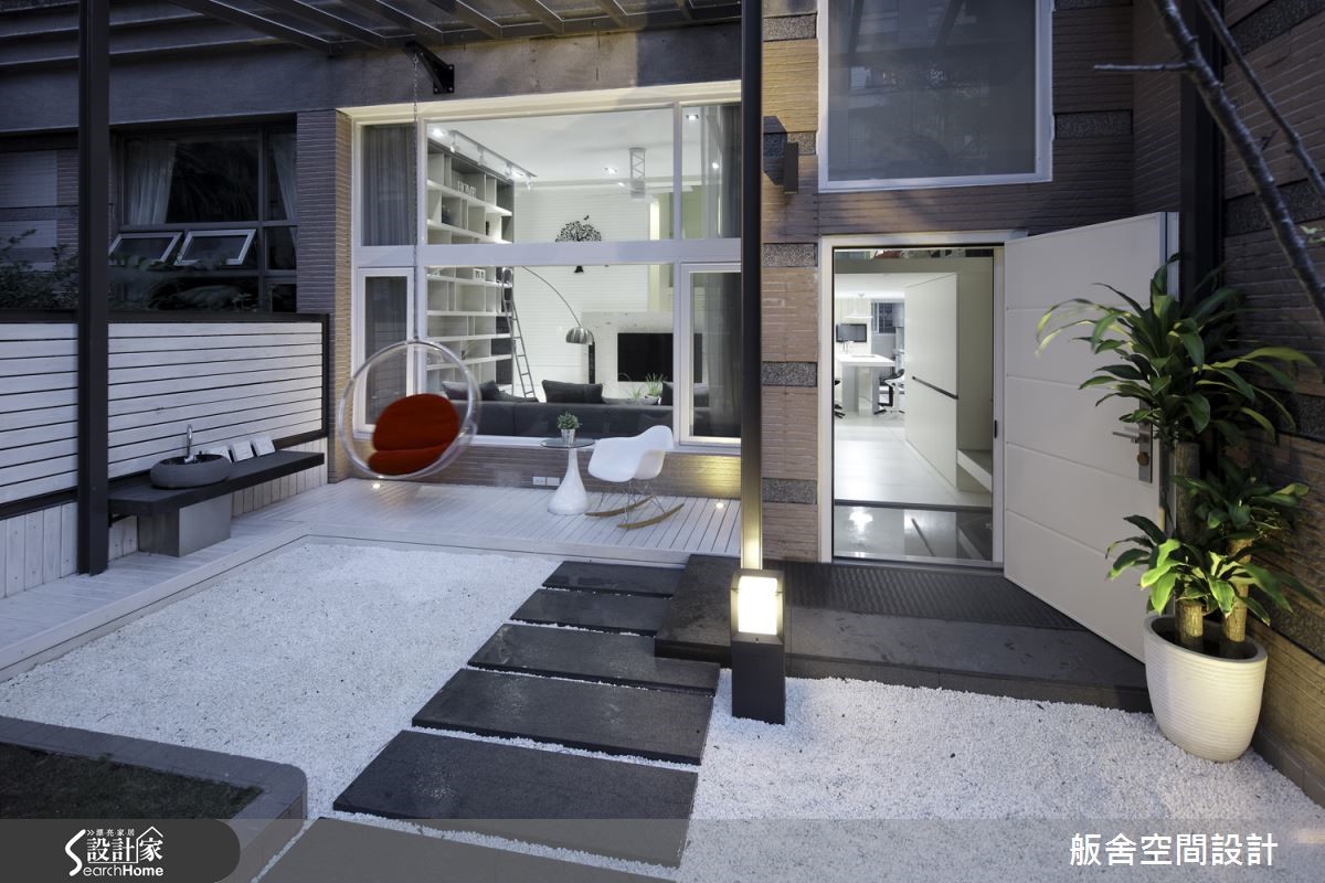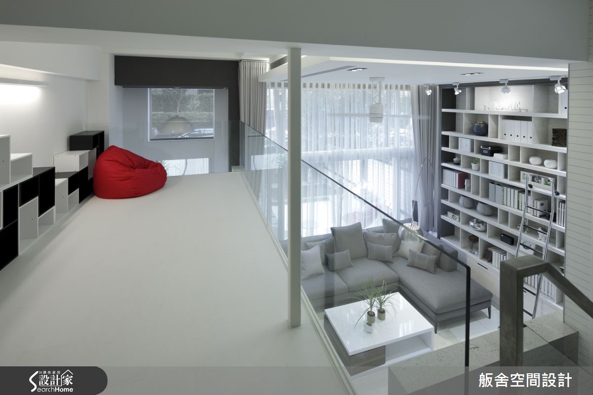 设计师将挑高4米、拥有优良采光与庭院的172平米二手房,配合屋主对现代风格的喜好,以简约利落的线条做为设计基调,改造成拥有阁楼的欢聚空间。【大面开窗引光,打造明亮空间】善用挑高优势,设计师将面对庭院的局部开窗改为大面积落地窗,援引庭院的大量日光与绿意,为摩登感十足的客厅增添净白透亮的气息。通过跃层下方,即可进入半开放的餐厨空间,延续客厅的洁白配色,加入个性纯黑,显示了利落的摩登品味,文化砖上的照片更展示了一家人的天伦之乐。设计师善用跃层错落设计,为屋主争取收纳与扩容需求,并精准利用大面积采光与玻璃材质,打造通透视觉。【玻璃护栏,打造明亮通透的空间】有着透明护栏的跃层空间,以可随意组合的收纳柜与跳色单品,打造专属家人的欢聚时光。主卧有着大器沉稳的氛围,且未脱离黑白基调,营造纽约摩登感;而儿童房则有着舒爽恬静的氛围,汽车造型的小床更增添满满童趣,天青色泽彷佛可以做一个柔软的梦。