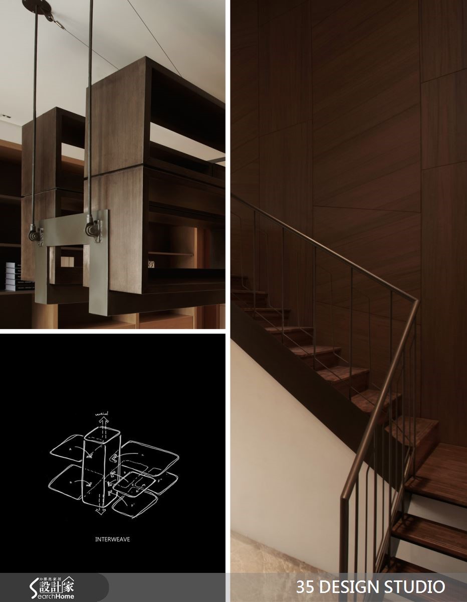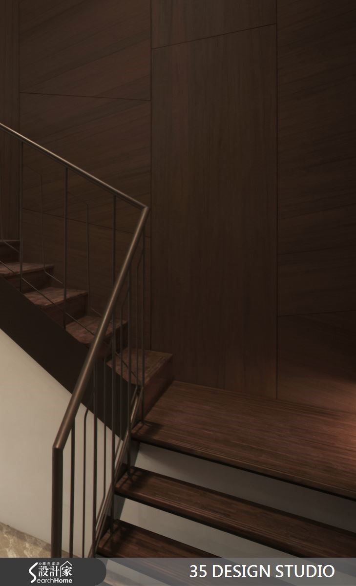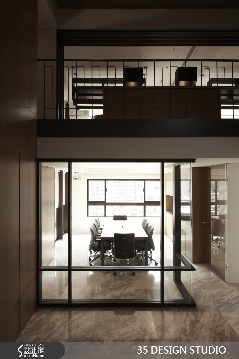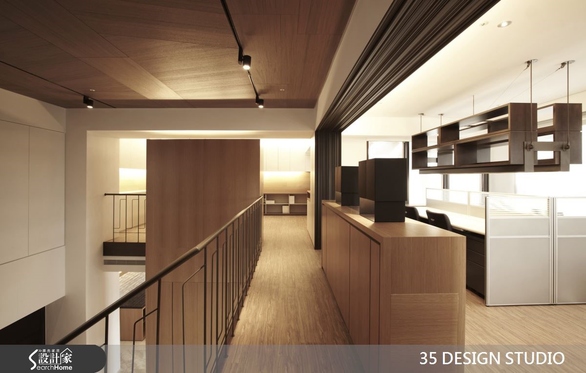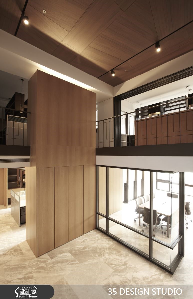 此为土地开发公司的写字楼,设计师重整格局,利用大楼本身的优良采光,迎入通透视野。适时搭配木皮与铁件材质,打造为富有品味与时尚质感的空间。【定位空间重心,安排环绕格局】为解决原先格局的封闭,又在预算的节省下,设计师减少隔断的拆除数量,并抓出空间中心,依依中心安排各部门的空间,环绕式的格局有效缩减动线。一楼会议室拥有大面积的采光,利用清玻璃材质,使光线在空间中展现不同角度的光影效果。转身向上,镂空铁件楼梯降低本身沉重感,复合材质创造了空间立体度。各部门采用通透设计,配置吊柜设计,且灯光隐藏于柜体下方,同时满足收纳和照明需求。墙面两排开放式格柜,使档案与文件得以有效收纳,提高工作效率且降低视觉杂乱感。