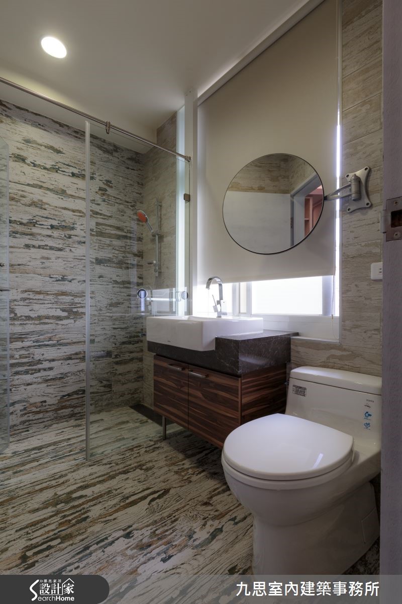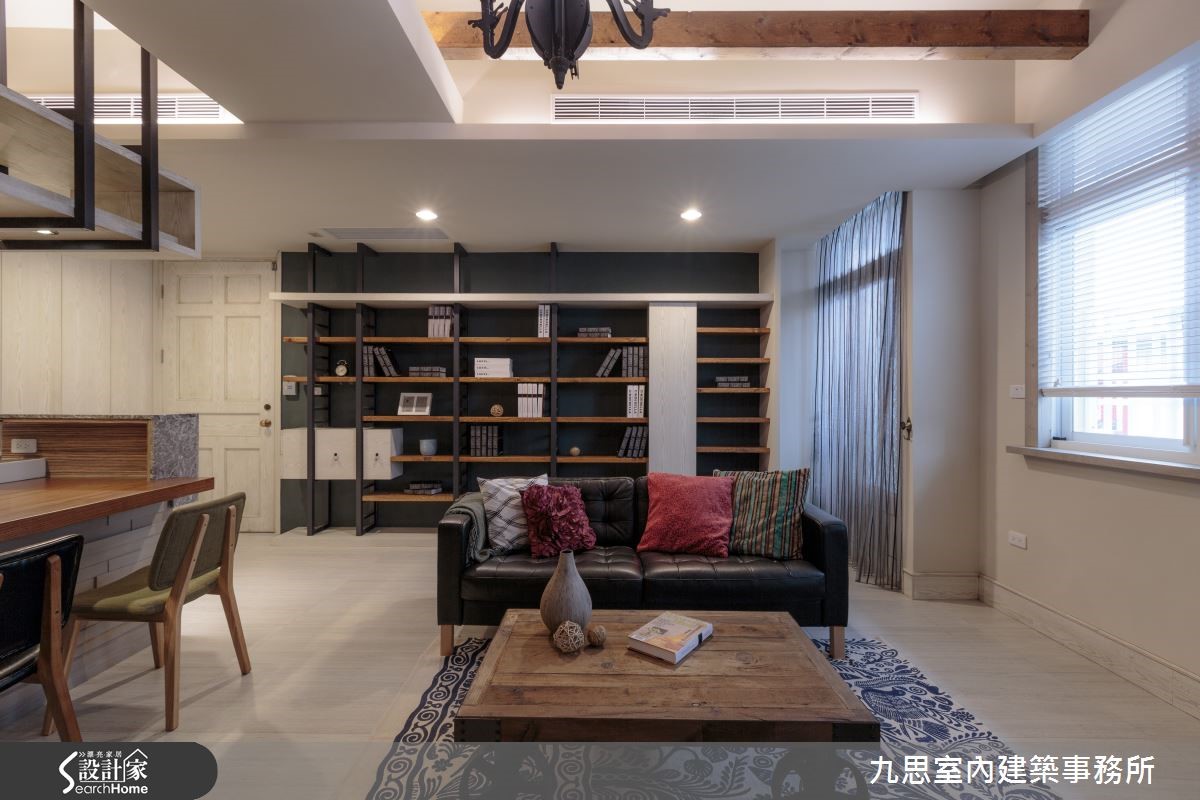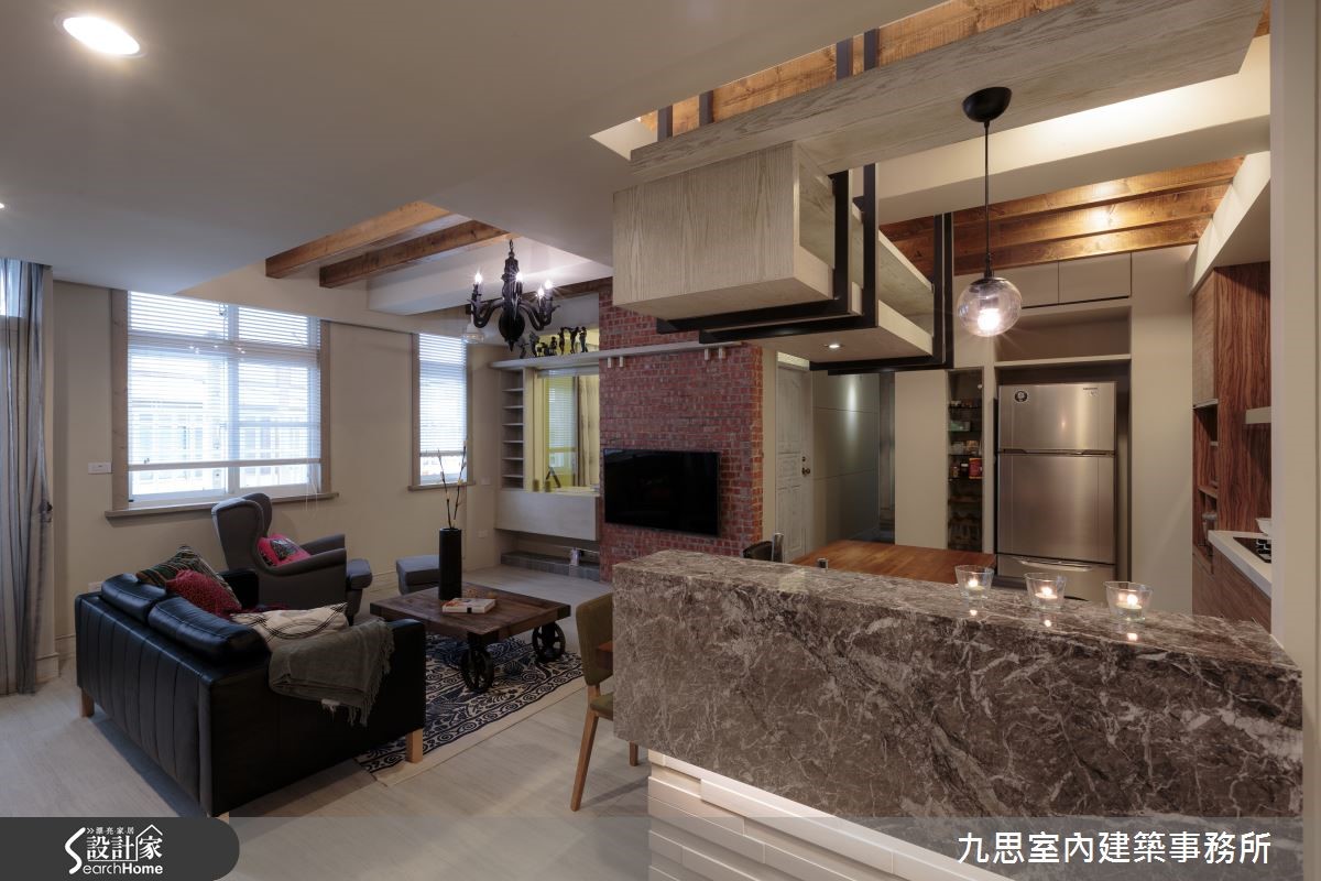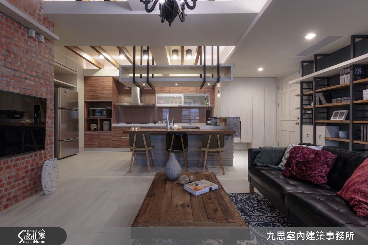 Loft风格对多数人来说肯定不陌生;宽敞及挑高设计加上带有半新半旧的材质,一踏入即能感受不受拘束的艺术气息。设计师于本案例中,利用多种建材变换,加上不同的配色,使带有刚硬利落印象的Loft风展露些许优雅调性。【裸砖铁件,塑造艺术特色】公共领域为开放式设计,以简单大方的格局为主,天花藉由木梁来降低原屋梁给人的压迫感,使空间更显宽广。考虑小家庭人数不多,以木质混搭石材的中岛吧台作为餐桌,且同时具备及客厅稍加区隔之功能,吧台上方则设置了收纳吊柜,提升坪效。客厅电视墙采用特色的裸砖,替空间带入了层次感;而带有工业调性的造型矮木桌及吊灯,加上在客厅后方墙面设置了木质结合铁件的书柜,营造出独到的艺术特色。此外,整体色调以沉稳简单为主,再点缀抢眼的图腾地毯及抱枕,创造亮点。自通往卧室的走道开始,便会发现地板由浅木更改为深浅交错的木质,透过素材变换让公私领域有了区隔。卧室改以粉紫色漆墙,使整体环境多了一股优雅气息,也更为柔和。