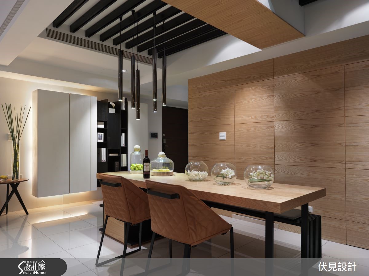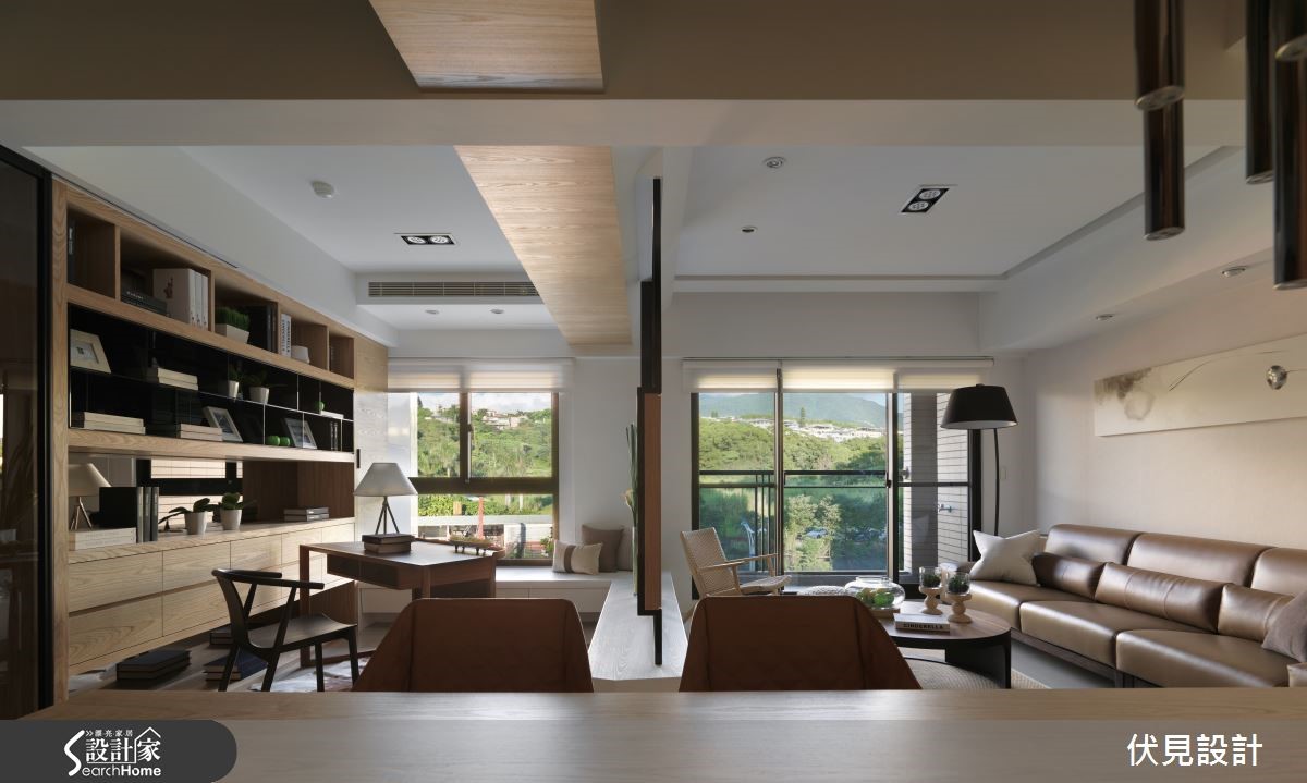 设计师在现代感十足的空间中,注入实木及铁件展现简约调性。善用其方正特质,营造利落且通透感十足的视觉,同时融合户外的自然元素,不显突兀。【运用铁件与实木,平衡调性】自玄关进入,便可见大型悬空收纳柜,搭配实木皮墙面,除了降低视觉沉重感,更增添柔和效果。客、餐厅与书房全然开放,深色横梁镶嵌在既有天花中,与原先主梁形成连贯性的视觉。绿意满盈的客厅,配置色调沉稳的沙发与材质柔软的针织家饰,在光影衬托下更显温润。设计师将铁件塑造为镂空方框,嵌入实木电视墙,与后方开放的书房展开对话,有着大面积茶镜的书柜,则兼具美观与展示功能。餐厅以铁艺餐桌为主角,结合实木墙面,有着刚柔并济的独特效果。 以白色为基调的卧房,上方横梁以圆弧造型设计,去除尖锐元素。双人床前的定制衣柜,同样以铁件木质复合材质打造,搭配书桌与窗外风景,别有一番自然风情。