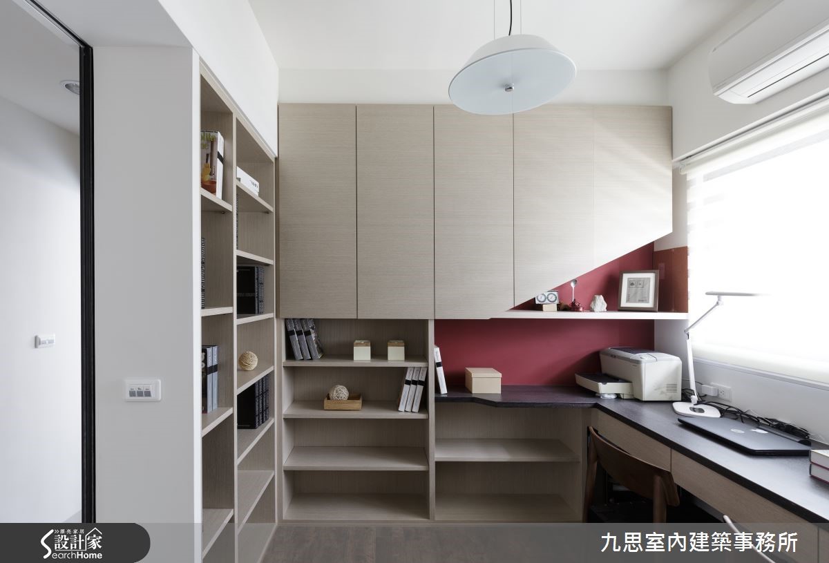 去除繁杂的装饰,以简约线条安排空间架构,让视觉上达到简化干净的效果,并在空间中加点木元素,利用木材质深浅不同的润及色泽与质感纹理,佐上一室清新日光,妆点出疗愈感满分的居家生活。 【开放格局,营造宽敞氛围】走进这户小宅,开放式设计取消领域限制,将书房、客厅、餐厅连结,营造流畅自然的动线,让屋主夫妻的生活更加紧密。设计师并大量运用木材质搭配醇厚的咖啡色调,勾勒沉稳而内敛的空间气质,令人能静心品味生活的美好。浅木色电视墙从客厅延伸至用餐区,浑然天成的木纹肌理恣意蔓延,营造出宽阔的空间感。餐桌旁则以镂空设计,让墙面不只美观,还具有展示收纳的功能性。几何形状的浅色板材则巧妙将厨房与开放空间屏蔽,消除一进门便见到厨房的突兀感。【玻璃移门,扩展开阔视野】轻移脚步来到沙发后方的书房,室内铺上超耐磨地板,深沉的色调营造沉静氛围;半开放的移门设计,让书房与客厅能随时串联;拉上门可以隔绝室外杂音,通透的材质则保留了良好的采光。