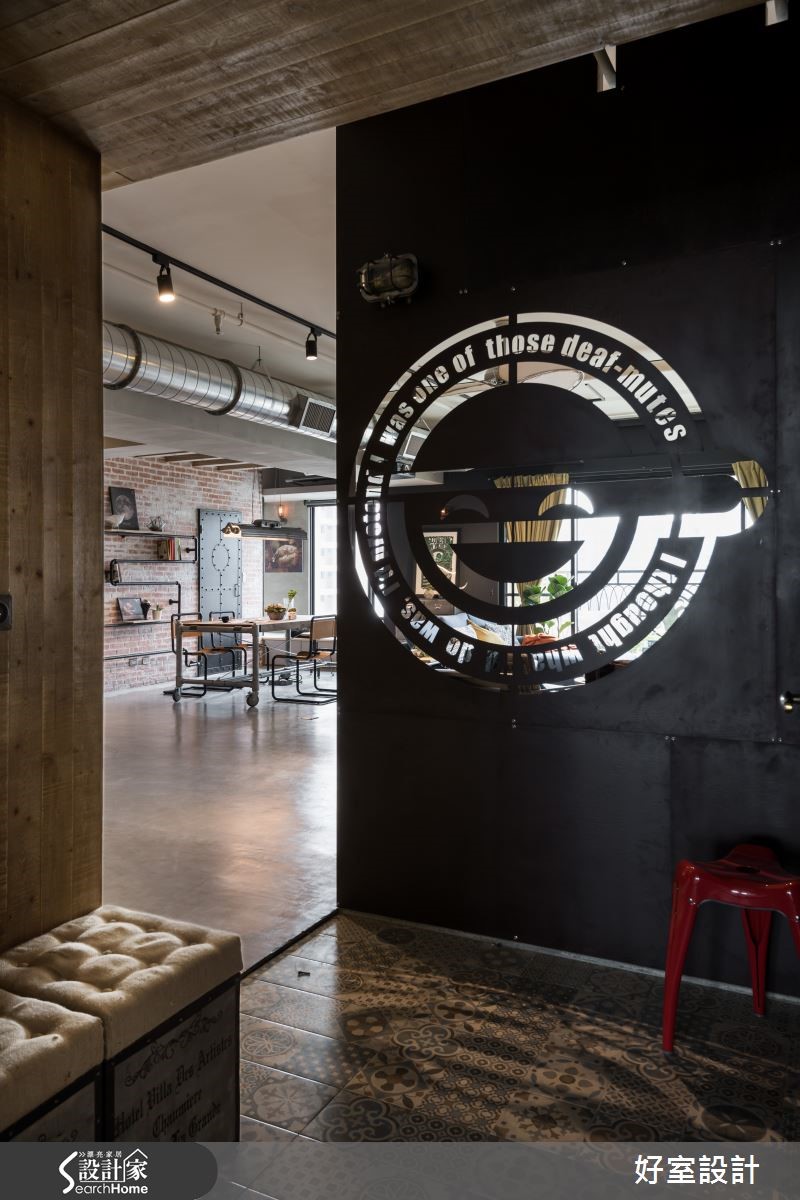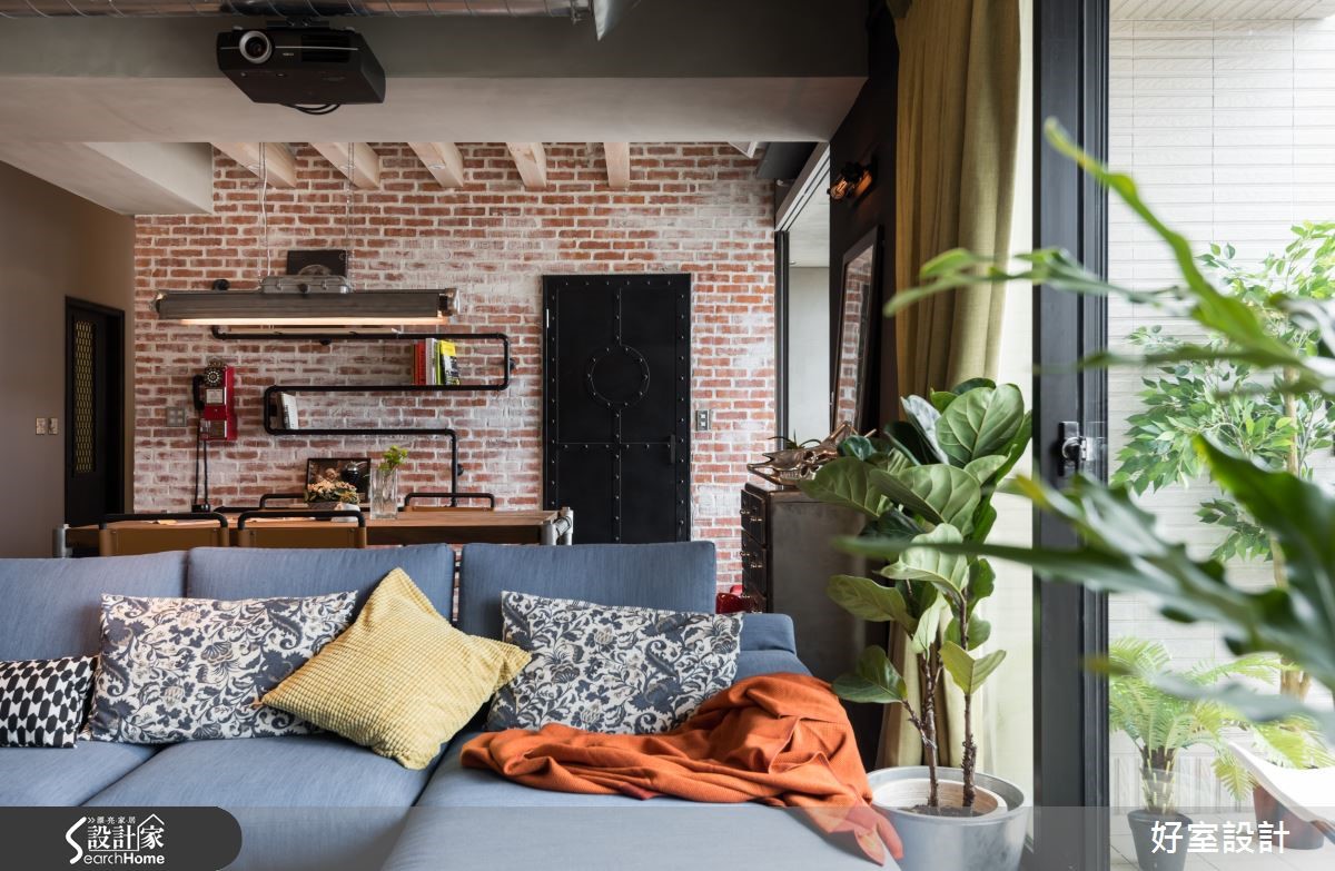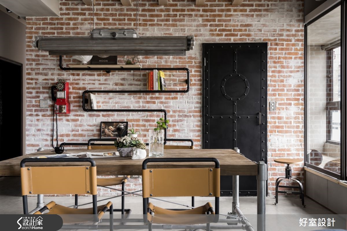 155平方米空间中,以裸露红砖及吊顶天花呈现Loft的空旷感受,大量铁件与木感内装在屋内以万千姿态、多维呈现刚毅与温润的原始美感,将复古工业风的特色发挥得淋漓尽致,仿若回到60年代。【冷调水泥和铁件,造高冷工业范】在个性十足的玄关处,设计师以雷射切割隔屏与复古花砖作为进入主调的前奏曲,软垫造型木箱与红凳,更增添了复古风情。全然开放的客厅与多功能餐厨空间,将原先现房的瓷砖地面皆回复为水泥粉光地面,水泥的中性灰色呈现高冷姿态。客厅上方以轨道灯照明,不着痕迹的框出区域,且与外露的管线设备相当和谐。刻意回复的水泥板模电视墙,搭配左侧大面积松木夹板柜体,营造反差趣味。坐在湛蓝色L型沙发上,就着明亮家饰与窗边绿意,以优质的视频配备搭配投影屏幕,享受个人电影院的时光。 客厅后方的柚木餐桌,整齐的木梁镶嵌在水泥主梁上,工厂感十足的吸顶灯自缝隙中垂坠,搭配铁件皮质座椅,透露老式气息。仿旧红砖墙上的老式电话装饰、铁制管材置物架与一扇铆钉铁门,铺陈富有古早生活情调的故事氛围。窗台空间特意隔出爱猫的专属领域。开放式厨房以纯白瓷砖为墙面布置,搭配纯黑流理台与附有收纳功能的中岛吧台,与冷调吸顶灯相互呼应,左侧钢筋交错排列的立式红酒架,与悬挂植栽形成软硬对比。进入卧室的走道以嵌进展示木柜的文化砖为墙面设计,富有巧思的设置猫门,方便猫咪进出。