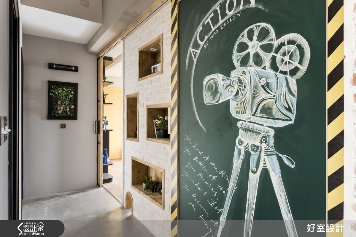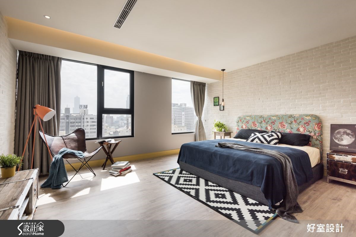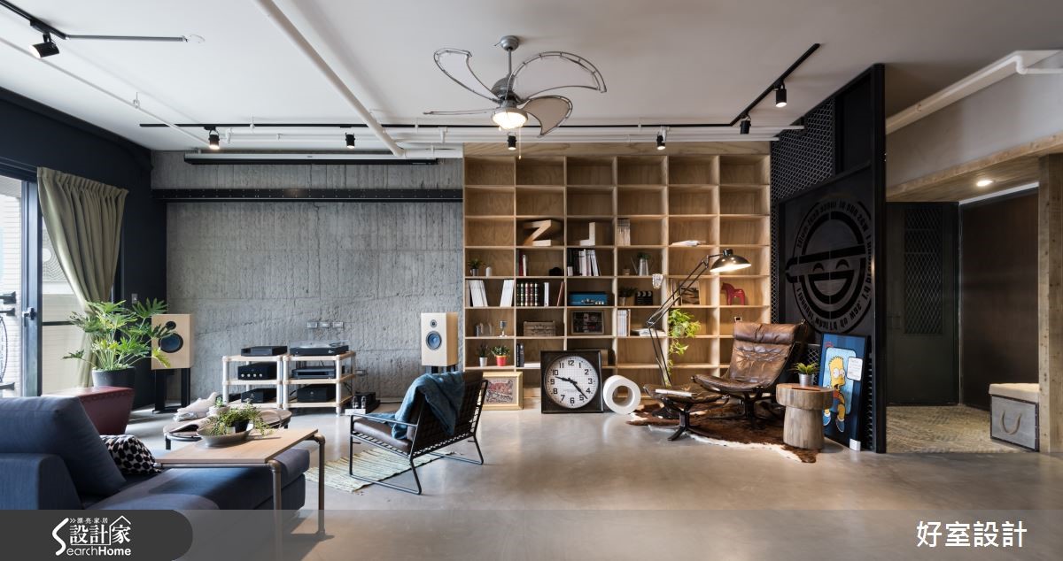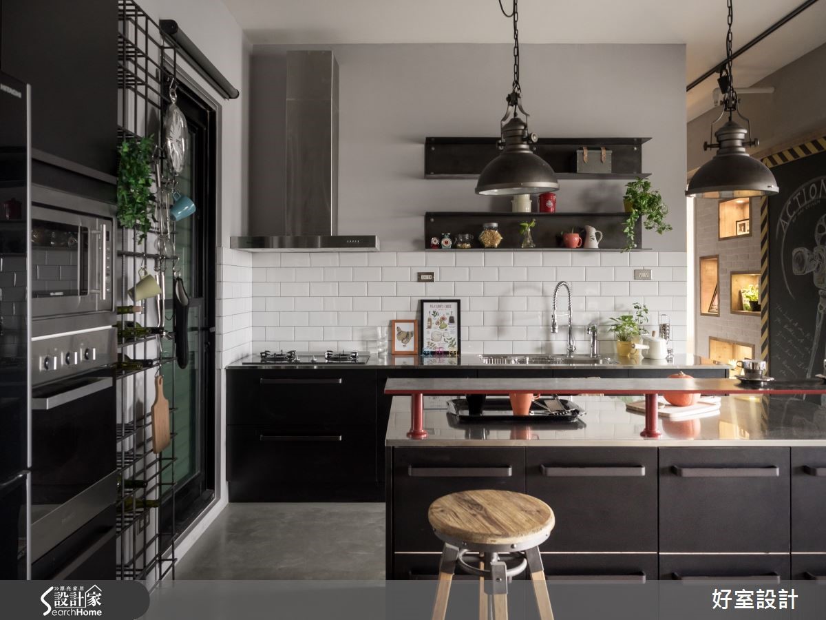 155平方米空间中,以裸露红砖及吊顶天花呈现Loft的空旷感受,大量铁件与木感内装在屋内以万千姿态、多维呈现刚毅与温润的原始美感,将复古工业风的特色发挥得淋漓尽致,仿若回到60年代。【冷调水泥和铁件,造高冷工业范】在个性十足的玄关处,设计师以雷射切割隔屏与复古花砖作为进入主调的前奏曲,软垫造型木箱与红凳,更增添了复古风情。全然开放的客厅与多功能餐厨空间,将原先现房的瓷砖地面皆回复为水泥粉光地面,水泥的中性灰色呈现高冷姿态。客厅上方以轨道灯照明,不着痕迹的框出区域,且与外露的管线设备相当和谐。刻意回复的水泥板模电视墙,搭配左侧大面积松木夹板柜体,营造反差趣味。坐在湛蓝色L型沙发上,就着明亮家饰与窗边绿意,以优质的视频配备搭配投影屏幕,享受个人电影院的时光。 客厅后方的柚木餐桌,整齐的木梁镶嵌在水泥主梁上,工厂感十足的吸顶灯自缝隙中垂坠,搭配铁件皮质座椅,透露老式气息。仿旧红砖墙上的老式电话装饰、铁制管材置物架与一扇铆钉铁门,铺陈富有古早生活情调的故事氛围。窗台空间特意隔出爱猫的专属领域。开放式厨房以纯白瓷砖为墙面布置,搭配纯黑流理台与附有收纳功能的中岛吧台,与冷调吸顶灯相互呼应,左侧钢筋交错排列的立式红酒架,与悬挂植栽形成软硬对比。进入卧室的走道以嵌进展示木柜的文化砖为墙面设计,富有巧思的设置猫门,方便猫咪进出。