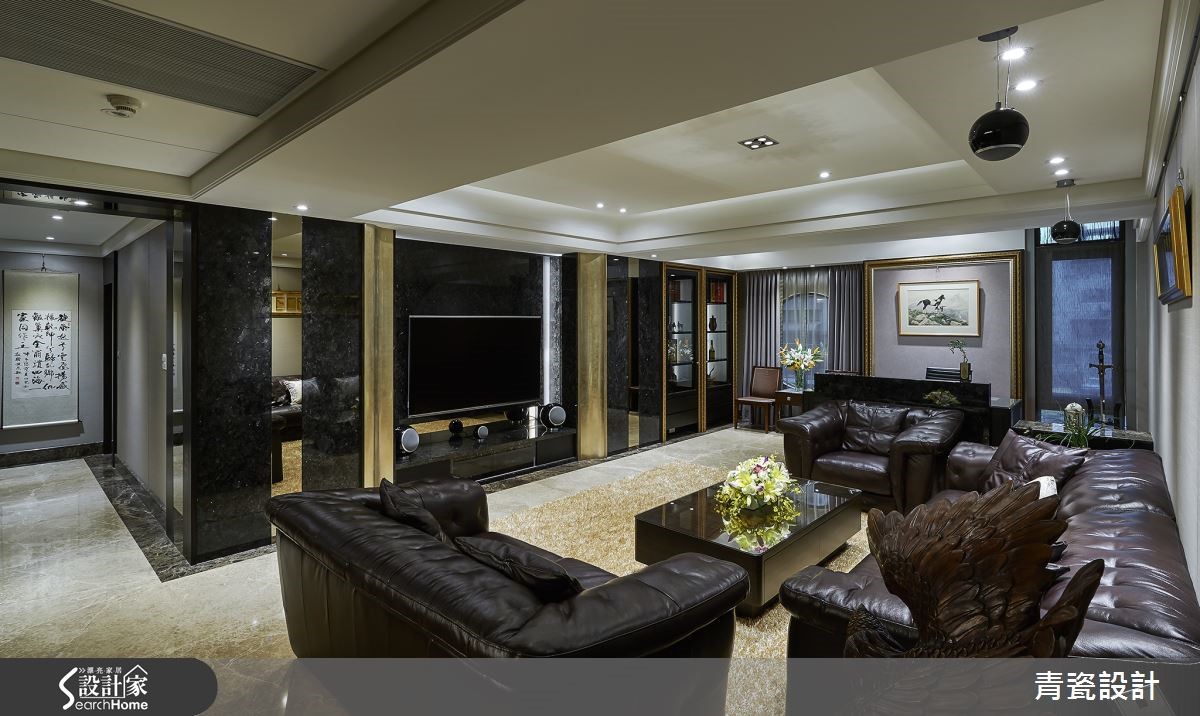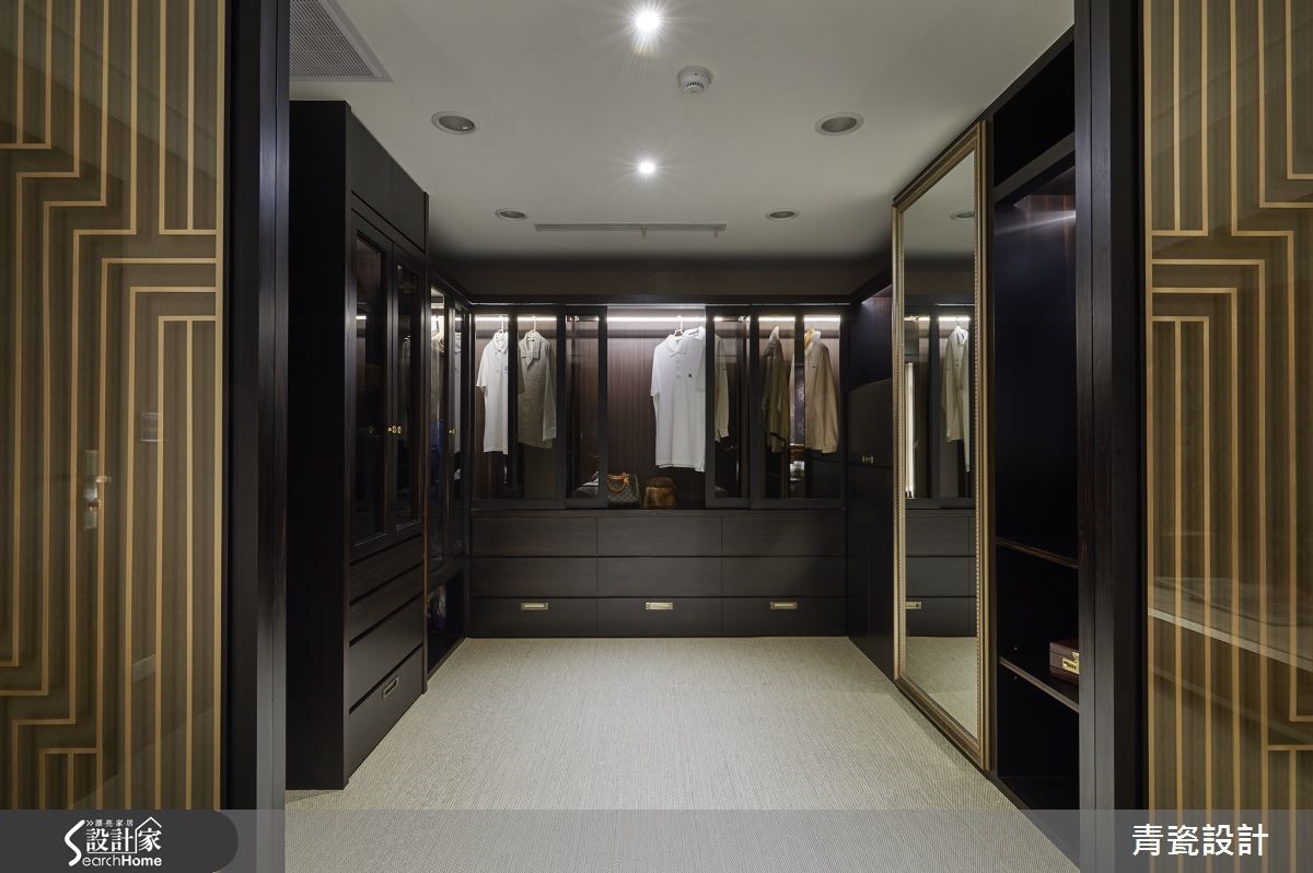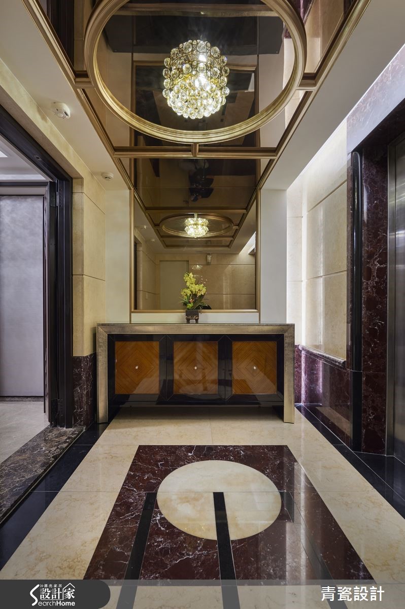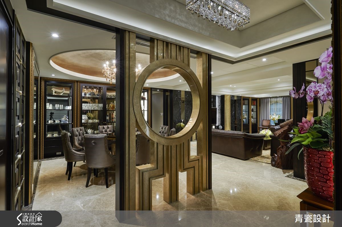 这户坐拥264平的宅邸,深具大器典丽的元素,加上宽敞的内外玄关、富有沉稳质调的客厅与精致的用餐空间,透过新古典风格别出心裁的设计,居住者的品味与气质。【铺陈镜面、金箔,造轻奢质感】设计师为屋主量身打造,将中古屋翻修成可全然放松休憩的气派大宅。从矜贵的外玄关设计,即可看见屋主对风格的要求。大理石地板、造型水晶灯及钛金属板相互辉映,在茶镜的反射下显得格外华美;进入内玄关走廊,即可由金箔镂空隔屏,略窥开放客餐厅的优雅风貌。陈设沉稳家具的客厅,选用奥罗拉蓝大理石电视墙,搭配两端金箔柱体,显示居住者的气度非凡。餐厅采用金箔吊顶与水晶吊灯,搭配8人圆桌,衬托得宏伟雄大。黑镜墙面与后方有着金箔滚边、数量可观的酒品与收藏展示,更显雍容。主卧以优雅墙纸与黑檀木柜体为视觉亮点,配有金质玻璃拉门的大型更衣间,更显时尚质感。兼具时尚与品味的次卧,衣橱则有着茶色玻璃的特殊设计,可做为穿衣镜使用,在注入轻奢质感的同时也富含机能。