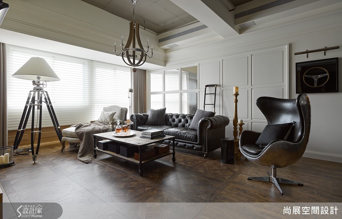 客厅仅以线板背墙作为衬托,透过家具作为中心主角。特地安排经典美式家具Restoration Hardware,沙发有着复古典雅的拉扣设计,皮革单椅则以铁艺修饰,本身强烈呈现二十世纪初的复古风格;同时透过深黑色系,展现理性阳刚氛围。