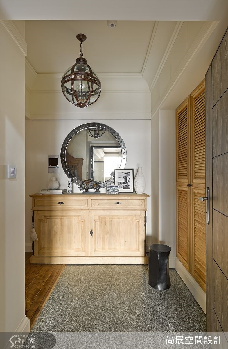 玄关运用石材地面与木质柜奠定温润质感,巧妙透过家饰布置展现品味。在天花点缀地球仪造型的铁艺吊灯,搭配复古圆形镜面,带有中世纪风格的装饰线条,质感更为提升。