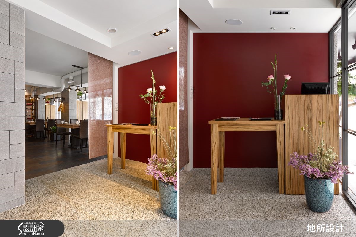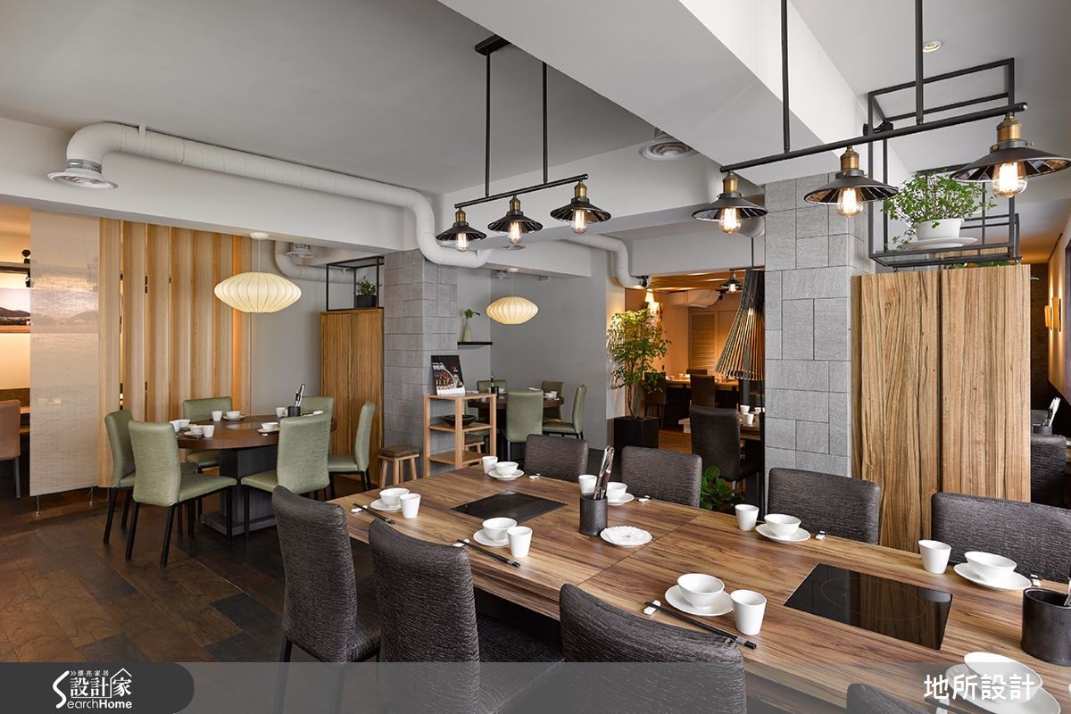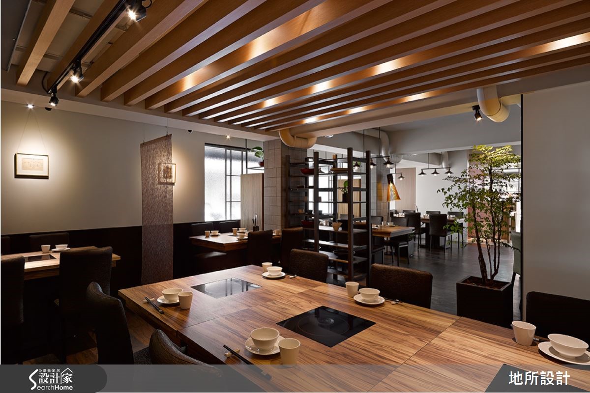四一町锅物餐馆从外观招牌上的书法设计,以及门口摆设的造型盆景看来,有着浓厚的东方感;搭配上方的麦杆造型及红白设计,再注入了活泼逗趣的现代感。【东方红墙面吸人眼球】进入候位区,简约大方的木质柜台,以东方红墙面为基底,并利用优雅的浅红帘幕与用餐区域做出空间区别,搭配插着富有日式韵味花材的花器。候位区另一边则放置木质格栅座椅,与磨石子墙面形成轻爽的视觉景致,店内满盈沉稳的禅意风格。进入用餐区,看见的是深色木质地板与上方铁制工业感吸顶灯;轨道式照明于细密的木梁间透出,制造温暖润泽感。而木质长桌、圆桌以及沙发区因应各种人数与需求。有趣的是,不同用餐区域搭配不同灯饰,如沙发区的轨道照明与圆桌的日式灯罩,营造多维用餐氛围。开放式空间在各用餐区间则以石板柱体、木质落地柜与上方的铁件饰架、或轻纱帘幕巧妙做为区隔,给予顾客良好的用餐空间。