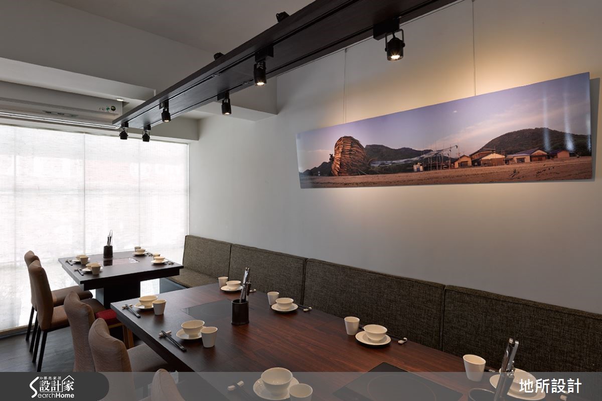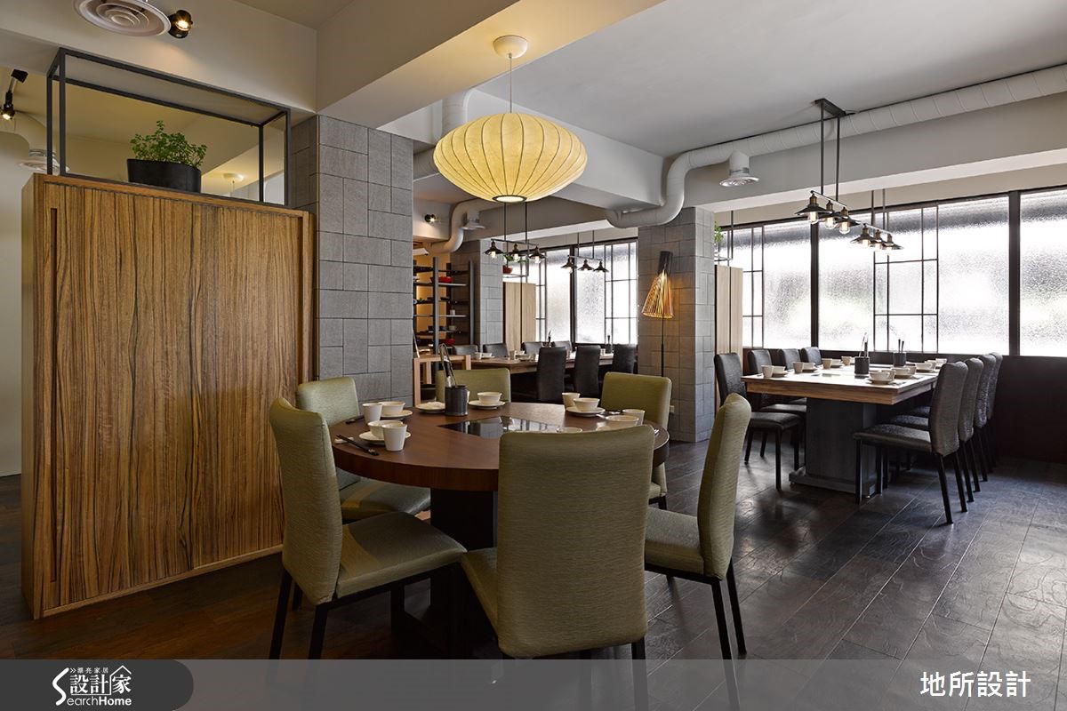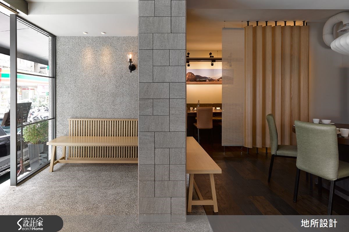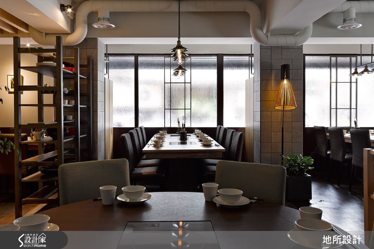 四一町锅物餐馆从外观招牌上的书法设计,以及门口摆设的造型盆景看来,有着浓厚的东方感;搭配上方的麦杆造型及红白设计,再注入了活泼逗趣的现代感。【东方红墙面吸人眼球】进入候位区,简约大方的木质柜台,以东方红墙面为基底,并利用优雅的浅红帘幕与用餐区域做出空间区别,搭配插着富有日式韵味花材的花器。候位区另一边则放置木质格栅座椅,与磨石子墙面形成轻爽的视觉景致,店内满盈沉稳的禅意风格。进入用餐区,看见的是深色木质地板与上方铁制工业感吸顶灯;轨道式照明于细密的木梁间透出,制造温暖润泽感。而木质长桌、圆桌以及沙发区因应各种人数与需求。有趣的是,不同用餐区域搭配不同灯饰,如沙发区的轨道照明与圆桌的日式灯罩,营造多维用餐氛围。开放式空间在各用餐区间则以石板柱体、木质落地柜与上方的铁件饰架、或轻纱帘幕巧妙做为区隔,给予顾客良好的用餐空间。