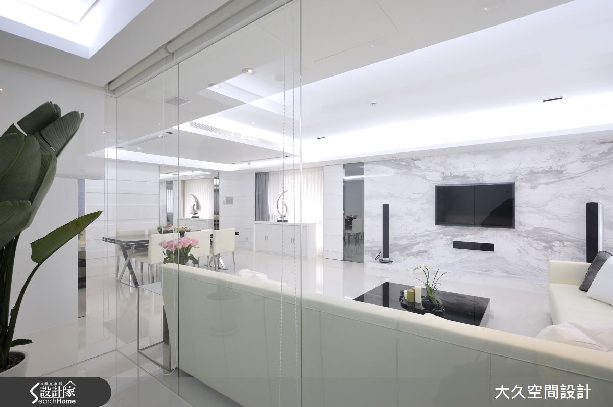 在这间现代宅中,设计师以纯白作为基底,运用大理石、钢琴烤漆等材质打造出精致大器的氛围,同时加入灯光强化明亮度,打造出百看不厌的素净居宅面貌。【深色镜面,点缀纯白空间】全室采用净白色系,于客厅天花板内嵌间接光源,运用色彩、灯光延伸空间视觉。电视墙运用大理石材增添纹理,善用黑镜增加墙面的立体度。同时点缀黑色抱枕与矮桌强化黑白对比。书房位于客厅后方,采用清玻璃让采光、视线可自由流通,并形成与公共空间串联互动的视野。餐厅净白的墙面则利用凹凸立体,丰富视觉变化。整体采开放式设计手法,使空间显得宽敞舒适。