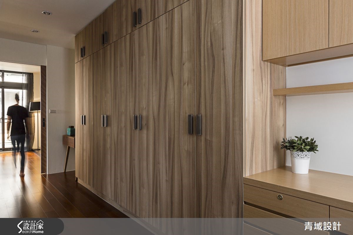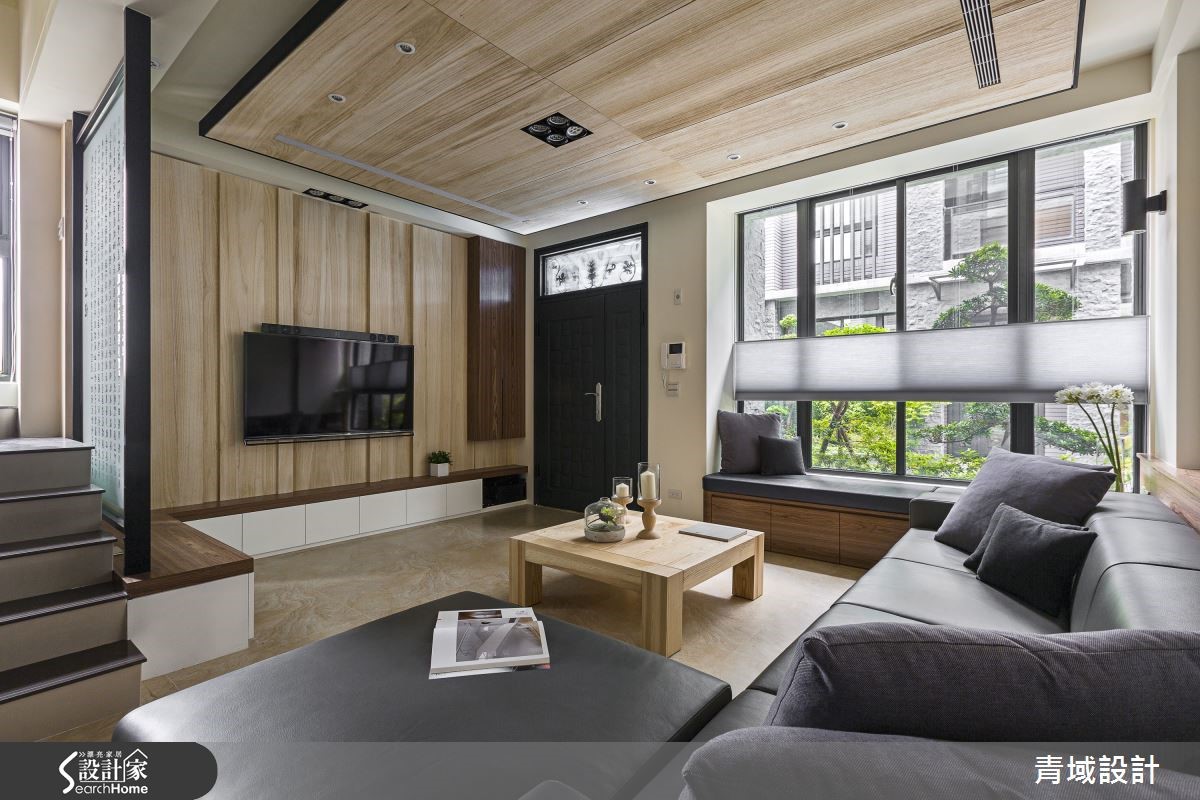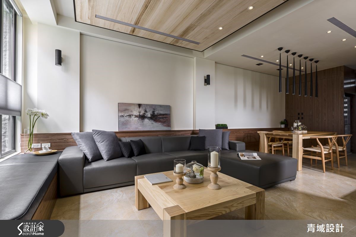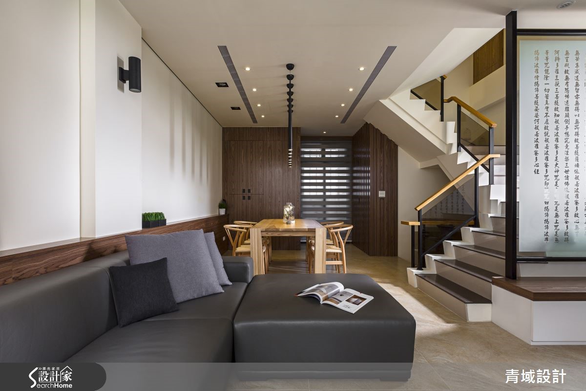 281平米现代别墅注入大量恬静自适的日式禅意,与兼具大量收纳机能的现代感居宅完美调合。 【光线与木质,营造温润休闲感】一楼客厅以长条型雾面玻璃柔化由大面积开窗的光线,使全然铺陈木地板的客餐厅区域明亮通透。并利用下降式天花,让客厅视觉与主梁齐平,搭配内缩做间接照明并混合嵌灯,为木感基底制造温润气息。灰阶沙发及窗边附有收纳功能的飘窗,则为家人营造温馨的休闲感。【多功能餐厅,凝聚情感兼具收纳】电视墙延伸至上方下降天花色调,提高整体视觉明度。进入可供家人用餐、读书与聊天等多元机能的餐厅,木质长桌为凝聚家人感情的场域,造型悬吊吸顶灯彷佛禅意十足的风铃,缠绕着家人间的轻松细语;餐厅后方的木皮与格栅落地柜蕴含大量收纳机能,同时具有沉稳质感。 【大型落地柜,符合收纳需求】由铁木交织的楼梯拾级而上,在进入居室前,设计师为注重家中收纳机能的屋主规划了大型收纳落地柜,抹去杂乱视觉景象,兼具美感与实用性。主居室满盈日式简约风,深浅不一的灰阶色调与木质内装透露着清雅气息。