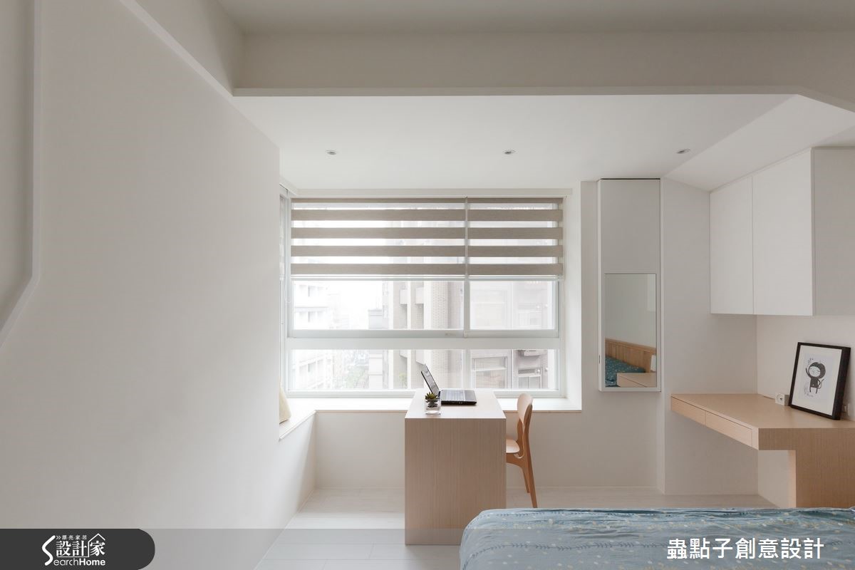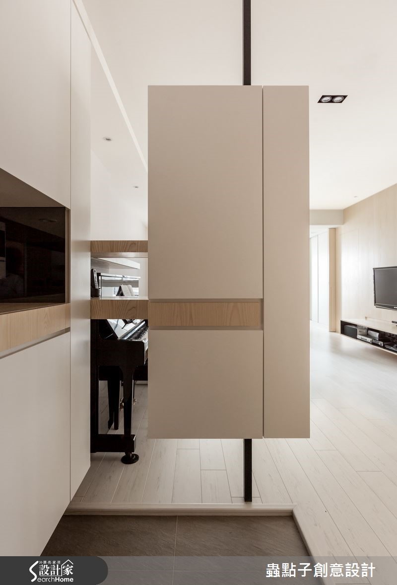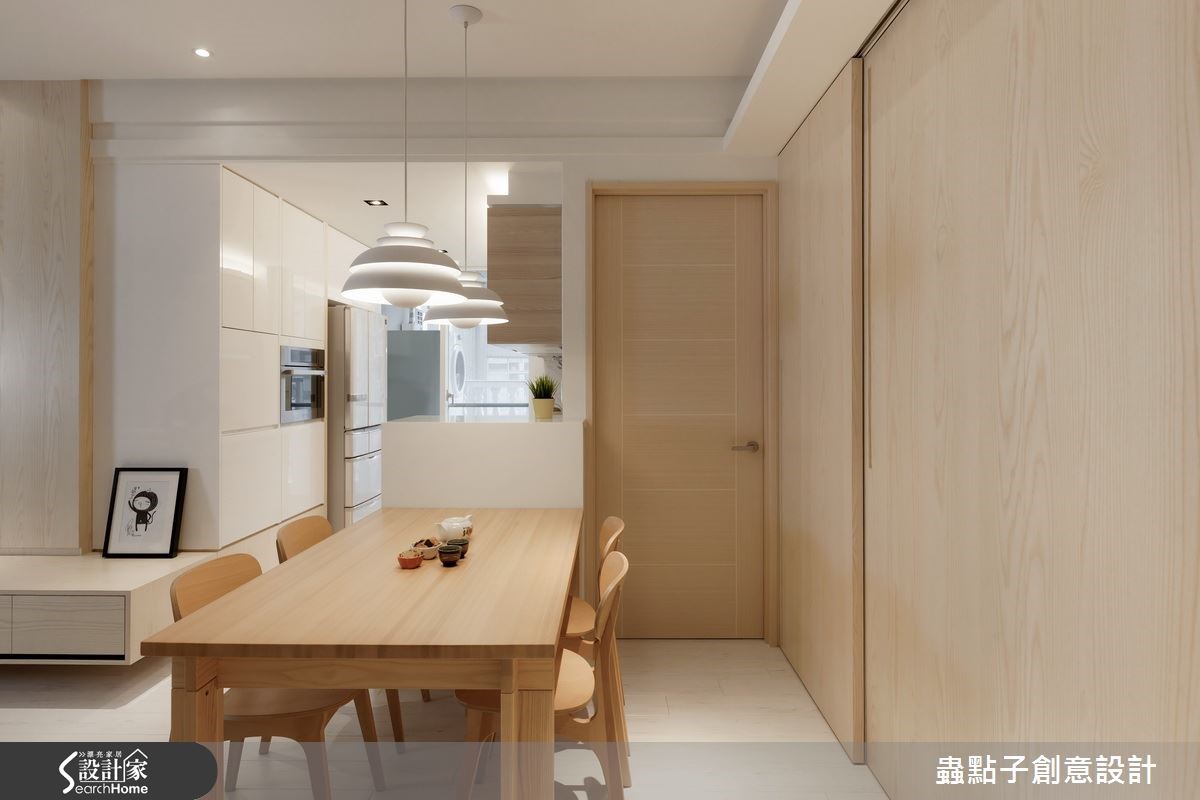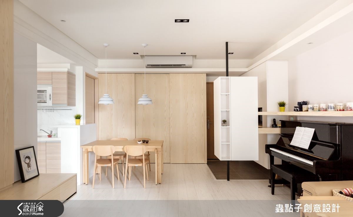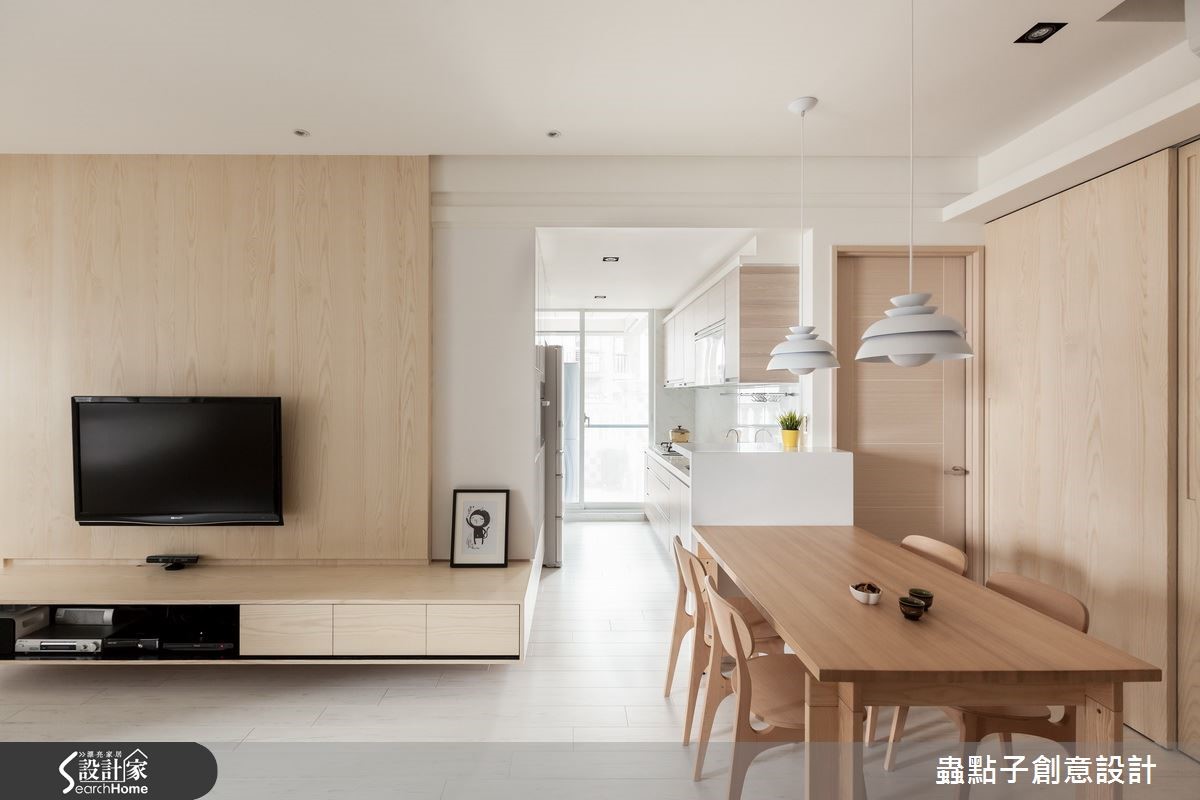 99平方米居宅,全室大量导入木皮、木作建材,并加入实用的收纳机能,以隐藏或悬吊方式规划柜体,使空间显得轻盈不压迫,打造出温暖的木质居宅,快一起走进来看看吧!【木皮与悬吊柜体,打造轻盈感】走进玄关,可见悬挑的双面柜设计,在带入机能之余,亦让玄关、公共空间可穿透连动;并在全室铺陈木质地板,营造自然简约的况味,厨房则采开放设计引进采光,缓解居宅光线不足的问题。客厅电视墙则以木作铺陈,底部规划整排视听吊柜,透过浅白木皮与不落地设计,使量体更显轻盈,尤其居宅中的各式门片或柜门,均以木材质作妆点,使生硬机能融合居家风格,展现温润亲切的氛围。主卧则注入饱满日光、纯白基底与通透材质,传递单纯的素雅质感,且利用原先窗型,规划L型窗边休憩台面,一旁则陈列简单的书桌椅,打造清爽明亮的书香小天地!