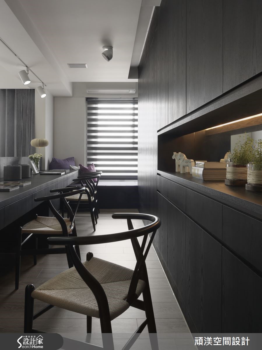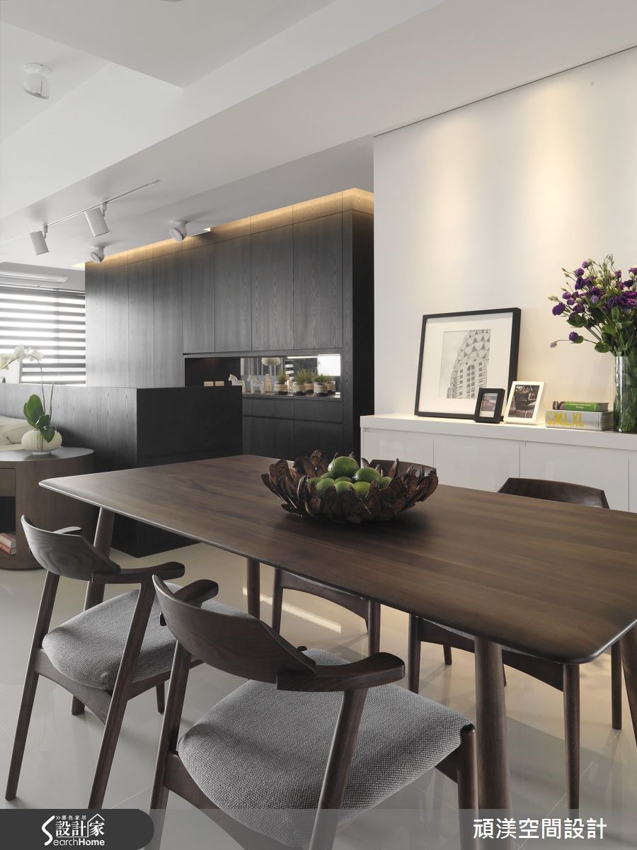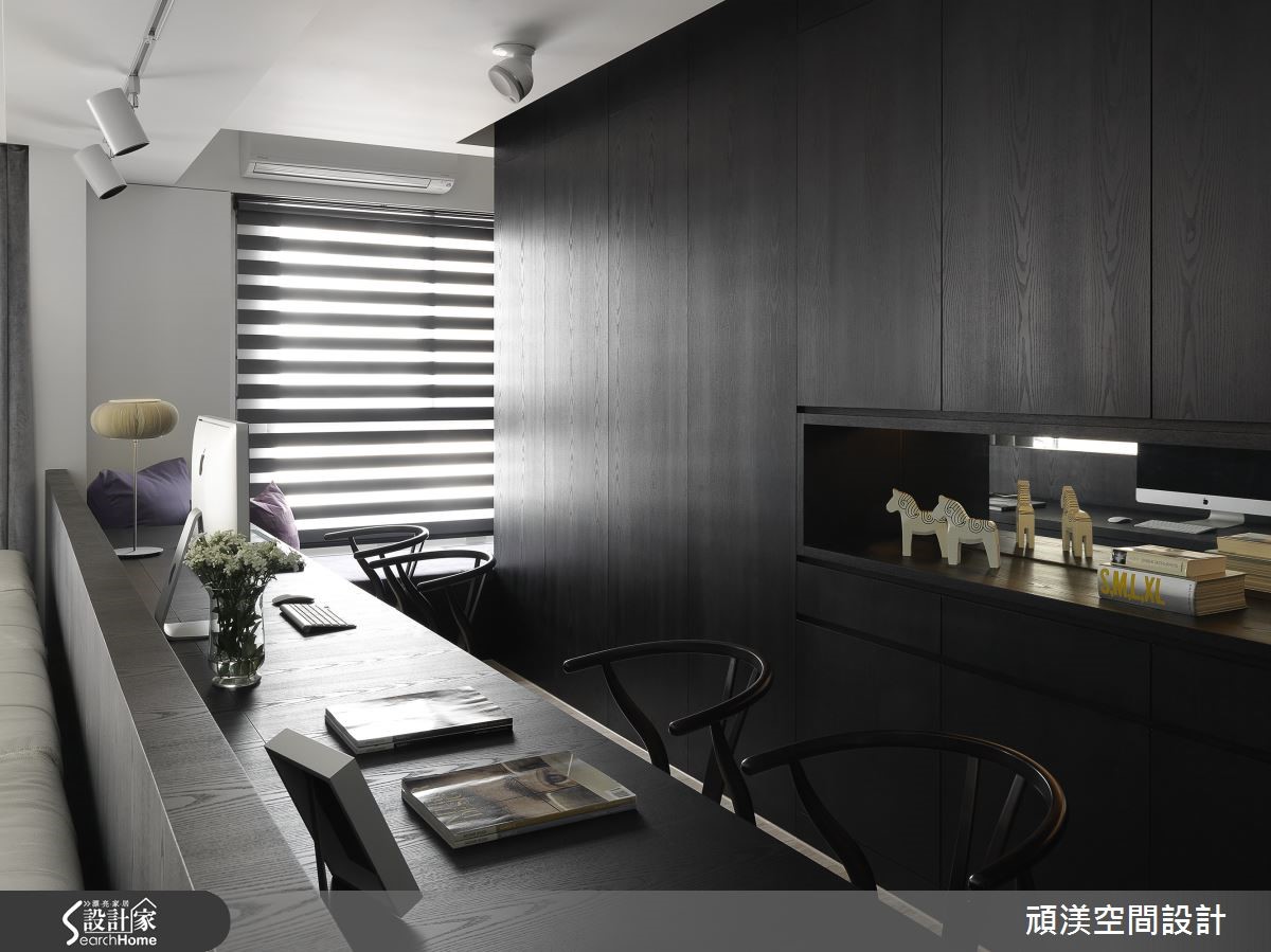 温煦阳光穿过整面落地窗,轻柔流泻在室内每个角落,随时都能沐浴在明亮而舒适的氛围。客厅、书房、餐厨以纯白底妆搭配质感温醇的深色木质调,并透过开放式手法解构格局束缚,让空间更形宽敞。 【深色木质点缀,纯白空间添沉稳】赤脚踩进客厅浅灰色绒面地毯,迎着美好的窗光。一旁的餐厨区,以实木桌椅作为空间重心,营造舒适的用餐氛围。机能完备的L型开放式厨房以纯白色调收落,形成整齐干净的视觉效果,静立在空间一隅,守候一家人的幸福时光。 书房地面铺设超耐磨地板,并利用深沉的木色调沉淀空间气质。梁柱上加设投射灯将光线聚焦,开放式的长桌可让家人同时使用,一起享受阅读的乐趣。卧室以利落的黑白色系交织,并利用木元素为室内带进温润气息。