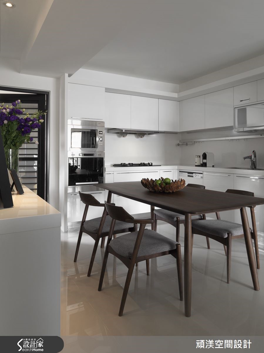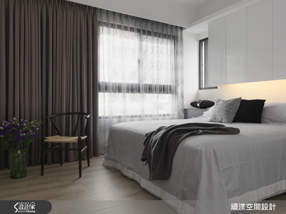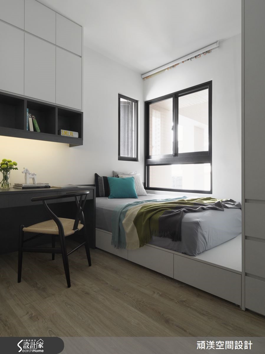 温煦阳光穿过整面落地窗,轻柔流泻在室内每个角落,随时都能沐浴在明亮而舒适的氛围。客厅、书房、餐厨以纯白底妆搭配质感温醇的深色木质调,并透过开放式手法解构格局束缚,让空间更形宽敞。 【深色木质点缀,纯白空间添沉稳】赤脚踩进客厅浅灰色绒面地毯,迎着美好的窗光。一旁的餐厨区,以实木桌椅作为空间重心,营造舒适的用餐氛围。机能完备的L型开放式厨房以纯白色调收落,形成整齐干净的视觉效果,静立在空间一隅,守候一家人的幸福时光。 书房地面铺设超耐磨地板,并利用深沉的木色调沉淀空间气质。梁柱上加设投射灯将光线聚焦,开放式的长桌可让家人同时使用,一起享受阅读的乐趣。卧室以利落的黑白色系交织,并利用木元素为室内带进温润气息。