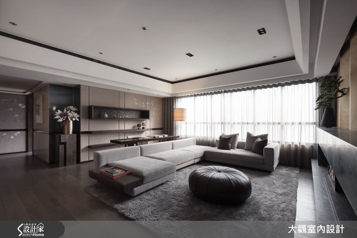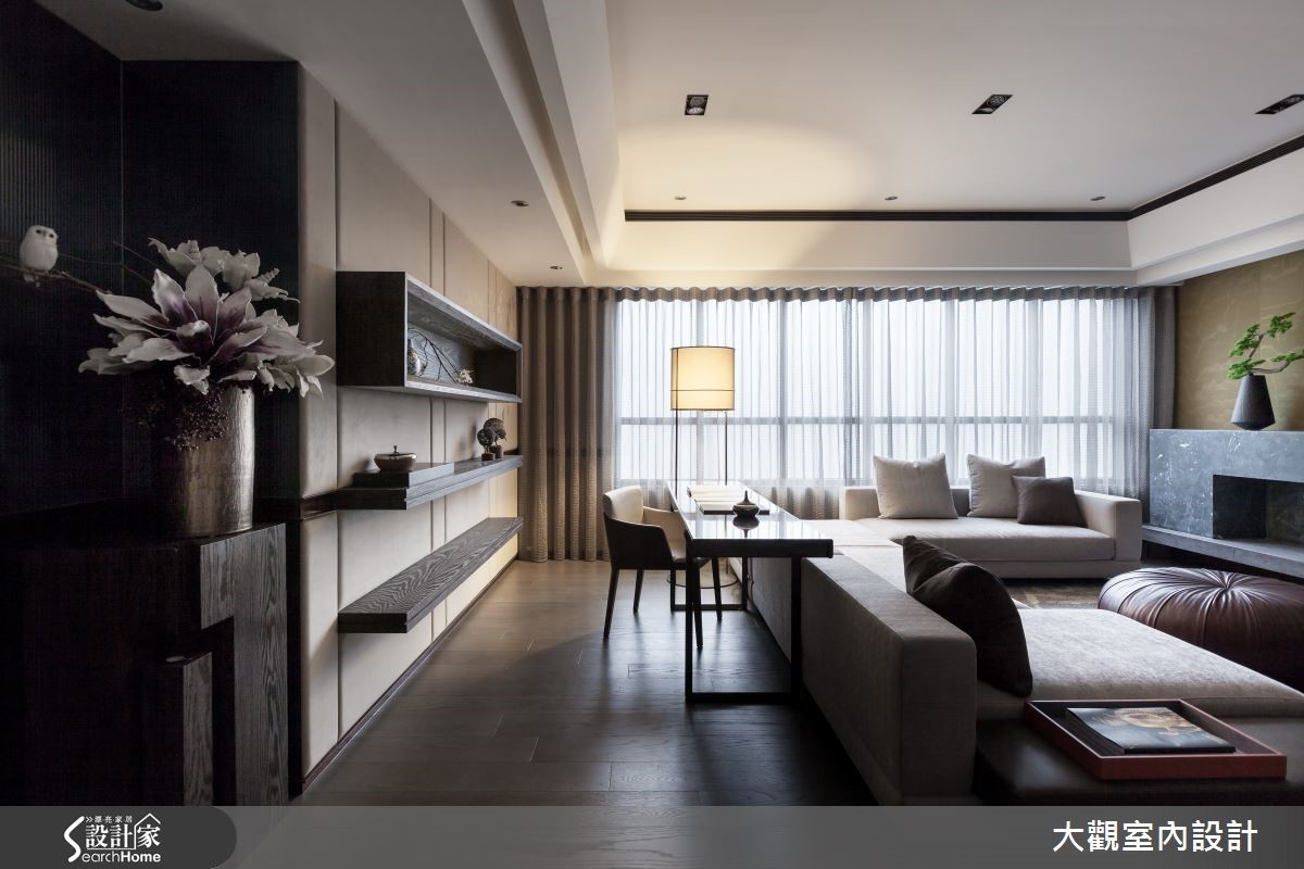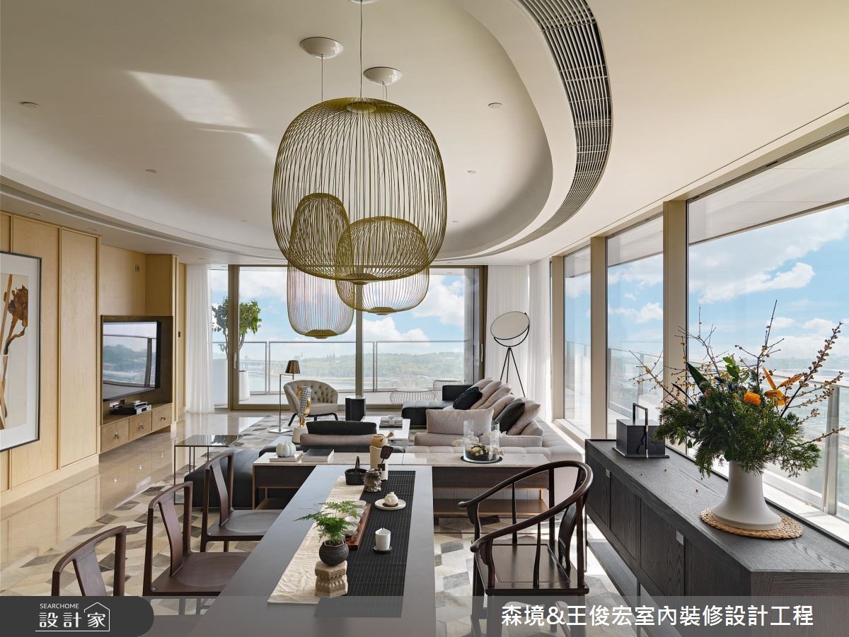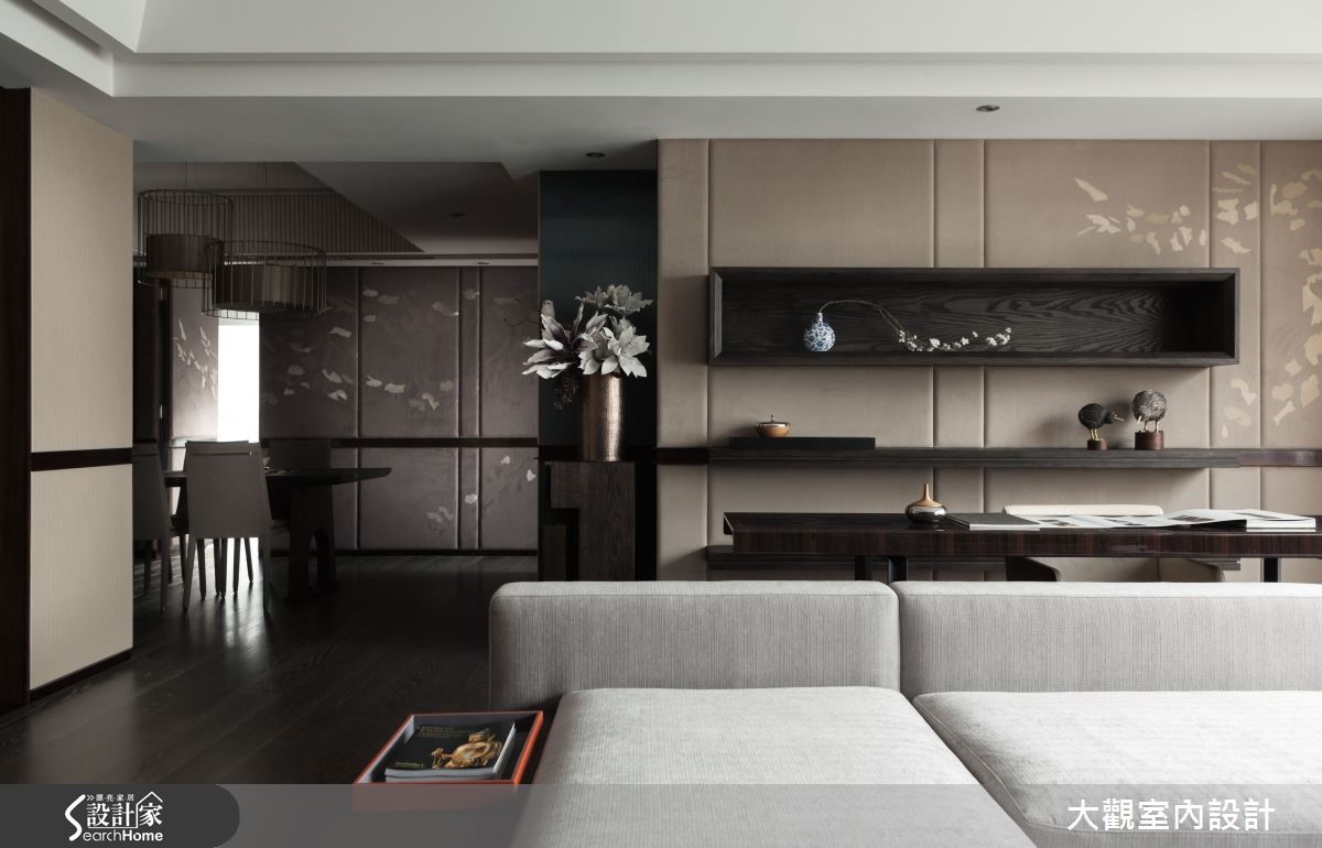 开放式的空间以视觉自然引领动线,客厅、书房、餐厅依序可见。且以褐色调铺陈静谧的质感,以简约线条勾勒雅致的东方气息。宽敞开阔的室内全面铺设超耐磨地板,保留自然木纹肌理,调和悠然深远的氛围。 【轻奢石材和绷布,造高雅意境】日光从透明纱帘透入室内,在绷布墙上淡抹光晕;另一墙面则以古朴的松绿色石材,沉淀宁静悠远的意境。沙发后方的阅读空间,背墙镶嵌乌木色泽的展示收纳,置入青花瓷器相当雅致。从阅读区步入餐厅,夹角空间嵌入锦簇的花盏,成为两者间的过渡区,高低错落的古铜色吊灯结合铁件,点亮用餐氛围。主卧和次卧延续醇厚的褐色调性,并以大面窗户揽入采光,搭配温润质感的木元素,营造卧室沉稳舒适的气质。此外,设计师结合穿透性高的玻璃门片和铁件,以展示手法设计衣物收纳空间,不仅美观也非常实用。