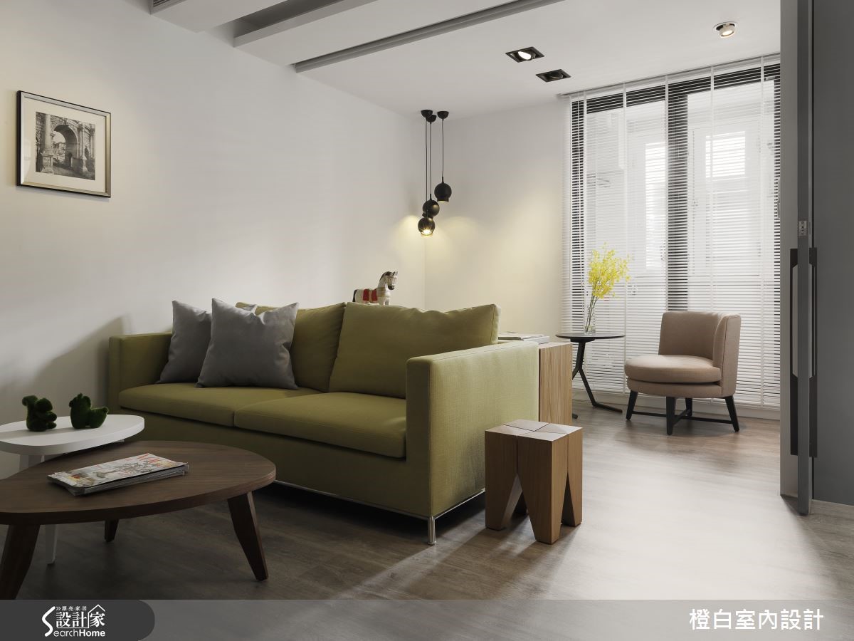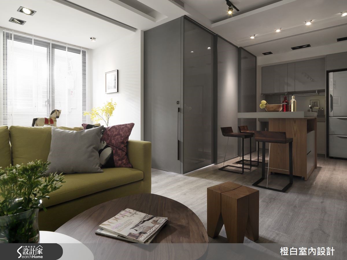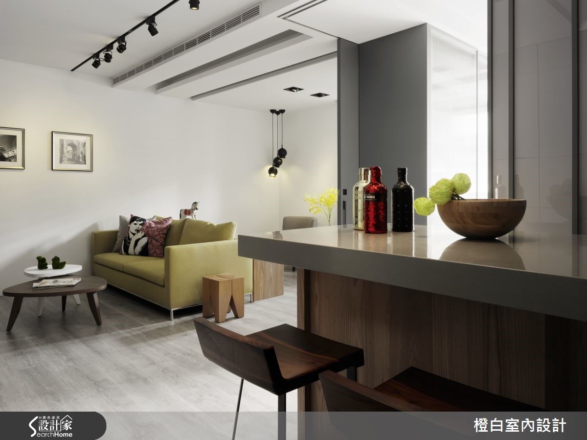 对于43平方米老屋,屋主希望拥有蕴含质感、舒适简约的居所,设计师除了以酒店风格满足屋主想望,更破除了原先老屋的不良采光,让日光悠然倾泻,进入专属2人的个性生活。 【移动吧台,餐厨不狭窄】拿捏空间比例划分出客厅、餐厨与卧房的分野,让全然铺陈木质地板的家中,具有独立性又不失通透感。白净的客厅墙上悬挂简约相框,打上聚光灯营造艺廊质感;搭配草绿沙发与深浅不一的边桌,让视觉浸润在清爽闲适的氛围。客厅金属电视墙面提升轻奢感,佐以轨道照明,展现高雅气息。天花做吊顶隐藏空调,并区隔客厅与后方阅读空间。精致的吸顶灯散发柔和光芒,搭配窗外和煦阳光与绿意,在定制木质写字台上静静书写快意人生。开放餐厨运用可移动的吧台餐桌与高脚椅,让动线更加多维,且屏除了空间的局促性。内嵌式投射灯让浅色收纳墙更显利落,搭配纯白一字型厨房,营造时尚气息。灰色门片兼具了私密与明亮性,色调清雅的卧房内有飘窗更显闲适,卫浴收纳柜以木石材质展现酒店般质感。