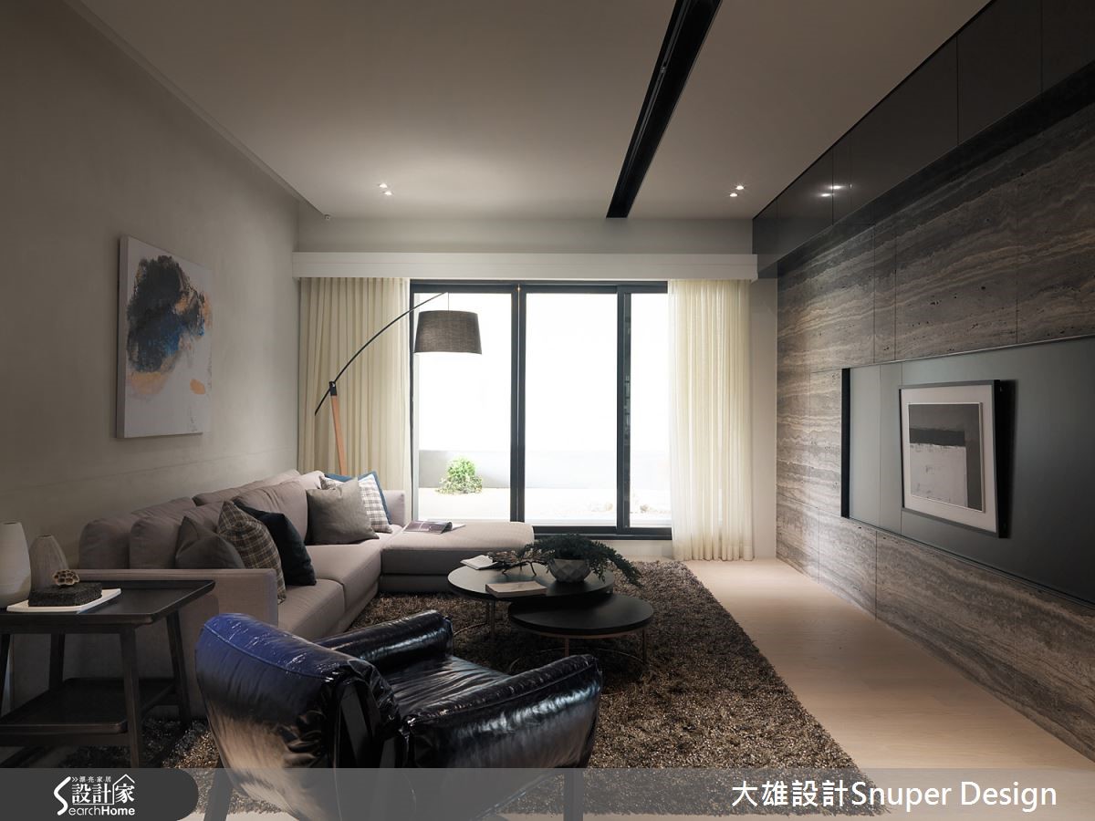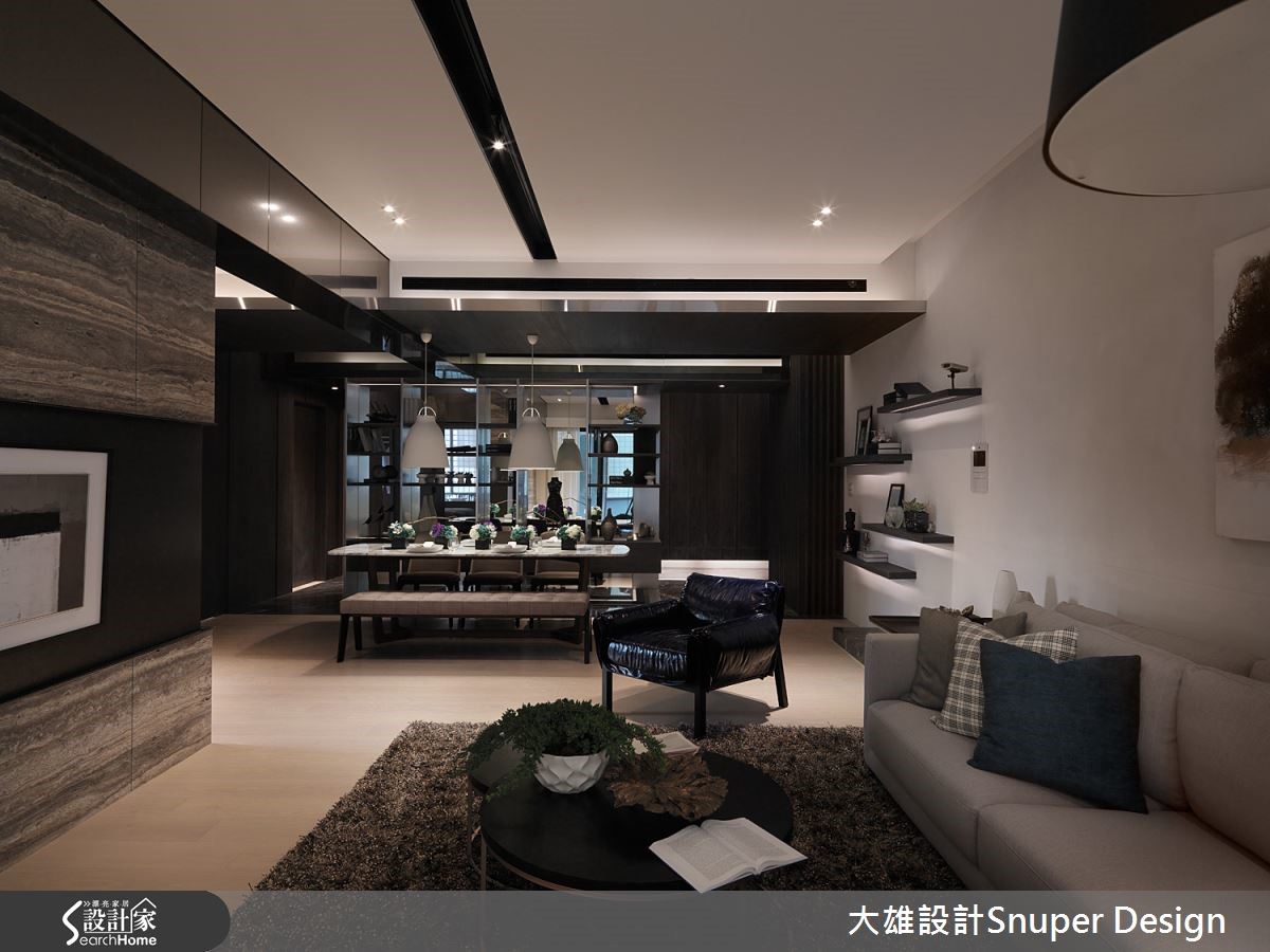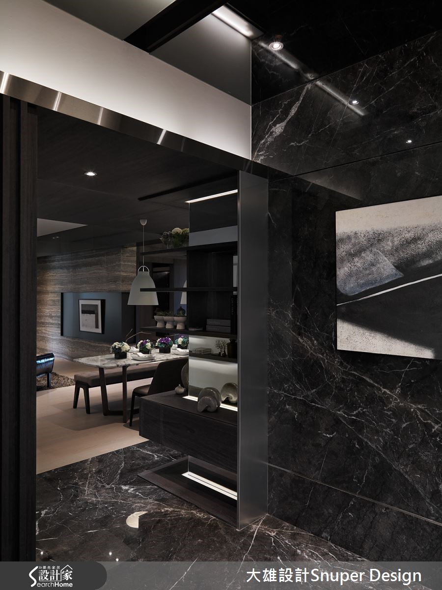 此现代宅,以深邃黑作为主体基调,融入木质的暖色触感,以及金属的冷冽透亮,平衡空间中的冷暖调性。在设计师的巧思之下,148平方米也能彰显大宅质感,演绎平凡起居中的雍容华贵! 【黑色大理石与格栅,创造和谐感】走进玄关,可见整面黑色大理石主墙营造富丽堂皇的气场,同时也加入格栅元素,共构和谐的线条感,并从转角起始,以金属、深色木作、镜面等组构大片展示墙,用以陈列屋主收藏品,营造人文雅致的居家品味。【镀钛与木作,打造大器风范】天花板则以镀钛、木作佐以利落的黑线灯沟交错,赋予利落的线条之美,让空间更具层次变化,而客厅电视墙采用了充满艺术纹彩的石材打造,并细腻可见表层天然孔洞,表现淋漓尽致的大器风范。【木质为基调,打造静心书房】来到书房场域,可感受到温润宜人的木质色调,且在柜身内嵌镜面线条,让木柜多了几分细腻精致,且配置木百叶与加大的卧榻座席,赋予窗下一处带有禅风感的静心场域。 卧房内注入了新颖却内敛的设计,以茶镜建构床头主墙,藉由镜面映照灯光,呈现雅致的情境氛围,墙面中则以精致工法做出柔软绷布,让冷暖、刚柔相互交织,呈现华美却融洽的气息!