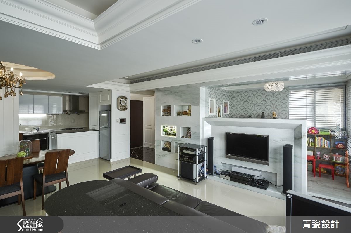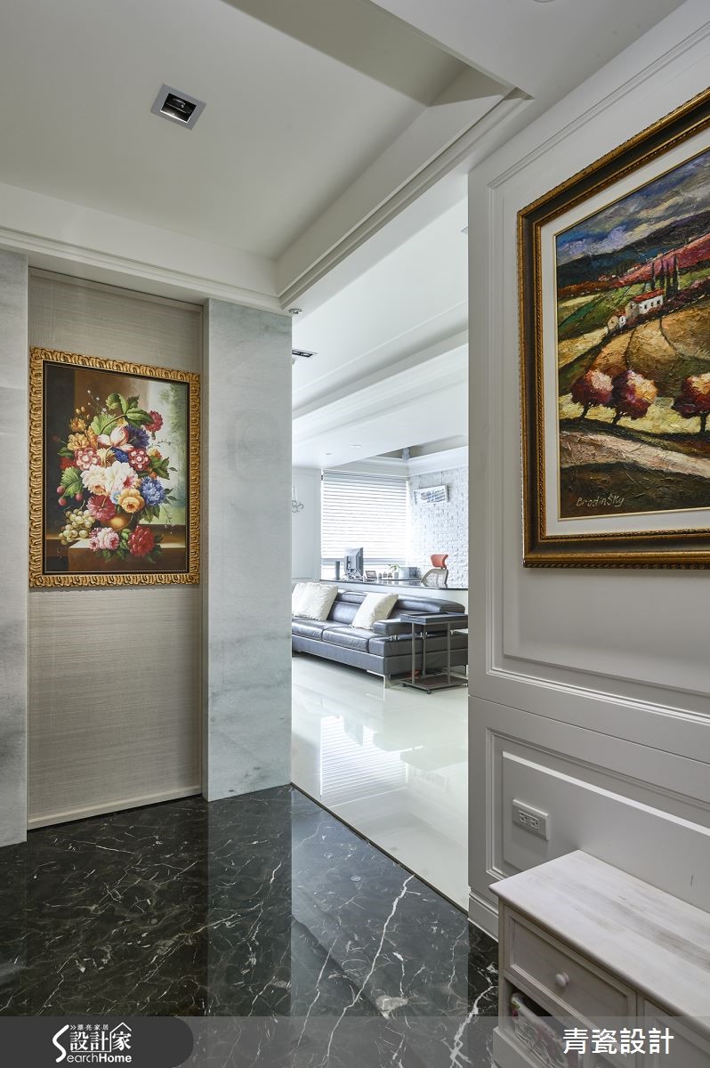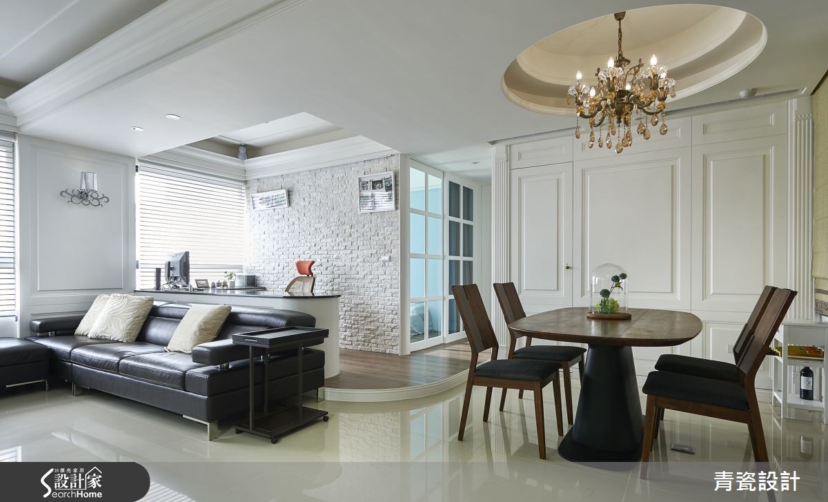 由于男主人有过装修经验,原本打算自己设计居所,但爱太太的屋主,考虑到学音乐的女主人。因此请来设计师,以太太钟爱的优雅美式风和华丽新古典交织,为一家三口打造幸福居所。【玉石铺陈电视墙,吸人眼球】铺设黑白根大理石的独立玄关,一开始即为进门的客人演奏优美的前奏曲。玄黑色石面地板浮现缕缕细致银丝,并在结合古典线板的墙面,挂上俄国艺术家 Brodinsky的画作,屋主的文艺气质不言而喻。设计师依照玄关的宽度,向内延伸储藏室和女屋主的琴房;另一边则为一家人主要的生活空间。客厅、餐厅、书房以开放设计串连,带来更开阔的视野。选用冰晶玉石铺陈电视墙,澄澈雪白的结晶闪耀着内敛光芒,并结合局部玻璃设计,将明亮采光引入琴房。客厅旁的圆顶灯座内以一盏古典水晶吊灯聚焦用餐区,与典雅的线板合奏华丽磅礡的主乐章。设计师将书房地面挪升,与定制的L型长桌界定出阅读区领域,宽阔而开放的空间,也能满足屋主的工作需求。