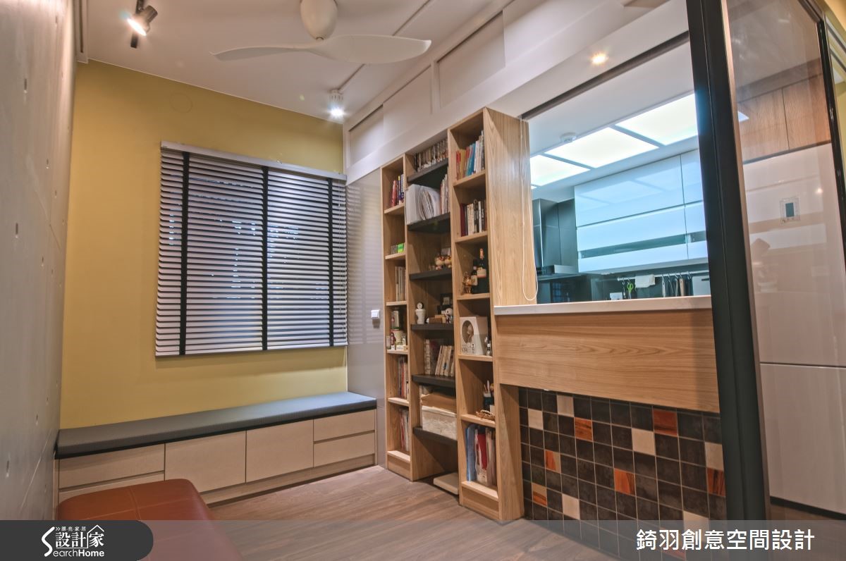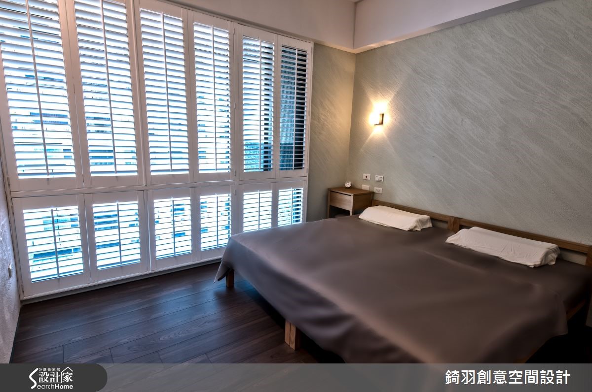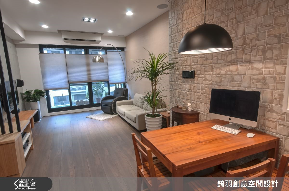 在有限成本之下,设计师舍弃繁复的装饰性设计,把预算花在建材上,于住宅内加入优质环保素材,打造舒适的生活环境,且以柜体取代墙面,扩充收纳,打造高机能的小户型。【清水模、硅藻泥,维持清新质感】整体格局方正,墙面以简洁干净的表情呈现,运用仿清水模、硅藻泥等铺陈客厅墙面,搭配木作板材注入收纳机能,展现温润清爽的气氛。且透过不同的材质界定餐厅,将粗犷墙面搭配温润木桌椅,再悬吊金属色罩灯,使餐厅多了几分静谧的人文气质。此外,拆除厨房、阅读室之间的隔断,改配置柜体做出半开放式设计,并让隔断发挥收纳机能,并配置灰玻拉门做出与厅区之间的隔绝,适度作出空间划分,但同时保有通透空间感。阅读室内则延续仿清水模材质,增加柜体及飘窗,创造丰富的生活机能。