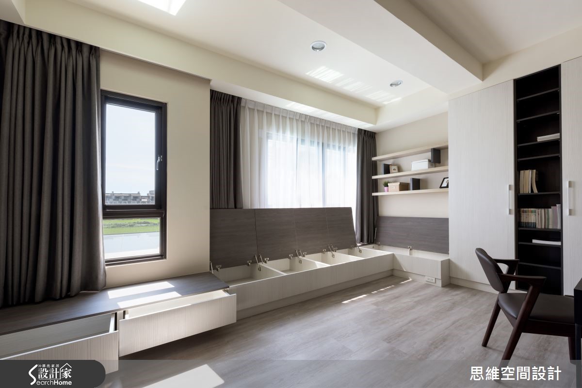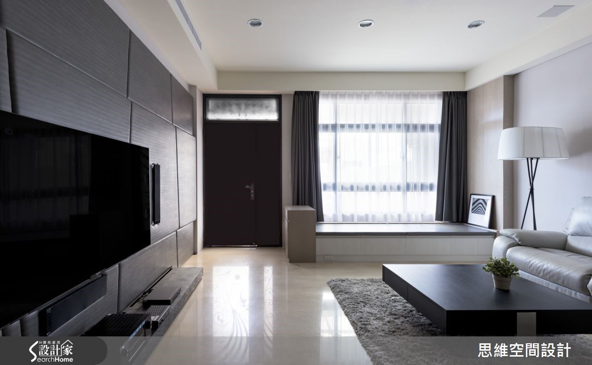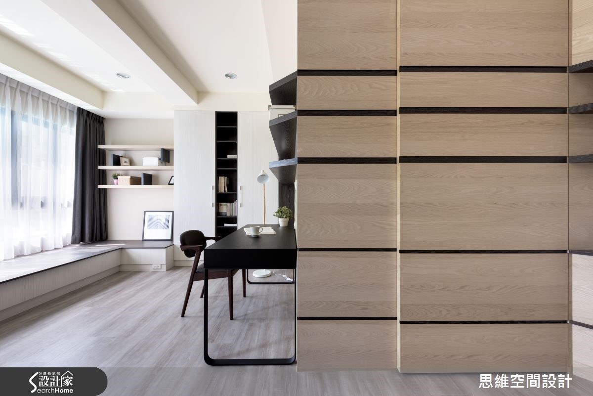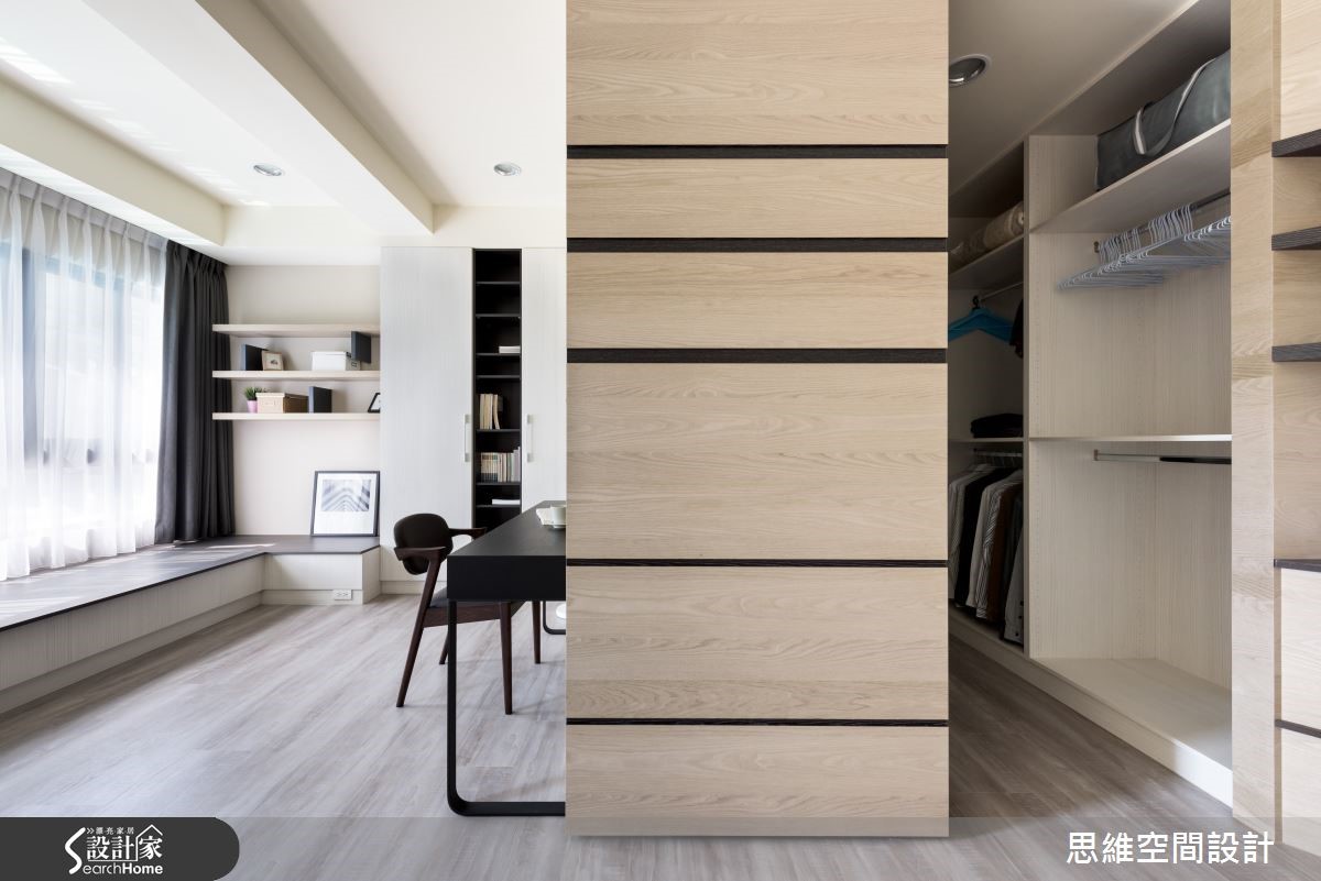 165平方米独栋楼,是一对喜欢旅游的新婚夫妻居所,设计师运用空间的采光优势,并且结合设计美感,在屋内设置大量隐藏式收纳。此外,也因应未来家中可能有小孩出生,细心为屋主预先规划家中新成员的生活空间。 【隐藏式收纳,结合设计美感】有著三层楼的独栋空间,一楼和二楼设定为客厅和主卧,其它空间则作为客房及小孩出生后的弹性使用。走进客厅,大面积窗户涌入充沛的自然光,地面则以轻浅的温润色泽承接屋主夫妻俩的幸福日常。铁灰色裱布在电视墙上刻划直爽线条,带来利落的时尚个性。设计师并利用完美采光的优势,在窗边延伸出一方飘窗。可阅读、可小睡,与朋友家人聚会时,也能提供客人充足的座位。 二楼是屋主的主要起居空间,采光较好的房间作为书房使用,迎接自然光源的飘窗下方藏着大量收纳。拉开书桌旁的活动式门板,后方更隐藏了一间偌大的更衣室,开放式收纳让所有衣物一目了然,更方便拿取。