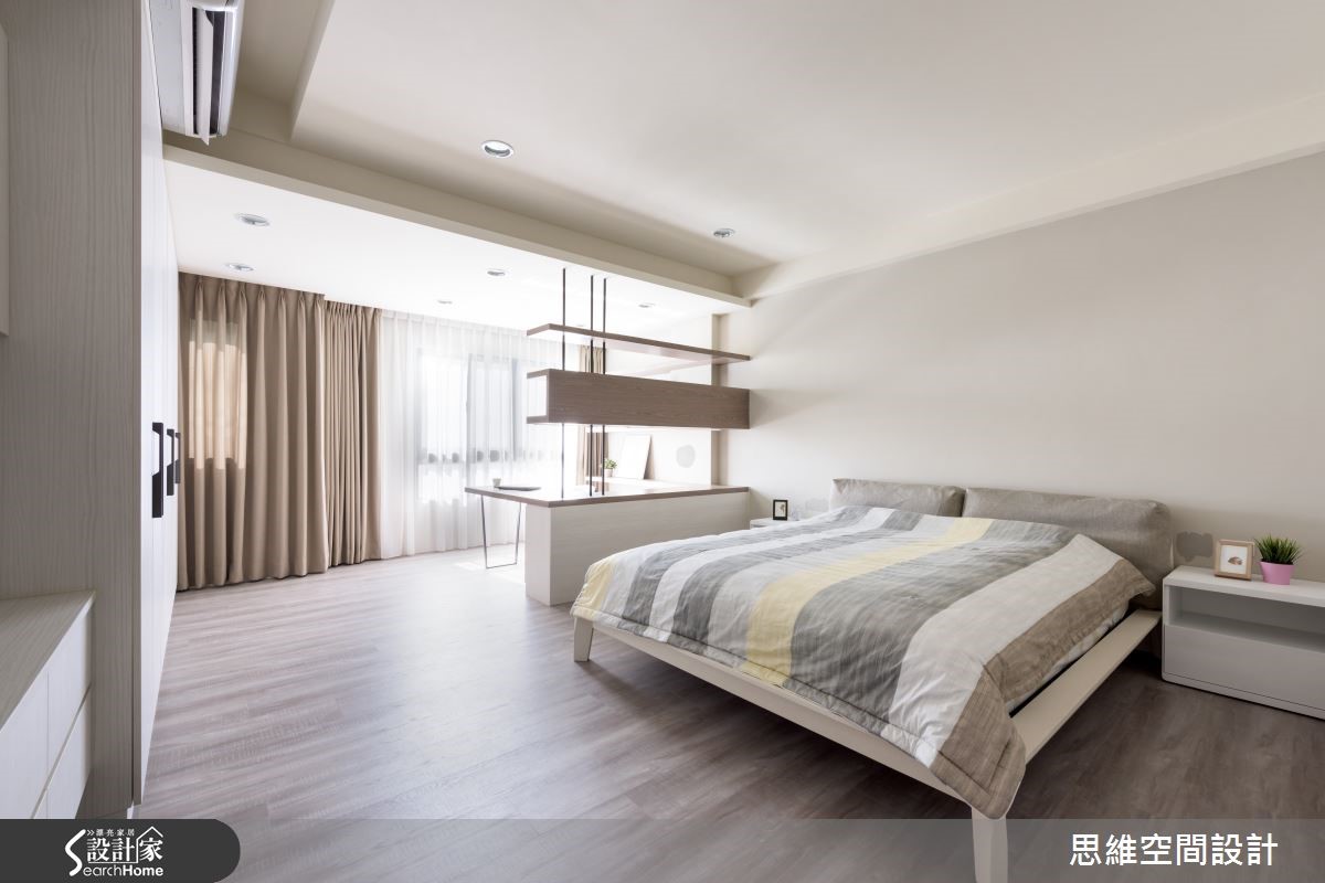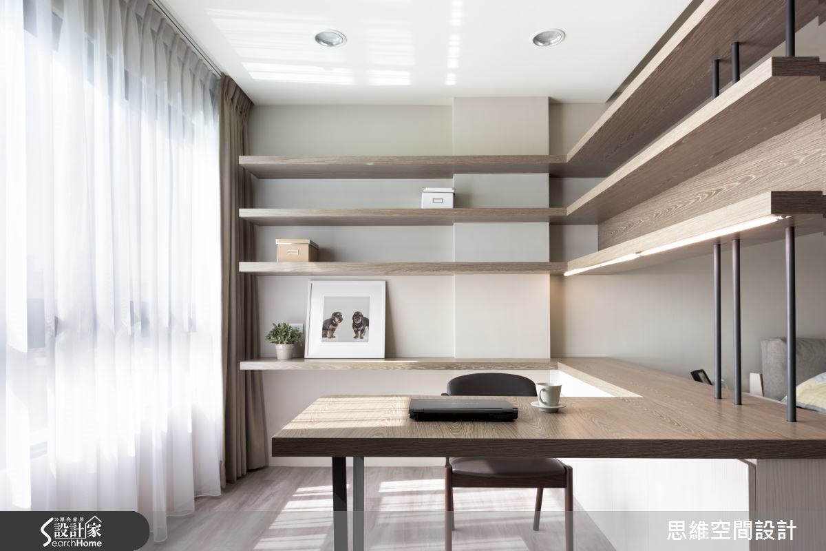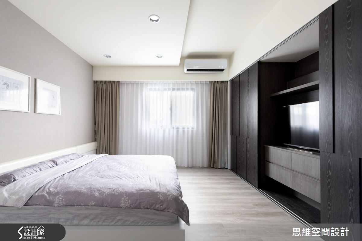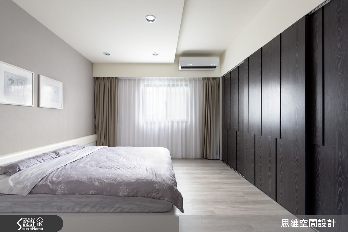 165平方米独栋楼,是一对喜欢旅游的新婚夫妻居所,设计师运用空间的采光优势,并且结合设计美感,在屋内设置大量隐藏式收纳。此外,也因应未来家中可能有小孩出生,细心为屋主预先规划家中新成员的生活空间。 【隐藏式收纳,结合设计美感】有著三层楼的独栋空间,一楼和二楼设定为客厅和主卧,其它空间则作为客房及小孩出生后的弹性使用。走进客厅,大面积窗户涌入充沛的自然光,地面则以轻浅的温润色泽承接屋主夫妻俩的幸福日常。铁灰色裱布在电视墙上刻划直爽线条,带来利落的时尚个性。设计师并利用完美采光的优势,在窗边延伸出一方飘窗。可阅读、可小睡,与朋友家人聚会时,也能提供客人充足的座位。 二楼是屋主的主要起居空间,采光较好的房间作为书房使用,迎接自然光源的飘窗下方藏着大量收纳。拉开书桌旁的活动式门板,后方更隐藏了一间偌大的更衣室,开放式收纳让所有衣物一目了然,更方便拿取。
