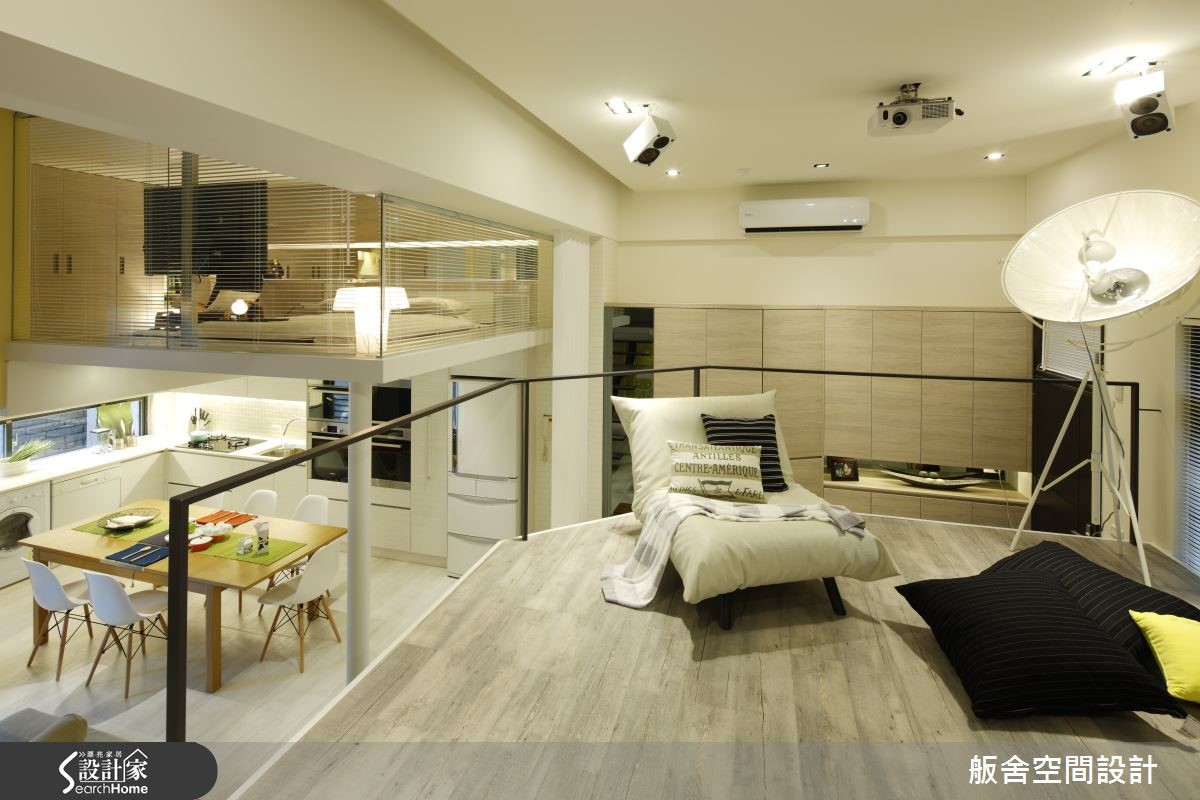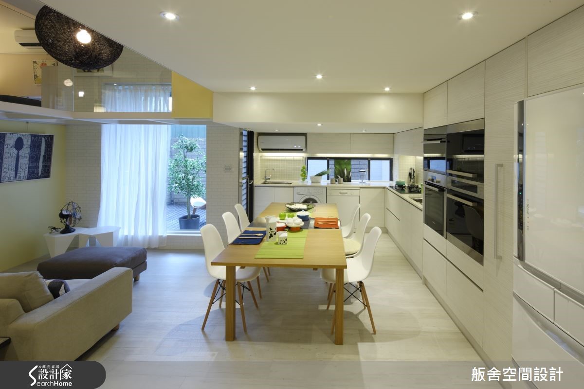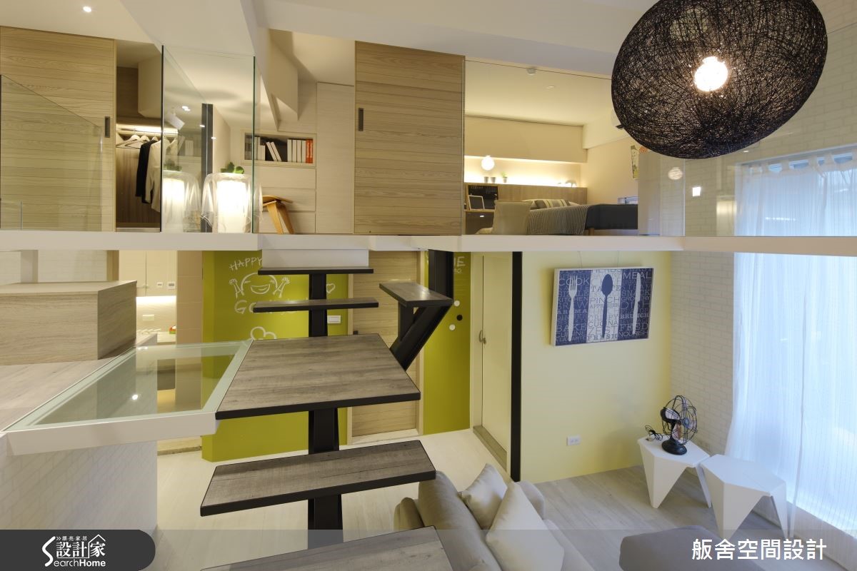 含后庭院共计165平米的空间是屋主与孩子的共同居所,设计师以木纹地板替室内营造自然暖意,并加入铁件与玻璃素材,让环境更具质感与明亮的通透性。【扰人大梁,化作空间无形分界】屋内本身采光良好,唯一美中不足的即是位在中央的大横梁,但设计师将危机化为转机,藉由跃层设计,使屋内的活动范围与空间感获得缓解,将楼梯兵分两路,让屋主能各自依循动线进入起居室,并以玻璃材质达到明亮的通透性,让视野更加宽阔明亮。为了满足居住者对于收纳的需求,设计师规划了许多储物柜与展示层架,且考虑到屋主本身相当喜欢创意手作,特别设置了一面亮绿色的黑板漆涂鸦墙,在此恣意地发挥创意或随意涂鸦都不是问题。