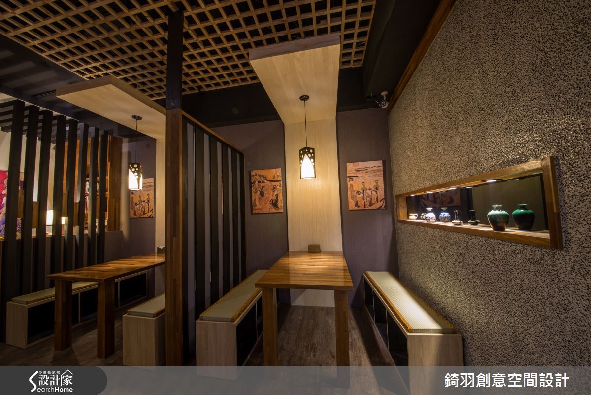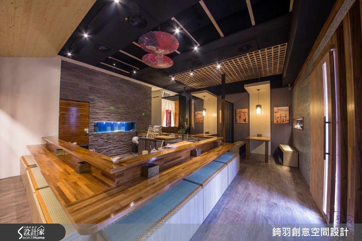 这间原为美发店的老屋,经过设计师的细心改造,变身为日式禅风的料理店。与店内料理一样精美的设计,表现出屋主对于顾客的心意,在料理互动间传达真挚的友善。【料理区居中,拉近用餐距离】入口处给予丰富的视觉,沉稳的梧桐木皮大门,结合柚木墙面与抿石子,搭配描金黑底招牌与铁件格状窗框,注入雅致风情。仿日式传统屋簷的照明手法,为木皮墙面增添温润质感,搭配木质格栅,营造冲突美感。进入室内,则是以料理为中心的空间,屋主希望料理空间与顾客产生高度互动。榻榻米长椅围绕方型料理台面,加上两支缤纷纸伞自木梁间垂坠,除了拉长视觉高度外,更有惊喜巧思。后方石墙镶嵌著海鲜水槽,兼具了新鲜食材与视觉表现。左侧装设灰镜的展示柜呈放着日式器皿与饰品,突显屋主品味。右侧用餐区天花则以木质格栅分隔座位,木质墙面向天花延伸,形成L型造型,凸显焦点更增添空间层次感。