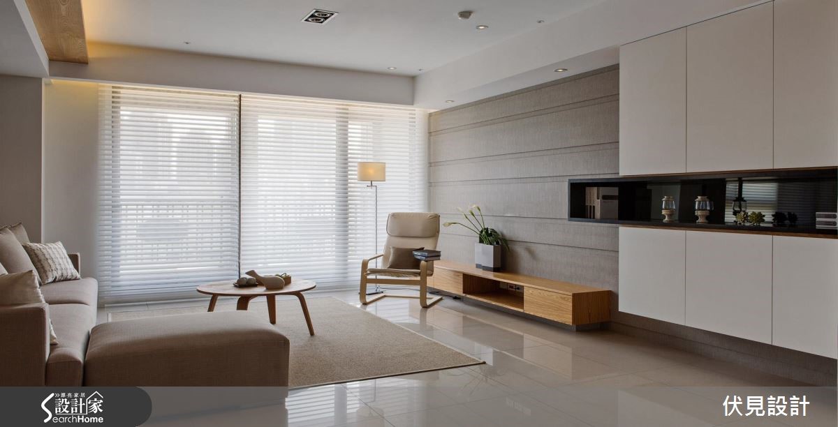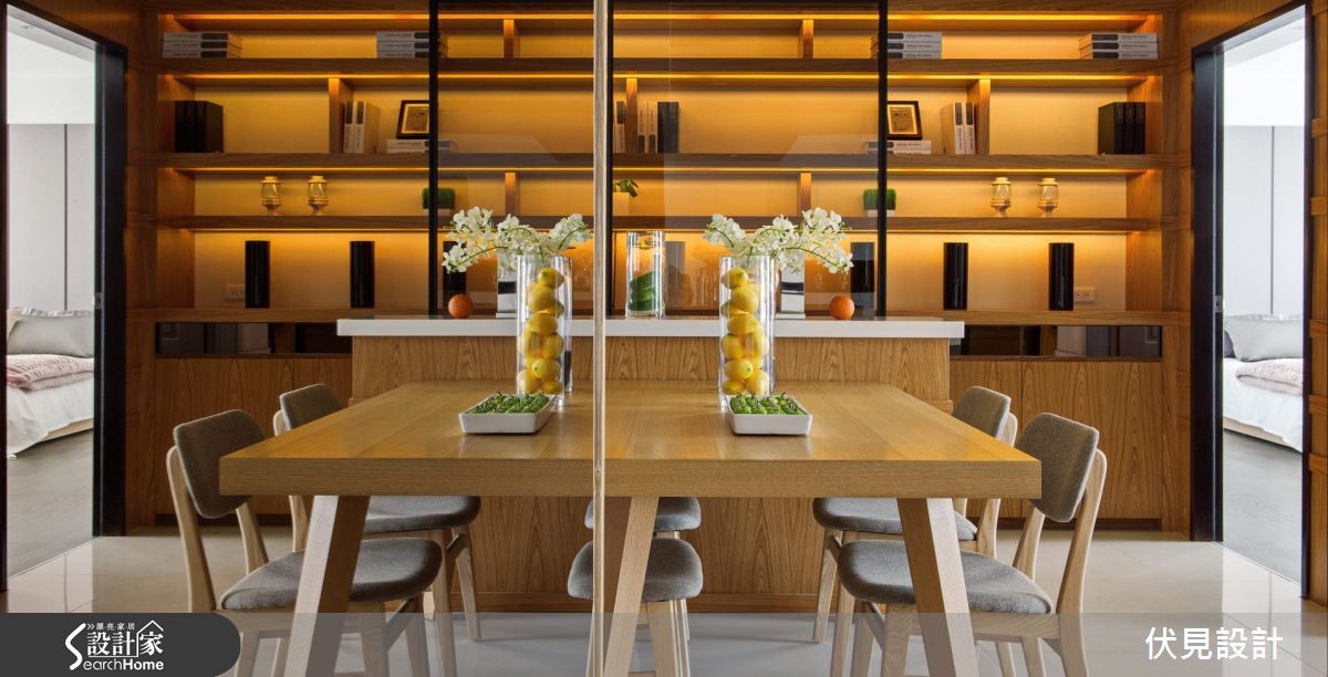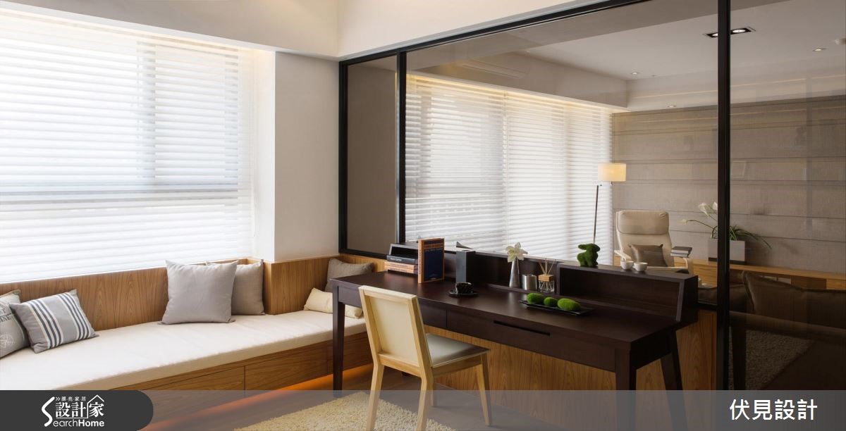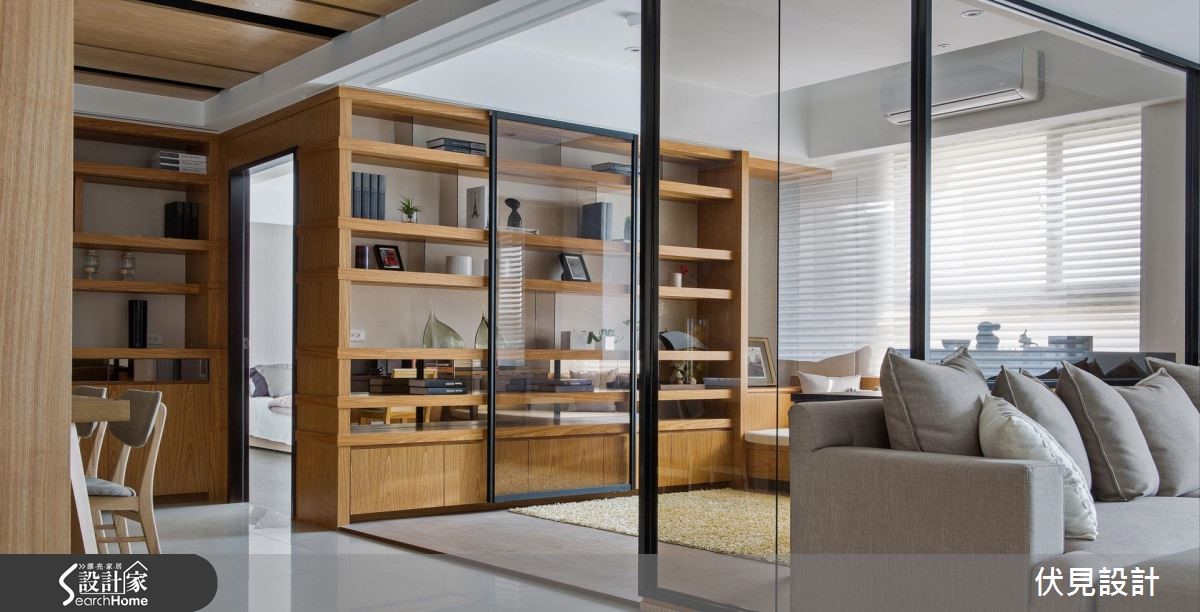 如果觉得家里过于冷调,在进行装修时,不如使用带来温润感的木元素,为家里带来一些暖意吧!在屋中天花、梁柱、收纳柜体,设计师皆以温和润泽的木材质包覆,运用栓木的自然纹理,温柔化解空间中冷硬的框架线条。【玻璃取代实墙隔断,扩容空间】设计师在玄关旁的柜体壁面加入茶镜,以镜面的反射效果延伸空间深度。采光良好的室内则利用开放式设计,将客厅、餐厅、书房收入同一视觉平面,让自然光能自由引入,不受格局的拘束。客厅主墙面嵌入长型的展示收纳,横越在白色柜体及灰色墙面之间,成为连结两者的平衡。取代实墙设计,结合铁件和茶玻的玻璃墙,分割出客厅与书房界线。玻璃的穿透性带来开阔视感,同时也能保留书房的独立性。拥有明亮采光的书房,在窗前留下一方飘窗,舒适的软垫与抱枕,与日光构成一悠闲的阅读角落。座落于书房旁的用餐区,天花则利用木材质做出造型,并在板材的疏密间投射灯光,长方形的天花框起温馨的用餐时光。