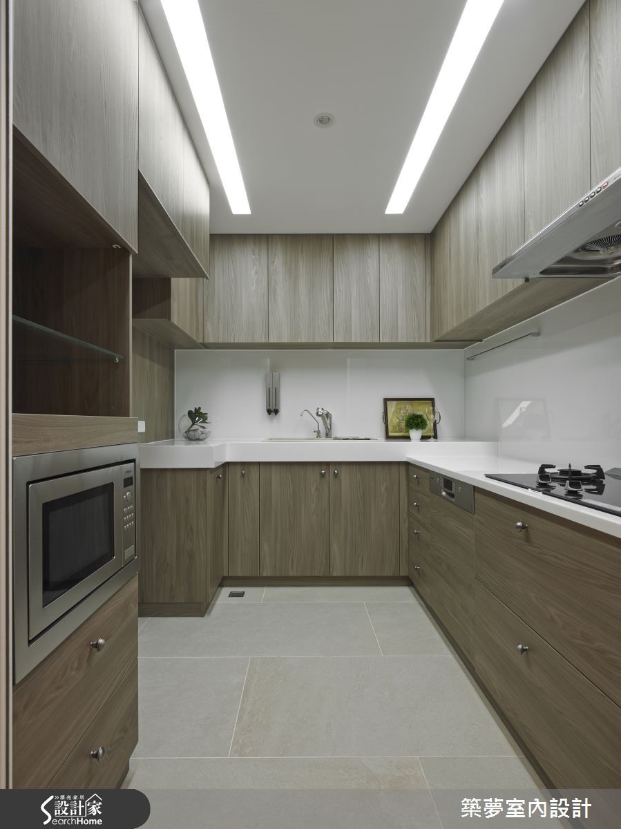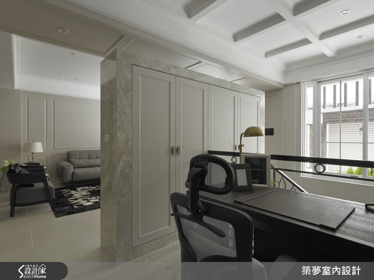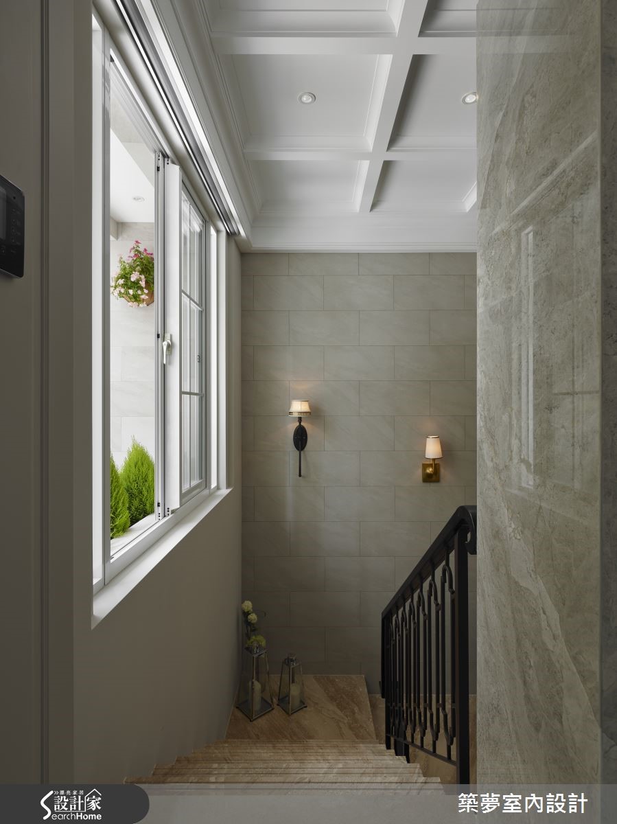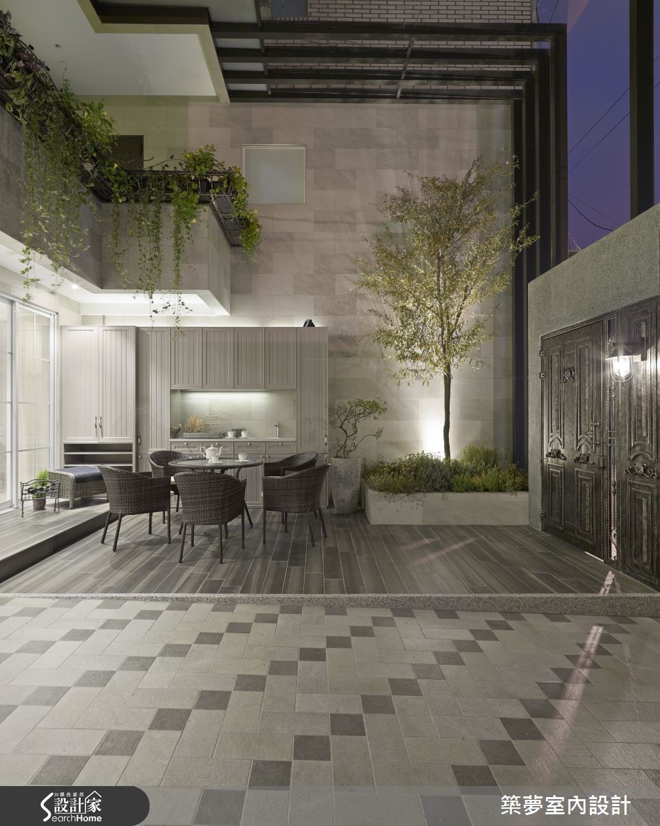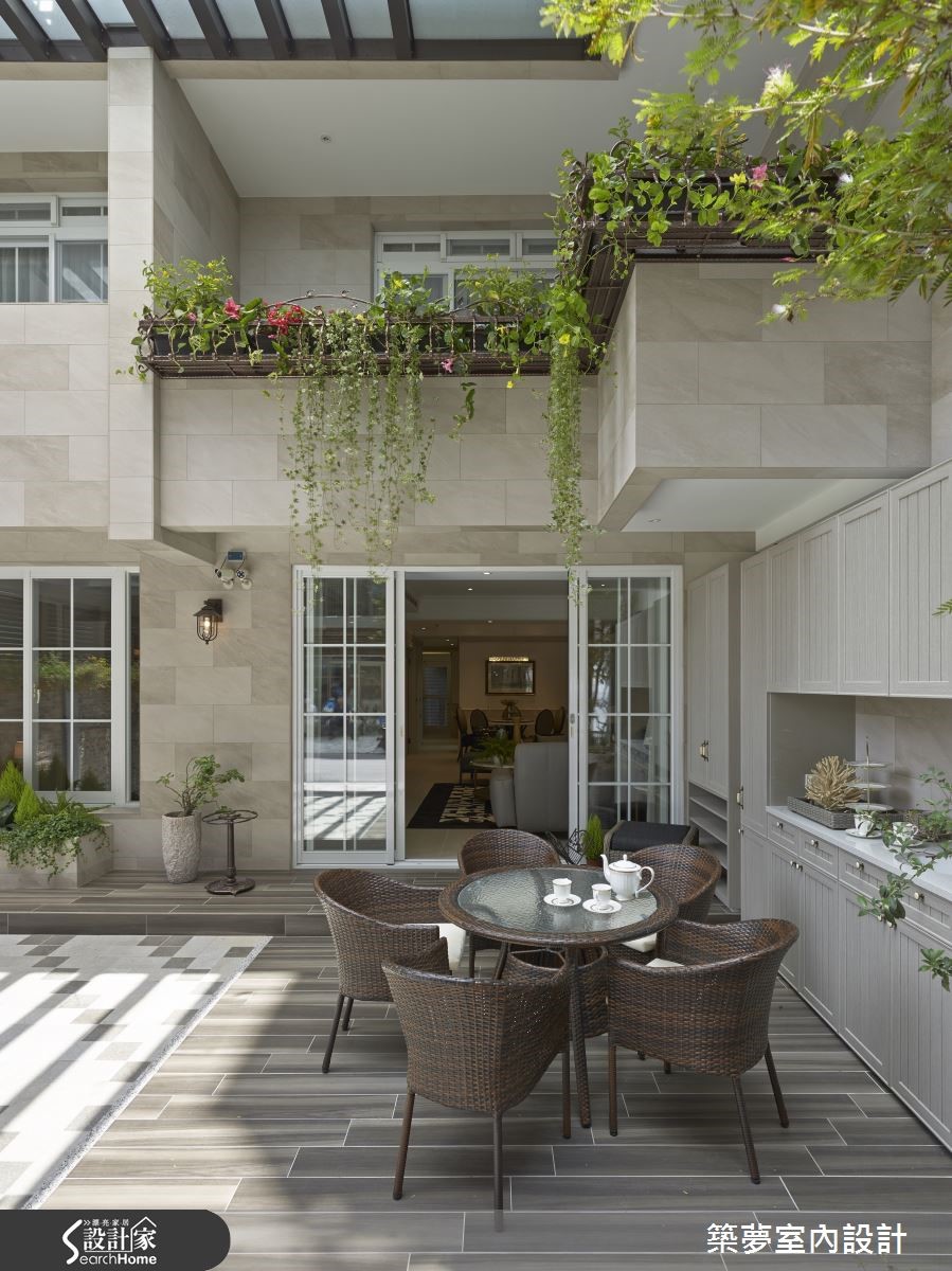 坐拥3层楼的264平方米别墅,虽具宽敞优势与挑高设计,多年来却因为屋形狭长饱受全室阴暗、地下室漏水潮湿与壁癌等严重问题;分析既有优劣势后,设计师一面听取屋主需求,更解决整体房屋结构问题,送给屋主全室洒满阳光的典丽新家。【通透采光罩,享受自然日光空间】设计师重新将内部格局划分为前段庭院、中段客厅与后段卧室三大区块,以中间廊道串连各区域,更以半开放的透明玻璃与风琴帘导入通透感,成功破除狭长屋型劣势,创造宽敞舒适感;并以采光罩打造挑高庭园,使其不受天气因素影响,引入日光的同时还可享受宽敞空间。【大量藤类植物,打造清凉庭院】庭院布置也别出心裁,以防水木纹建材铺叙地面,种植大量藤类植物形成清凉庇荫,并于下方摆放雅致桌椅,墙面更设置乡村感线板造型收纳柜,搭配复古嵌灯,烘托豪宅门面气势。【大理石墙,兼具收纳与隔断功能】挑高的开放式空间内以板岩与钢材为基底,包含了客、餐厅与书房,整面大理石电视墙成为设计亮点。墙面后方为满足男主人的阅读乐趣打造开放书房,更可同时兼顾妻小动态,墙面更结合大面积格柜,富含收纳机能,身处书桌更可直接目视庭园绿意、享受自然。
