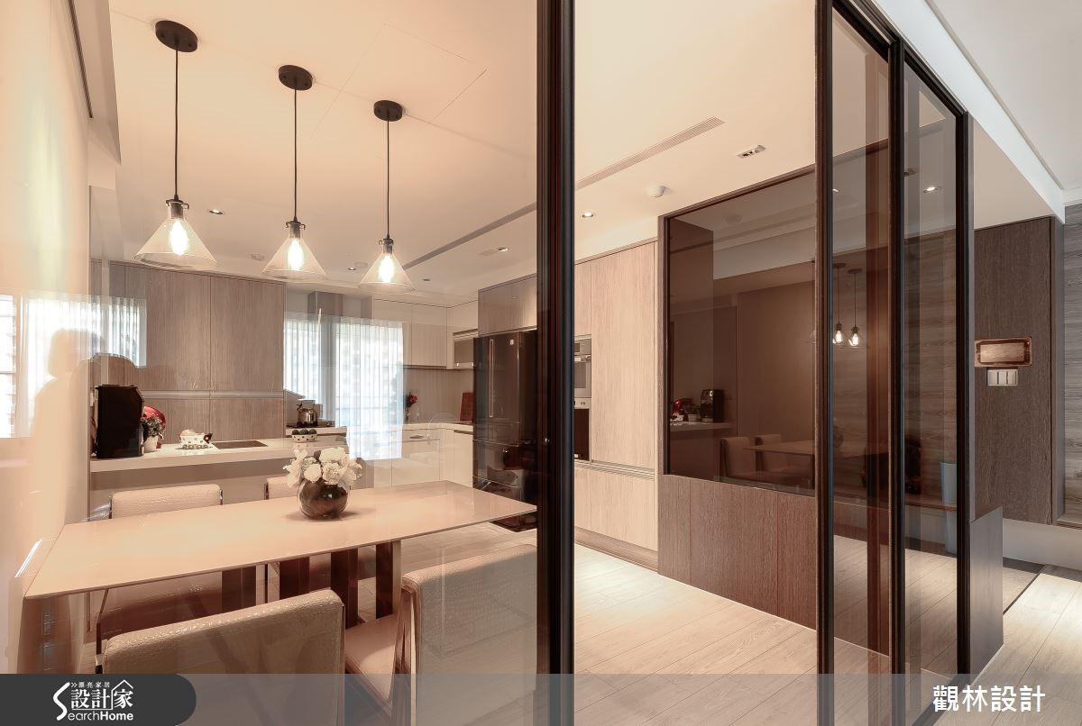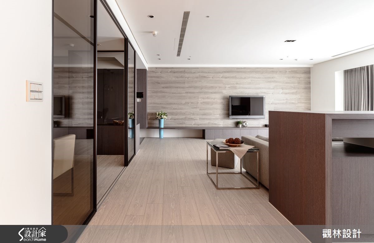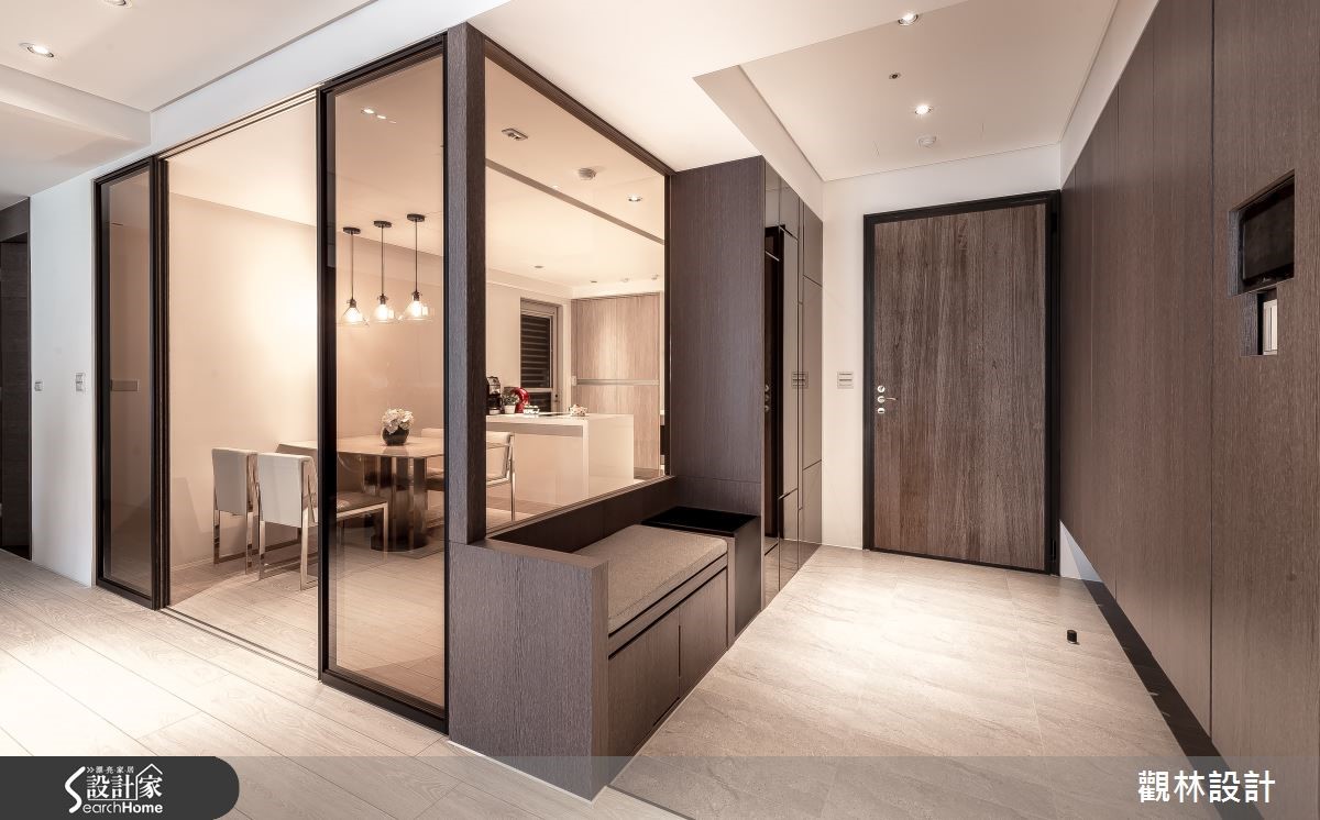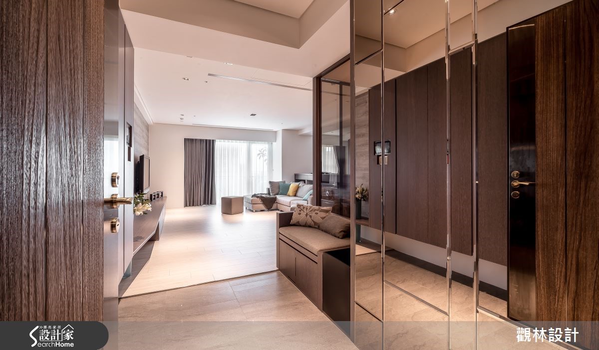 198平方米单层宅邸,以温润轻浅的木作设计乘载了幸福时光,在温暖日光的照耀下,整体居家空间透露简约清爽的韵味;同时在简单的风格中蕴藏不简单设计,将大量的收纳机能暗藏其中,为一家五口收藏甜蜜。【优雅犒赏自己的明亮时尚宅】推开木质大门,装设明镜的玄关格柜即为视觉带来明亮与时尚,同时兼顾服仪整理与收纳机能,深棕色木皮柜与穿鞋区及对墙相互呼应,实为匠心独运。木地板在日光的照射下,散发温暖色泽,灰阶电视墙面与软件配搭成一体,越过后方置物台面,即是可享受日光的飘窗区,后方大面积不规则几何造型收纳置物柜除了是空间的设计亮点外,更是充满机能性的视觉装饰。 【机能装修打造舒适减压居家】餐厨空间以茶色玻璃与客厅、玄关做出场域区别,并配置简单的一字型厨房与餐桌,拉门设计使视觉不致封闭,且阻绝油烟进入客厅。大型更衣间以系统柜与晕黄灯光打造怡人空间,舒适氛围延续至卫浴设备,完美的采光与干湿分离的机能,充满了时尚与利落简约气息。