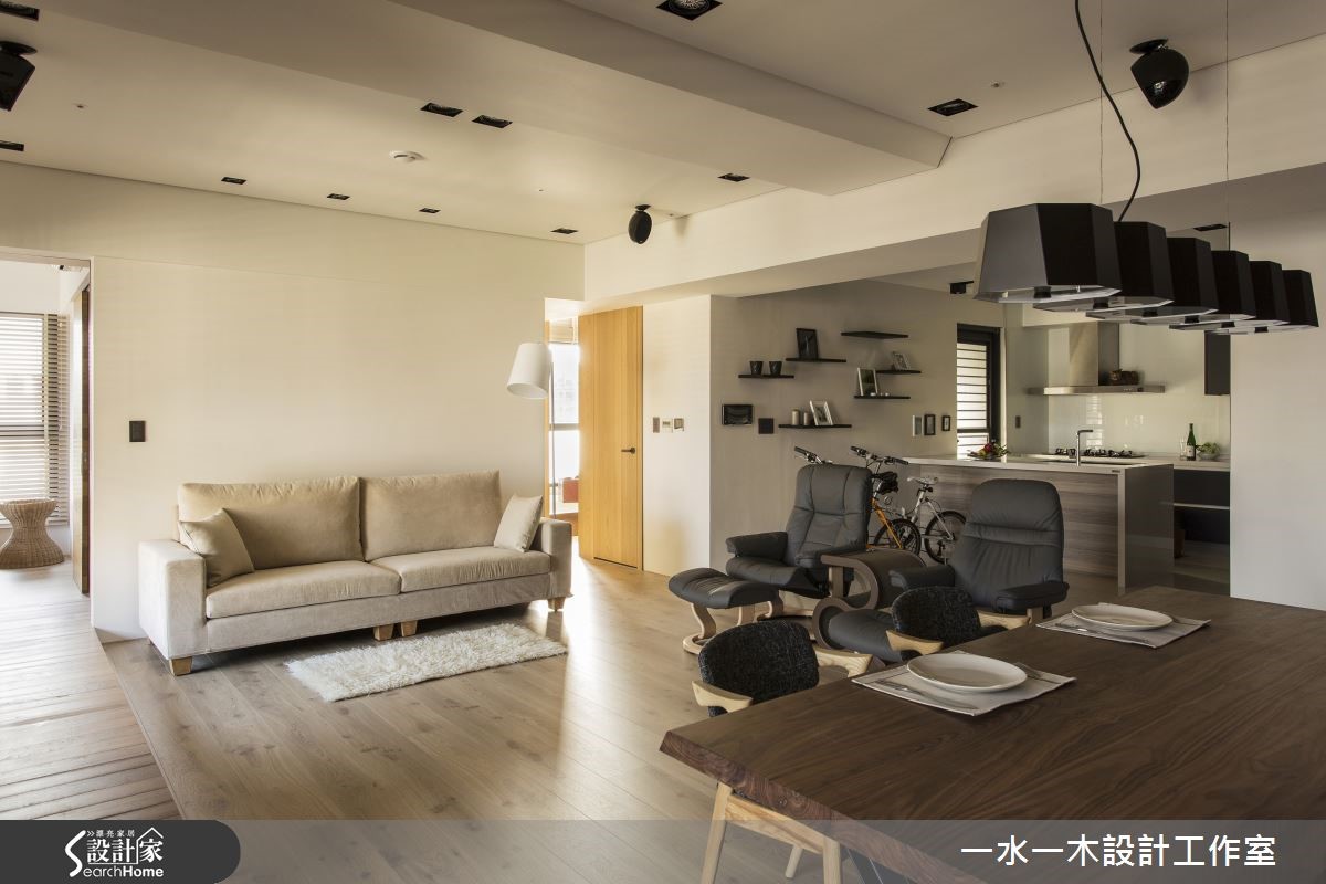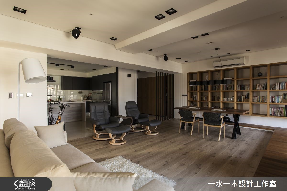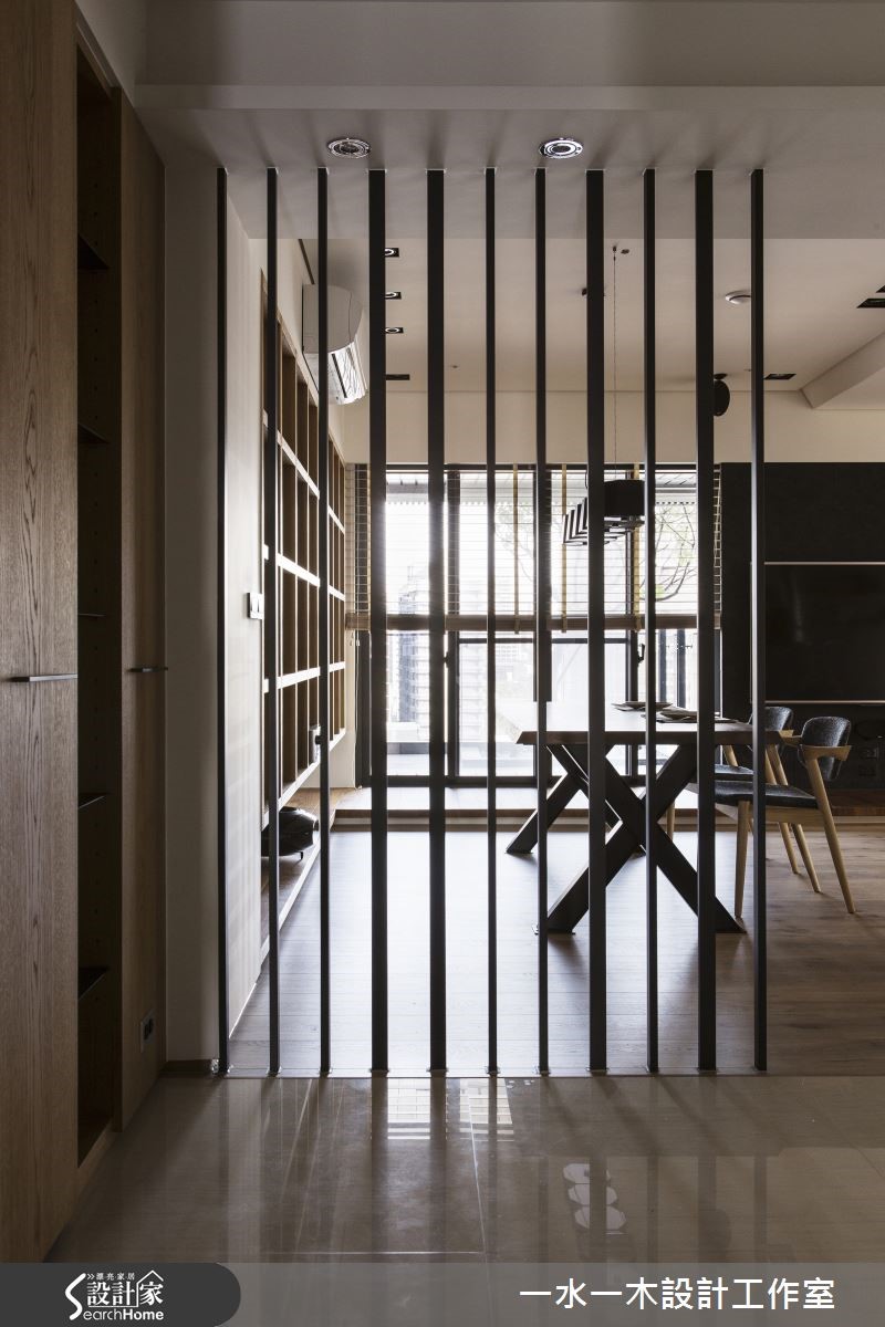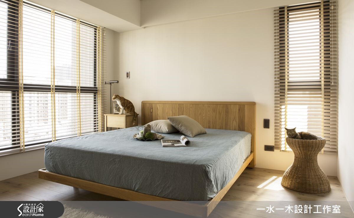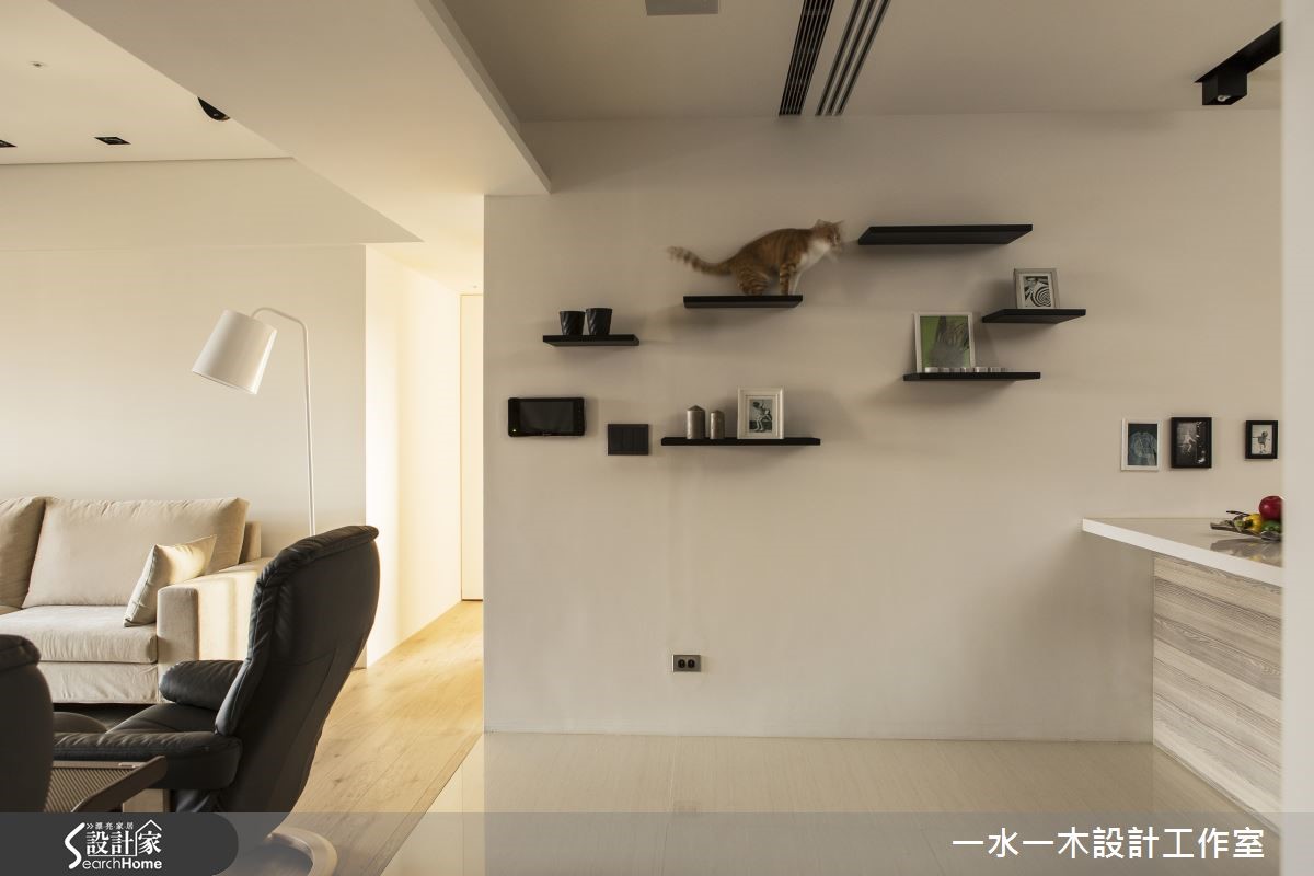 开放性空间如何有效区隔使用性,其实并不难!只要善用材料差异化,其实装修也能省去费时、花钱的工程,让方正空间呈开阔格局,兼具客厅、餐厅与书房功能。不仅带给一家三口宽广的居住想像,更将宠物生活也纳入设计之中。【电视墙转向,空间不受限】玄关处配置铁件格栅,穿引丰富的光影层次,并以不同的材质铺述地面,形成隐性的空间界定,让厨房动线自成一格。而整体空间则包含客厅、餐厅与书房等,呈开放且宽广的格局设定。电视墙转向设置在靠窗墙面,就能保有空间开阔优势,拉长客厅领域。同时于一侧设计大片书墙,客厅空间就纳入书房机能,也可作为餐桌使用,打造敞朗自由的多重空间。厨房则以吧台做出简单的空间分隔,并沿墙设计层架,不仅作为展示收纳区,也可作为猫爬架使用。卧室内配置木百叶窗兼顾通风及隐私,并与木作家具、木地板等形成一致的清新风格,搭配窗外阳光的温煦照射,营造纾压感十足的疗愈气息。