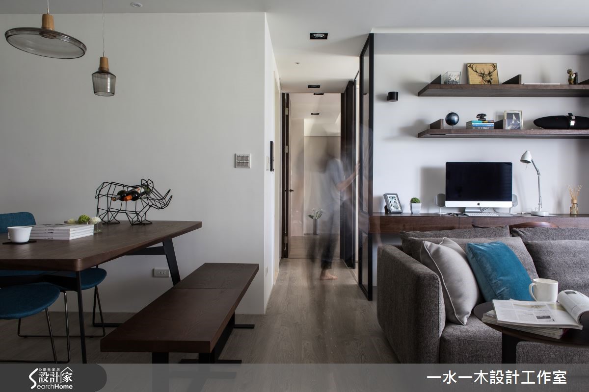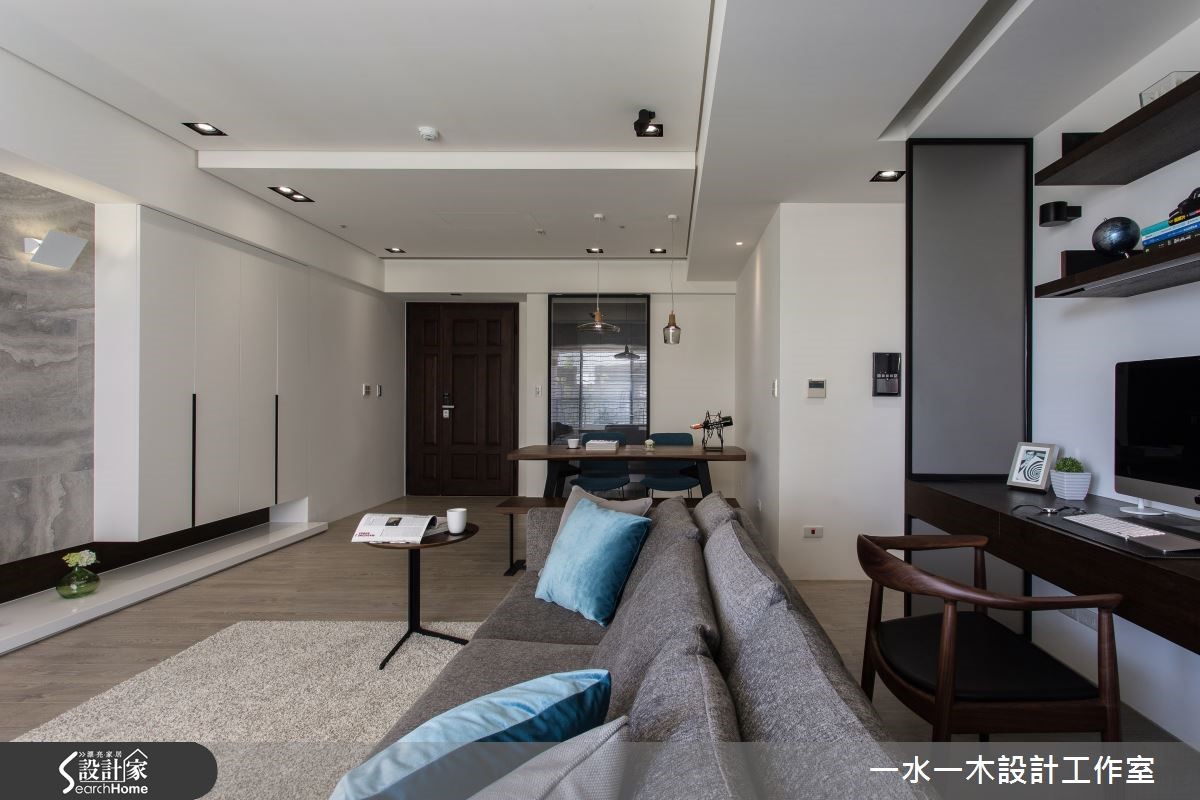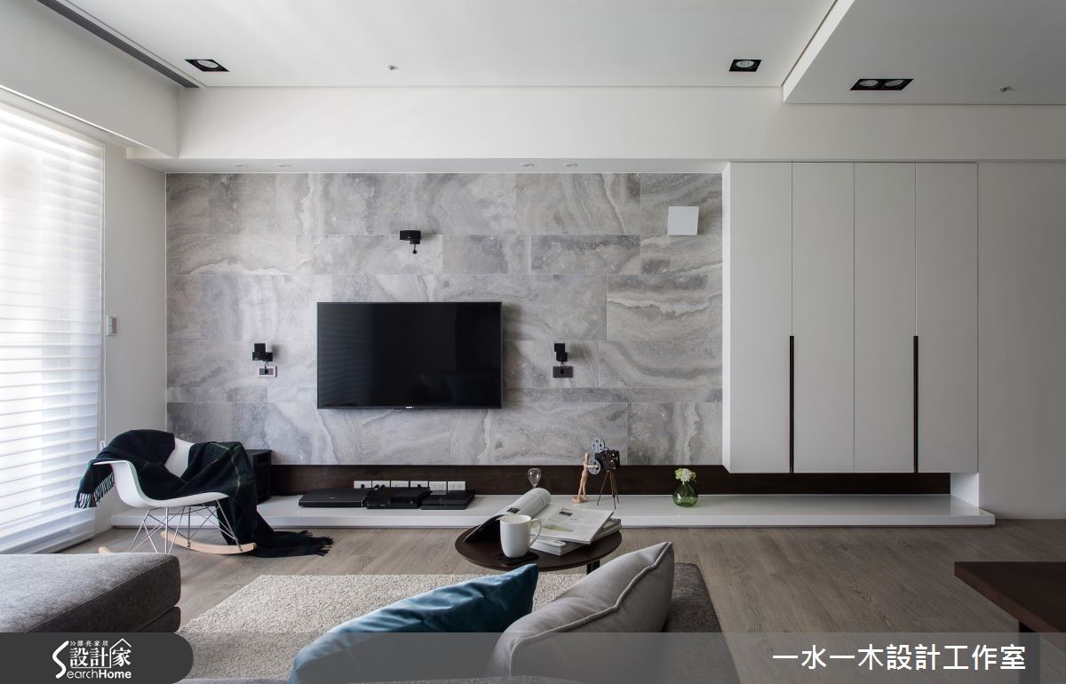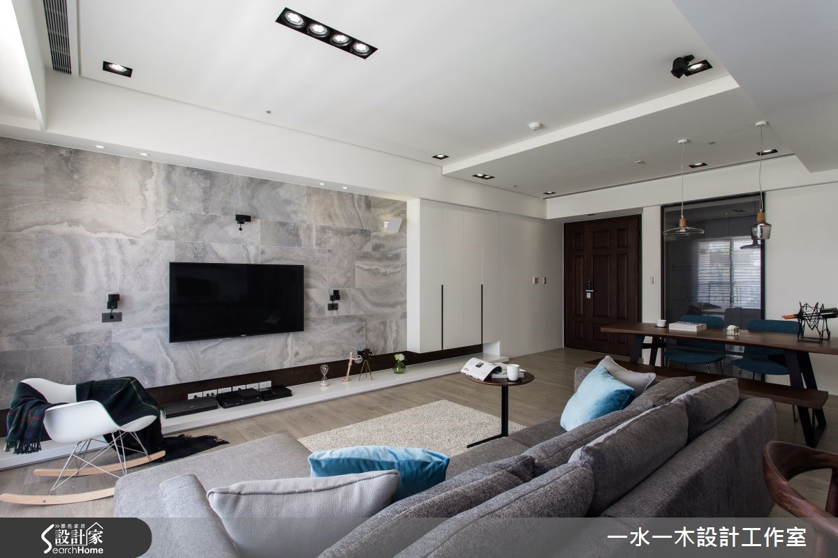 空间设计应当回归生活本质,规划繁为简,将繁杂过多的设计剔除,以开放式设计使区域通透明亮。不同的材质相互平衡视觉效果,各角落皆蕴藏充满温度的设计,营造了怡人的生活空间。【灰白石材搭木质,简约中添暖意】纯白吊柜自玄关延伸,与天花及墙面融合,延伸视觉深度。客厅电视墙采用灰白大理石拼接而成,流云花纹拼接营造丰富视觉效果。轻浅的木质地板与窗外日光一同平衡了大理石的冷调温度。巧妙的比例切分,让沙发后方的长型空间化为专属视听区域,镶嵌在墙面上的隔板成为具展示功能的收纳架。 餐厅以深色实木桌打造沉稳气息,点缀海蓝色餐椅凸显视觉,在透明造型吸顶灯的照耀下更显温馨。延续客厅电视墙的设计,主卧床头背墙也采取几何拼接,进一步提升设计感。设计师特地打造了更衣室,除了完整衣物分类功能外,更有一张宽敞的梳妆台,让妆扮空间更加舒适。和室运用架高地板,扩增收纳的同时,更可成为休憩与阅读的多功能空间。