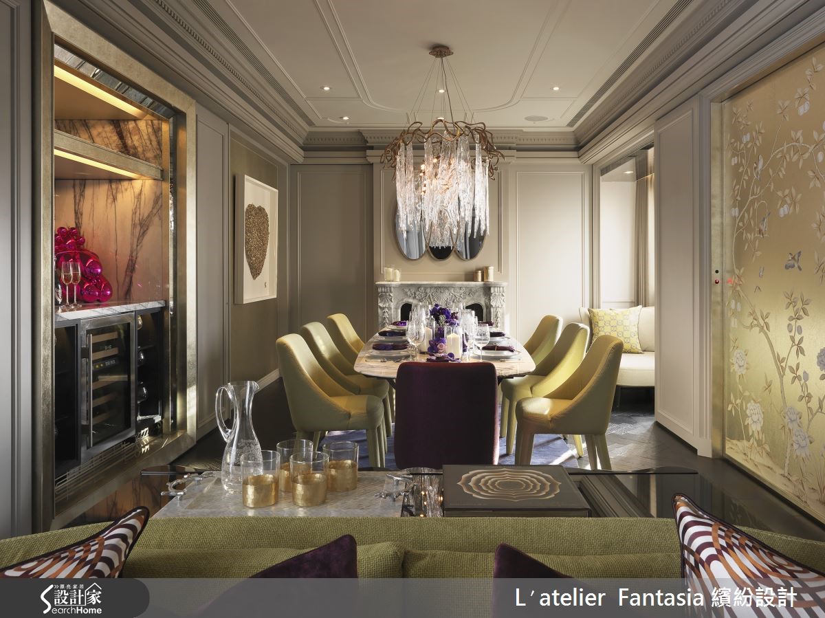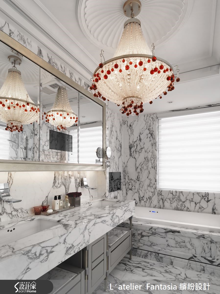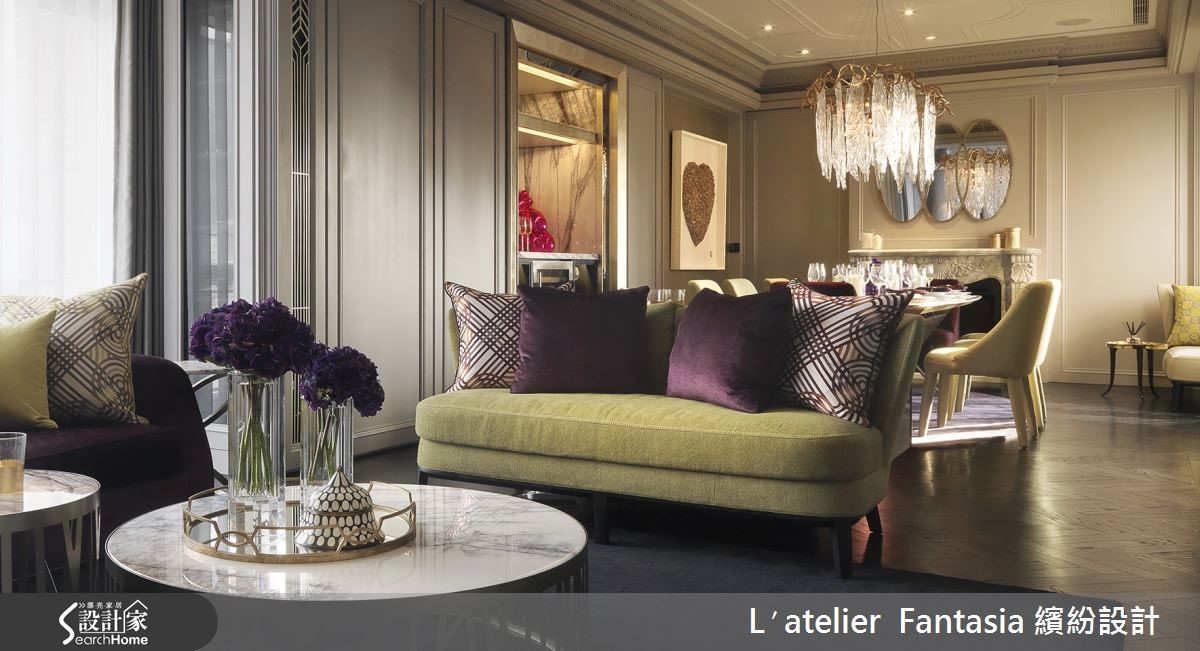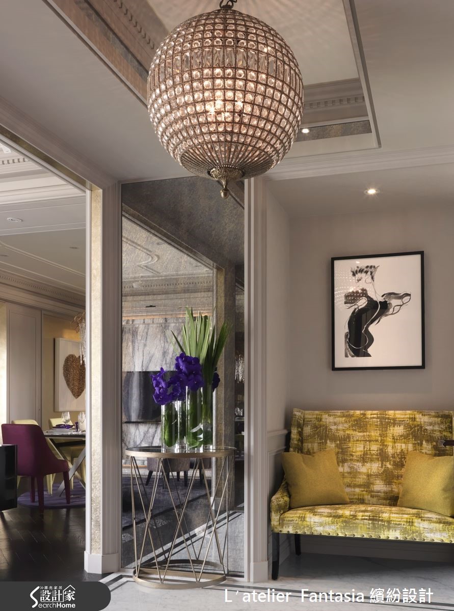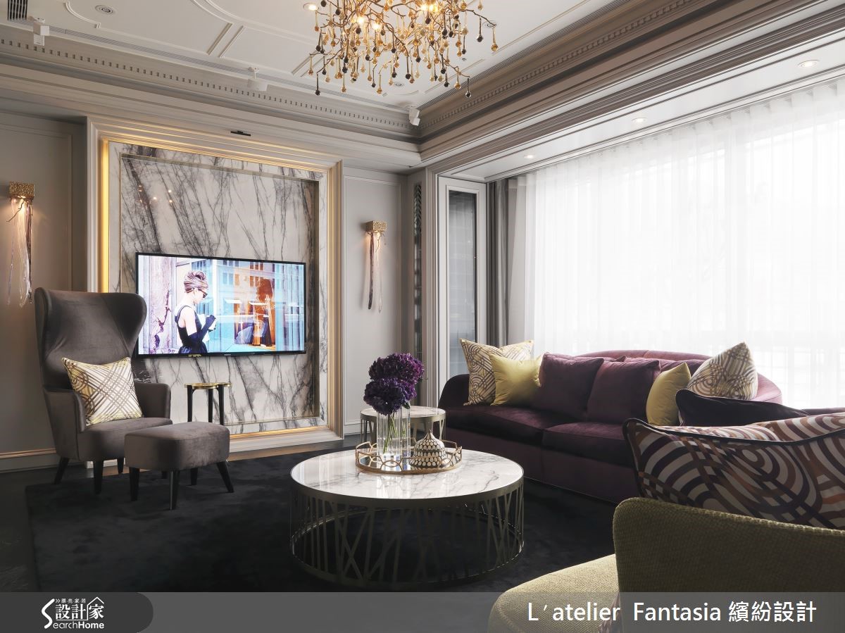 设计师依据居住者的生活需求,将155平米新成屋的4室改为3室,重新调整格局配置比例,在空间中注入精致材质以及工艺品元素,细腻的手法表现,让毛胚屋脱胎换骨,变身为具有绝佳品味的质感名流宅。 【玄关是展现品味的关键】玄关天花向上做出层次,奢华的球型水晶吊灯从中垂坠,在天花深处形成雅致光影,进门即暗示屋主的优雅品味。进入客厅,大理石的天然脉纹蔓延整面电视墙,成为壮丽的空间装饰,软装则采用女主人喜爱的紫色和金色,妆点宛如上流贵族般的高雅气韵。【用餐配艺术品,让身心灵都饱足】精心打造的用餐空间,餐桌上方以奢华不凡的灯饰聚焦聚会气氛,一旁并摆上艺术家作品,甚至后方的厨房门片也乘载着数百年的精湛工艺,以手工金箔壁画呈现屋主最爱的花草纹样,炫目而精巧的艺术品营造优雅的用餐氛围。 主卫浴从壁面、洗手台至浴缸,全由具有天然石纹的阿拉伯白大理石打造,天花向上做出圆拱型,相当有欧式宫廷感,并置入一盏由佛罗伦萨采购的编织水晶灯,在洗浴时也能感受到高贵华美的雍容氛围。