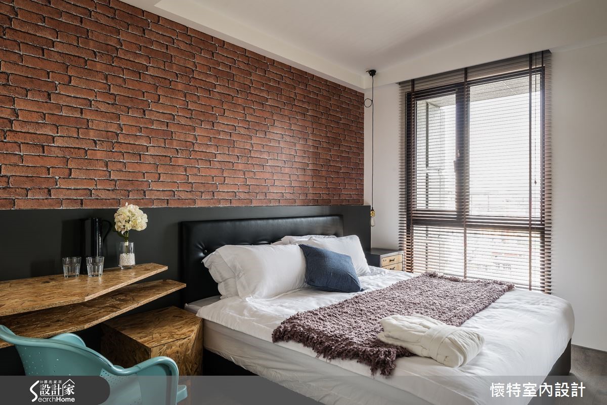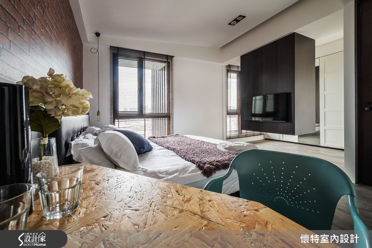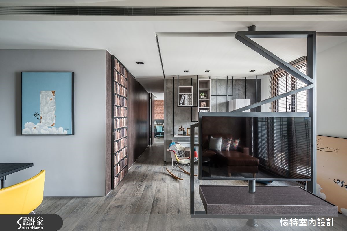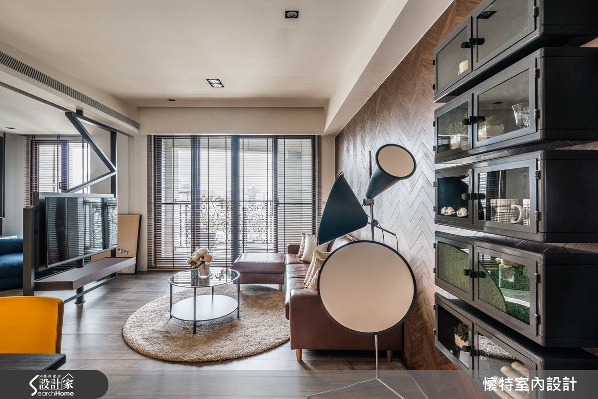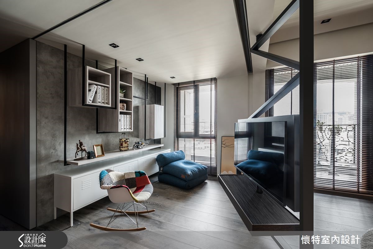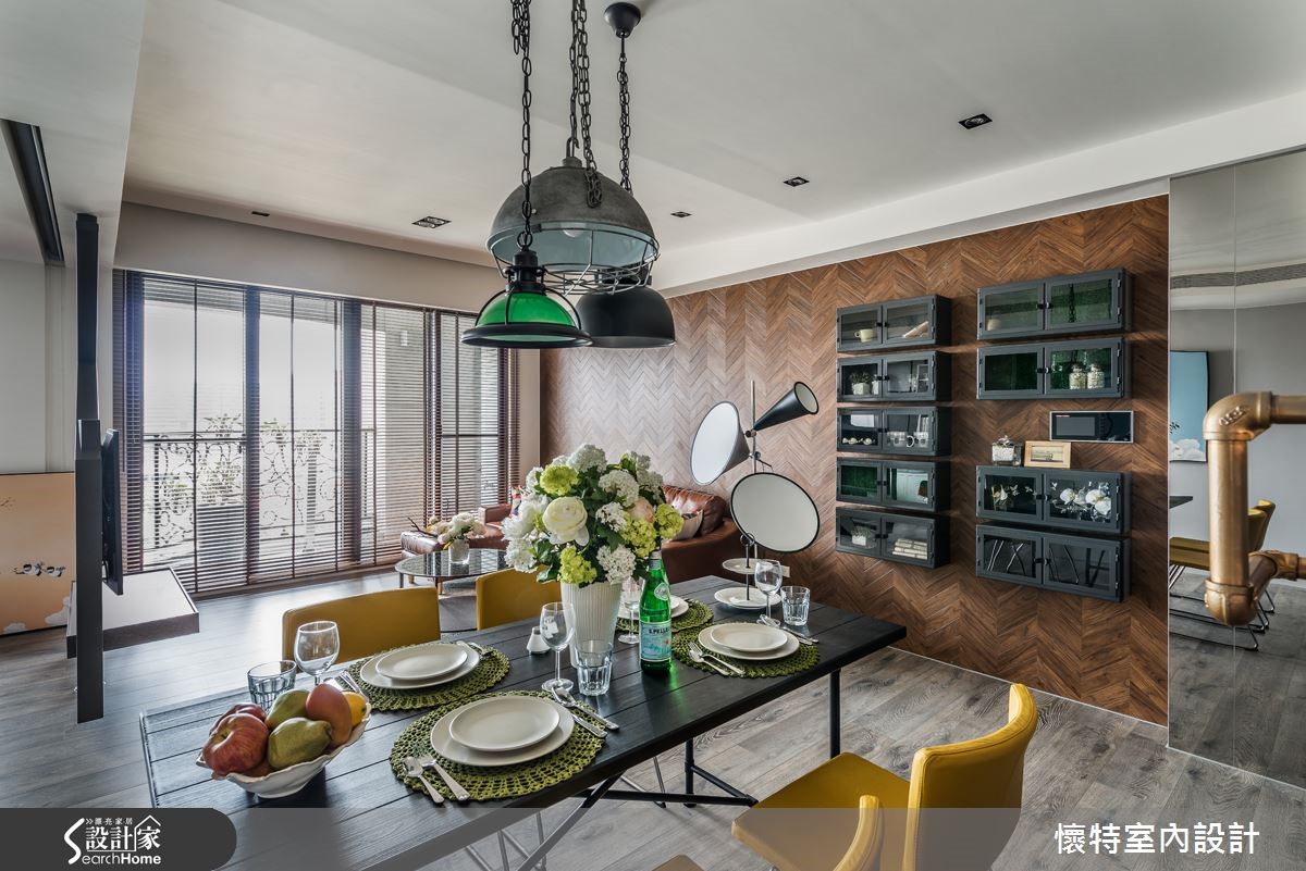 116平方米居宅以三室为规划,打破既有隔断,注入充满弹性的生活模式,且以深色调作为整体基底,融入工业感与现代风格,打造出一间充满特色的个性化潮宅。 【人字拼电视墙,造开阔气势】整体居家以旋转电视架作为中心,并做出可收放的卷帘设计,于厅区后方区隔出一间多功能书客房,且采用涂刷混凝土建构灰色主墙,于墙面加入铁件与吊柜,注入收纳、吊衣机能,满足多重的生活需求。客厅在沙发背墙铺设人字形拼贴塑料地板,丰富材质纹理,也型塑大器范。一旁将柜体嵌壁,形成悬浮的收纳展示柜增添视觉趣味;餐厅天花则悬吊铁件吊灯,形成画龙点睛的效果,且与厅区造型立灯相互呼应,营造十足的工业风味。主卧在床头加入红砖图纹墙纸,形成几可乱真的街头趣意,并以OSB板打造书桌,运用材质的多维混搭,巧妙呼应公私领域情境衔接,创造意想不到的空间惊喜。