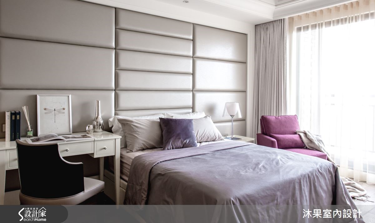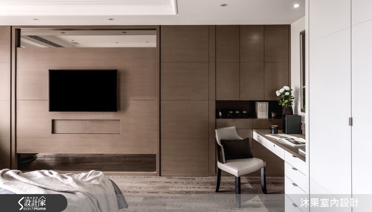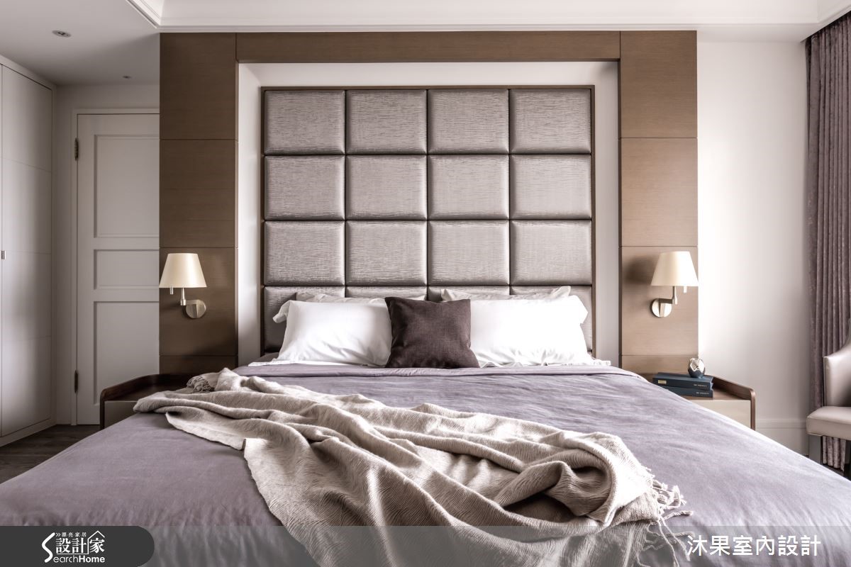 这户181平大宅中,在设计师的规划之下,打造流畅的动线,且不刻意强调制式风格,以奢华为调性,融入现代感与东方元素,赋予每个区域不同的风貌。【浅淡客厅对比深色餐厅,突显视觉】客厅以轻浅的色彩营造清爽氛围,并以在灰底背墙加入金属线性边框,展开墙面的立体视觉。且加入现代沙发、中式设计的桌灯营造工整画面,展现中西交融的经典优雅。而电视墙两侧则保留透空,形成客、餐厅之间的流畅口字动线。电视墙背面作为收藏品展示柜,替餐厅区注入东方人文之美,采以圆桌搭配柱状吊灯,在现代机能内融入中式元素,打造富丽温馨的气息。一侧墙面则装饰艺术画作,不仅美化墙面,更柔化了东方传统的浓郁性。来到臥房,则可见床头以木皮结合亮泽感绷布,展现细腻且奢华的工艺,并让电视墙做出上下透空处理,保有各个区域之间光线、空气的流动。