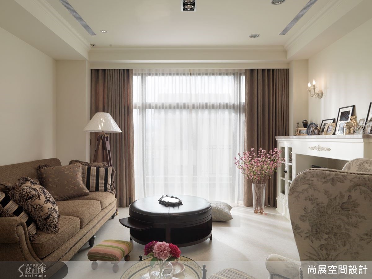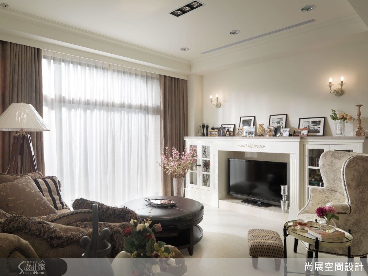 客厅主墙融入壁炉造型,并简化传统西洋住宅的繁复线板,主墙更为简约俐落。并透过4:6的装修与家饰比例,搭配花色单椅与沙发、皮革茶几的优雅韵味,提升视觉美感。
