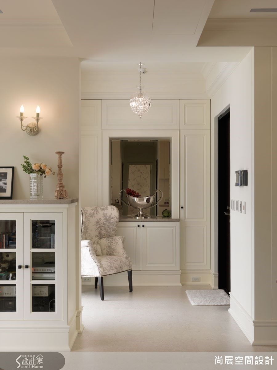 玄关区恰好自成一格,后方有着明亮的大窗引入自然阳光,让人一进门就感受到爽朗舒适的气氛。同时安排收纳量充足的玄关柜体,再搭配舒适的花色单椅,不但顾全实用考虑,也提升美感。