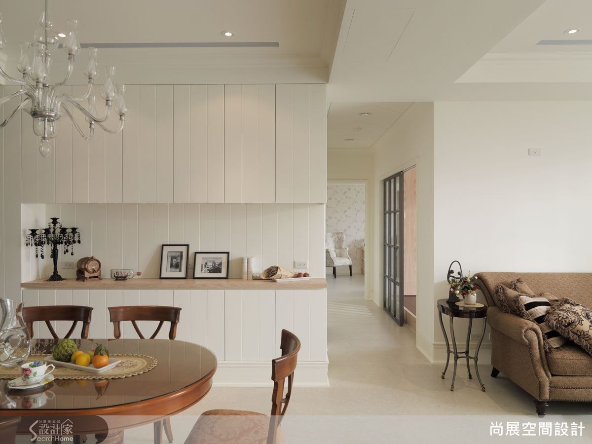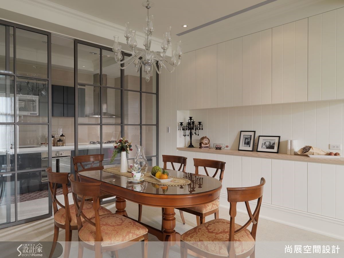 餐厅与厨房之间以铁艺格门区分,搭配通透的玻璃让是觉得以穿透,保有开阔氛围。而餐厅运用净白高柜为空间添入纯净明亮,直纹的柜门设计则流露质朴乡村质感。