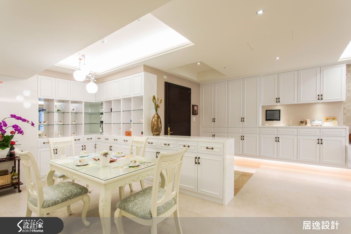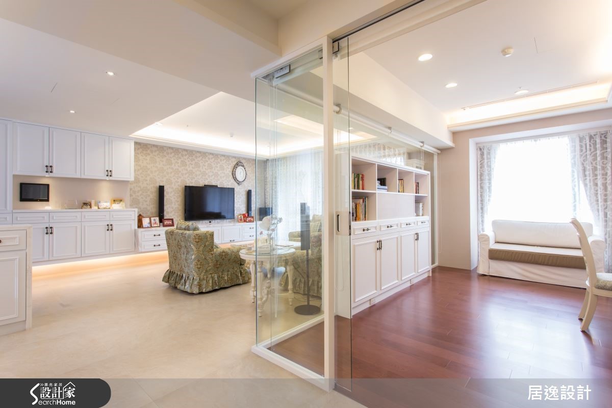 位于台中市的 152平方米乡村风住宅,设计师将风格结合实用机能,配置大量线板柜体型塑典雅情调,且融入灯光、壁纸与软件,阐述有如欧风住宅般的生活格调,运用线条、图腾与通透材质的交叉呈现,让空间视觉更显大器!【丰富机能让家拥有更多面貌】在公领域中,设计师将整排线板柜体收整于立面,一路连结至电视墙,并采以悬吊设计底部内嵌间接照明,创造空间的温暖光感,且加入珠光壁纸搭配橄榄绿碎花沙发,创造居家中的图腾亮点,沙发后方则拆除实墙,改让书柜一体两用作为背墙,结合清玻营造通透视感。书房借由玻璃墙身围塑场域,延揽充沛光线与宽广视野,同时配置自动帘幕兼具隐私,注入临时客房功能;餐厅则规划L型餐柜纳入充裕的收纳机能,延伸量体形成玄关、餐厅之间的界定,并借由简洁的灯光规划,开启明亮用餐氛围。来到卧房空间,可见柜体、门片整合于墙的干净线条,并妆点花卉壁纸、粉嫩色寝具等,搭配床头两侧的开窗引光,让周遭盈满生机蓬勃的气息!主卫更采用清玻接合雾面玻璃,兼顾隐私之余,更形成通透的视觉效果,而完善的动线规划、宽广的使用空间,皆让居者享有最舒适的卫浴体验!