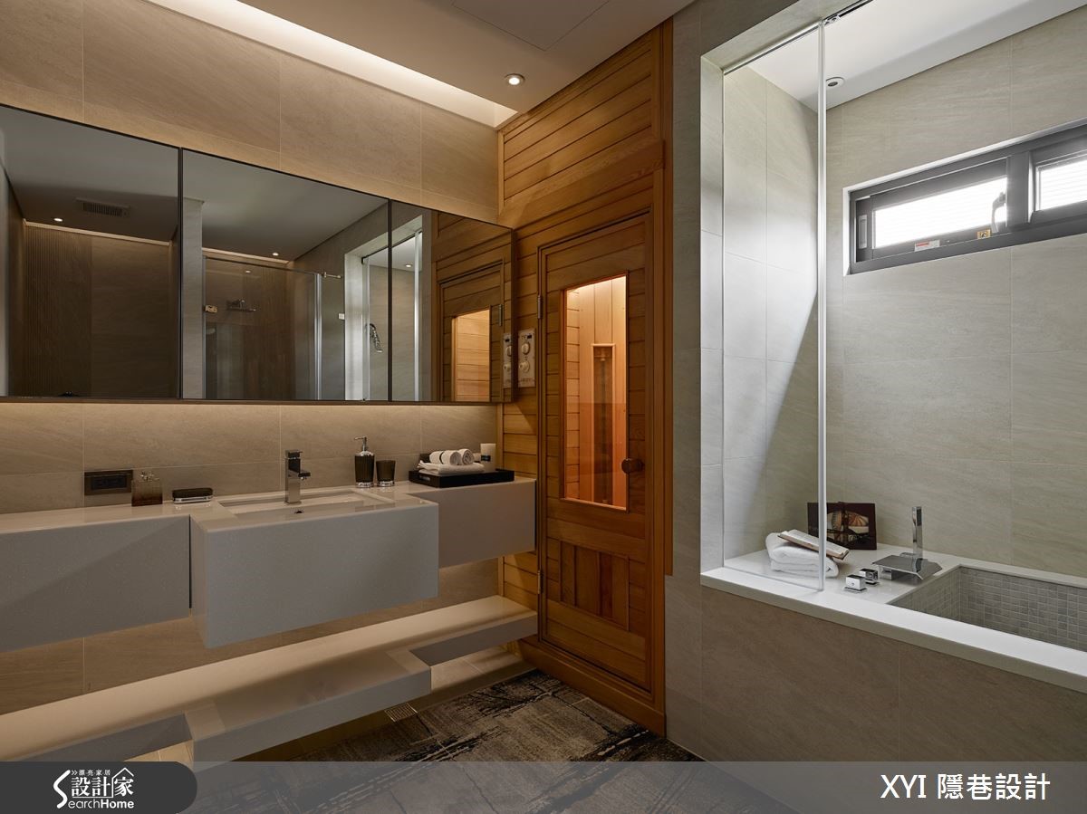屋主期望能拥有怡然自得的退休生活,并和儿子及未婚妻一同居住,同时也替旅居国外的女儿留有生活空间。于是设计师在建物外观上,运用简约线条、石材凿面等,构筑有如博物馆般的庄严印象。室内则注入三种风格,同时满足一家人需求,完成心目中的梦想宅邸。 【木质贯串全室,一层一风格】客厅加入大理石材、钛金属等建构空间质感,而沙发背墙则以绷布强化隔音,打造理想的视听空间。主卧使用大量桧木家具,呈现香味满溢的氛围;浴室则以酒店规格打造,采用进口瓷砖拼贴墙面,加上SPA机能设计,创造纾压疗愈的体验。在儿子的起居空间内,还原谷仓门扇,加上菱形切割吧台,使细致与粗犷相辉映,彰显工业风格。寝卧内则铺陈人字地板,并加入羊皮革漆、绷皮等,型塑整体质感。而在女儿房中则以轻古典风格为主,选用黑白色经典,并加入线板,彰显女性的优雅格调。