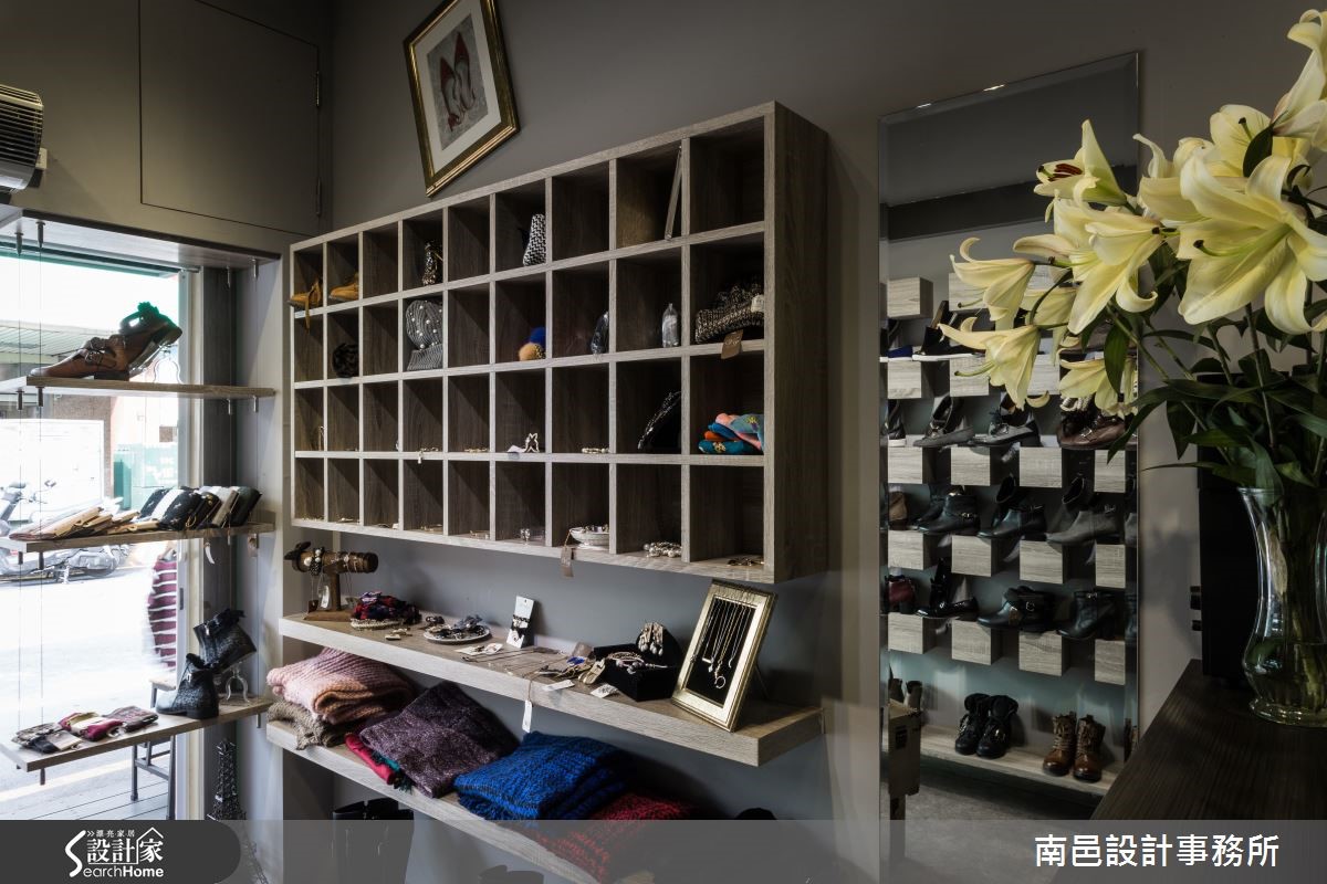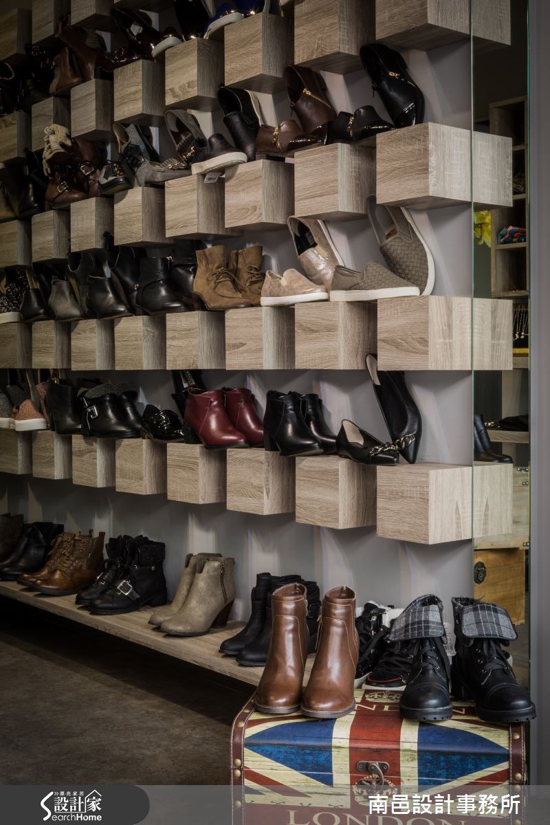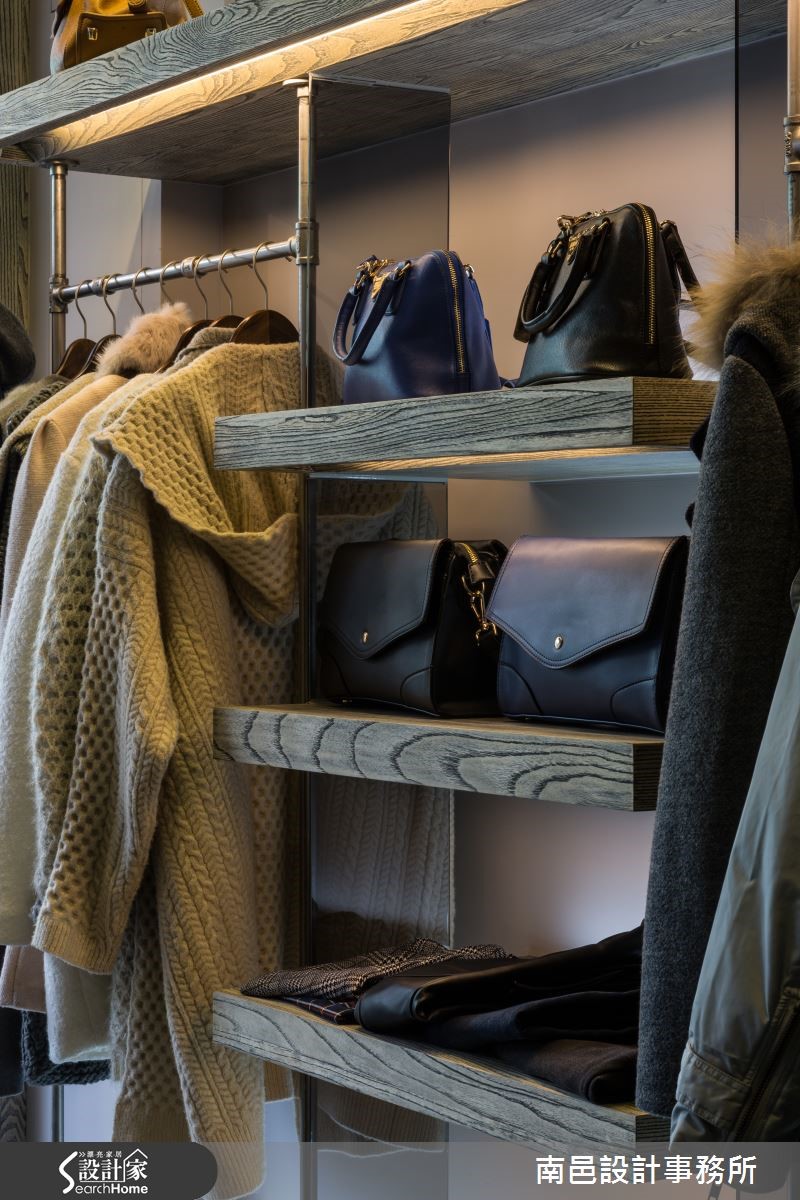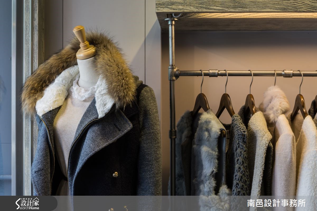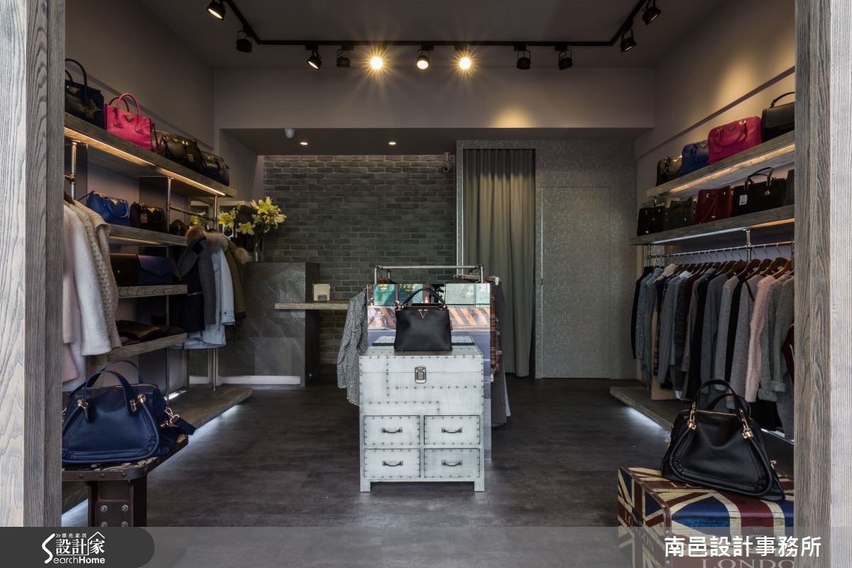 设计师在短时间压力下,排除二手房漏水与壁癌等重重困难,成功打造一户集现代俐落、 工业个性与美式休闲于一身的26平方米服饰店。同时达成精美的商品陈列规划与动线设计的目的。 【矿石搭配铁件,粗犷自然】敞开木皮玻璃门,全开放的店面空间,采用塑胶木纹地板,不失质感又节省预算。通过水泥质感柜台,矿石板墙面营造了粗糙视觉效果。店面中心布置铁件格柜,连接镜面铁件展示衣架,营造个性主视觉,进门两侧则搭配复古质感木箱,同时兼具个性单品与商品展示功用。两侧商品展示架综合了配件台面与悬吊衣着功能,设计师特意让隔板悬空,并在底部镶嵌投射式照明,不露痕迹的展现商品具吸引力的一面。方形轨道照明则给予整体空间的亮度照明,展现聚光灯的效果,提高顾客的视线青睐。
