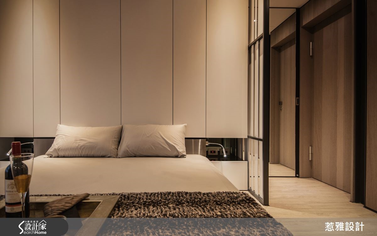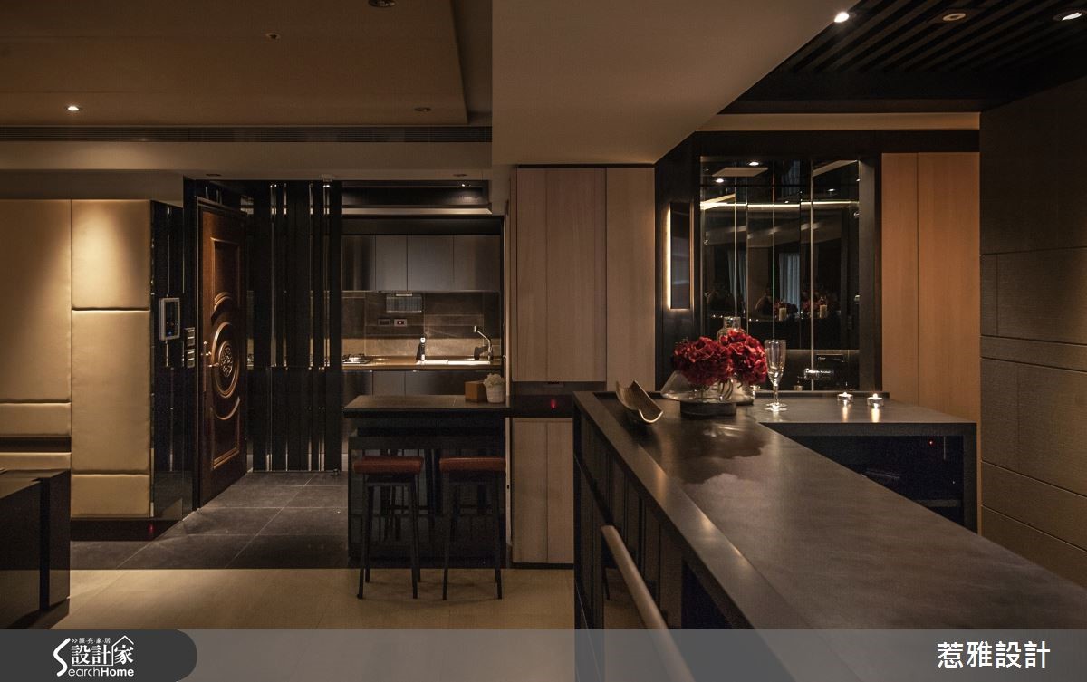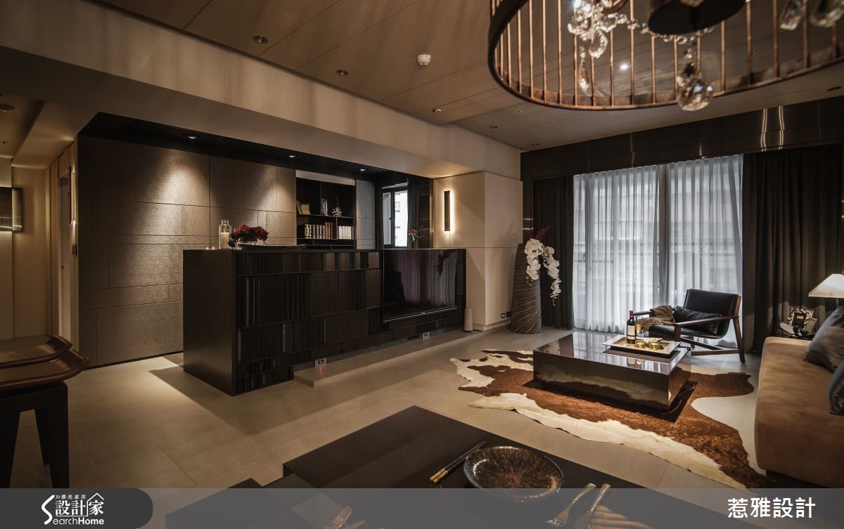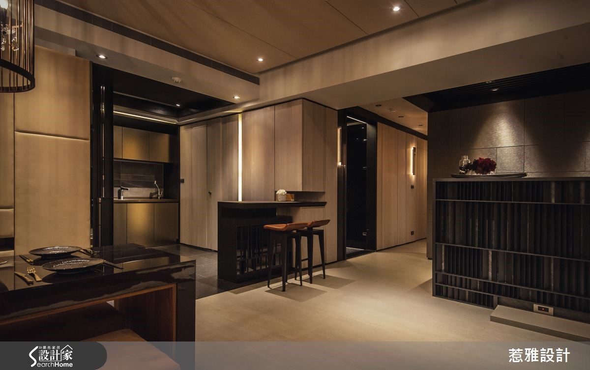 109平方米居所,充满着神秘悠远的东方风色彩,公共空间采以开放式规划,全室无多余的制式隔断,却能场域界定分明,型塑完整流畅的机能动线,再佐以柔和的灯光规划,让居家散发出令人着迷的空间气韵!【虚化领域界线,打开扩容视野】空间中将客、餐厅的界线虚化,形成开放通透的视野,并让沙发、桌几、餐桌等高度降低,形成亲切无压的氛围,并让家具呈深紫褐色钢琴烤漆,藉此凸显居宅的大地色基底,形成色彩上的视觉对比性。【层叠铁片装饰,展现渐进美感】电视柜运用铁件片片相叠,形成渐进的色彩美感,沙发后以艺术墙饰型塑亮点,透过清新内敛的花朵装饰,引注东方人文气息。厨房则采用精致镜面结合厨房门板,并点缀黑铁框边作出修饰,让厨房瓦解制式样貌,化身成为精品玄关!