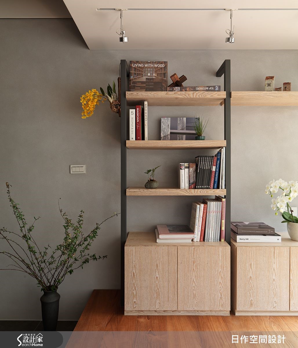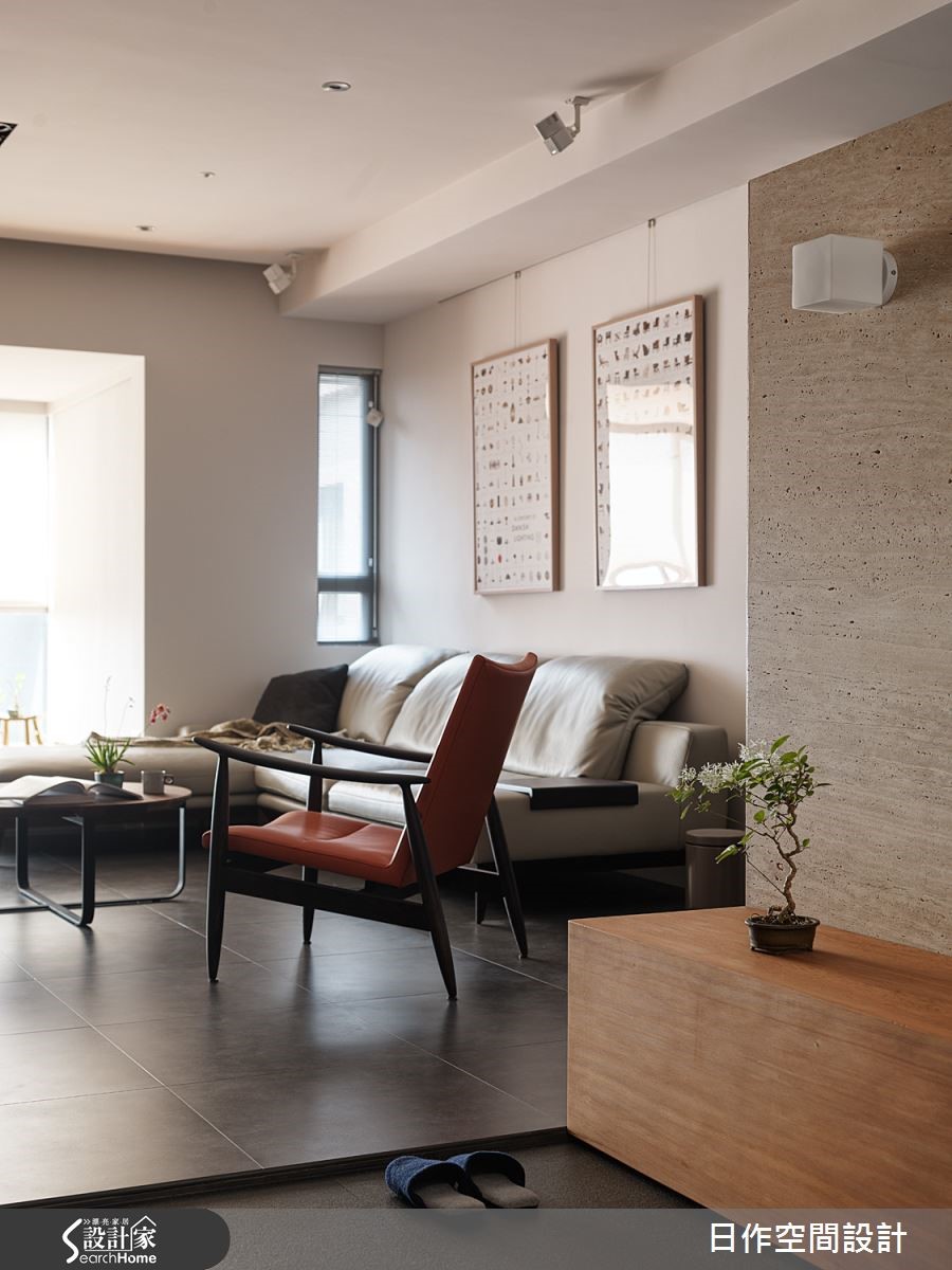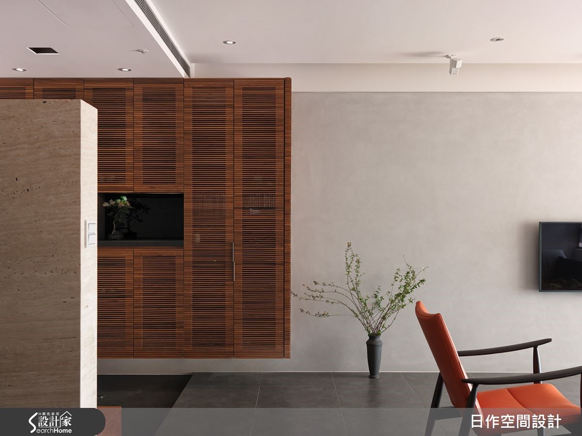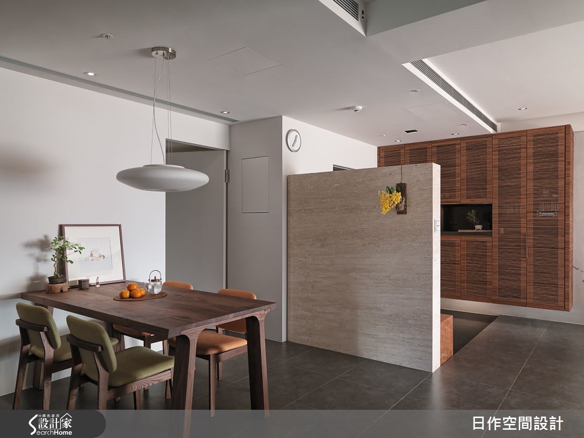这户高楼层住宅已然拥有超脱城市喧嚣的开阔视野,佐以设计师擅长的日式禅意风格,为一家四口打造出富有自然气息的木质简约居家;更利用地面材质与阶差,营造深具层次的视觉ㄒ效果。【中性米灰,造宁静氛围】玄关左侧设有中心挖空的木质悬柜,表面细密的叶面制造精致和谐的景象,右方带有天然纹理的洞石墙面上嵌入一盏小灯,为下方的穿鞋座位点亮贴心微光。客餐厅全面开放,地面铺设板岩砖,让无多余杂饰的客厅空间巧妙与玄关作出区隔。客厅墙面采用灰色涂抹,并搭配米色沙发,营造宁静特质。临窗区域则铺设木质地板,身兼和室与阅读场所等多功能用途。餐厅同样运用清爽的大地色调搭配实木桌面,散发纾压氛围。拆除一室隔断与主卧合并,便多了更衣间。巧妙以黑玻门片区隔,透光设计让主卧不阴暗,也能适时遮蔽凌乱衣物。而更衣室采用U字型柜体设计,获得充足收纳机能;内部更安排卫浴空间,打造顺畅的入浴更衣动线,完善主卧机能。