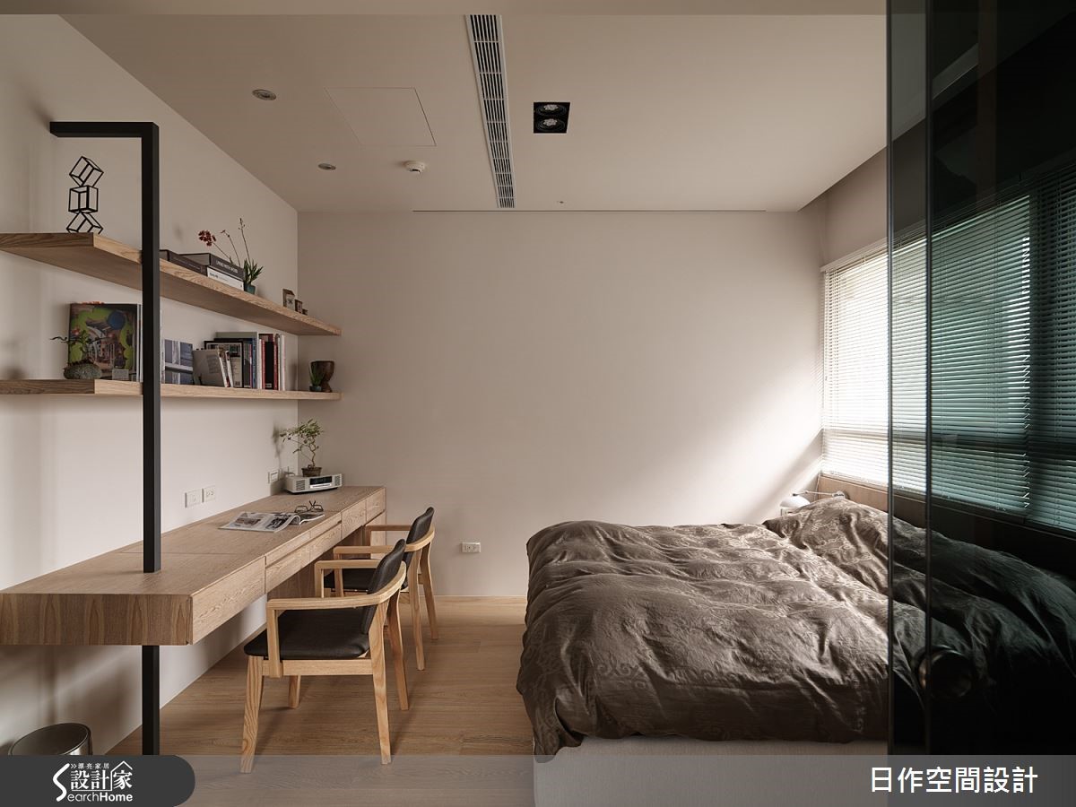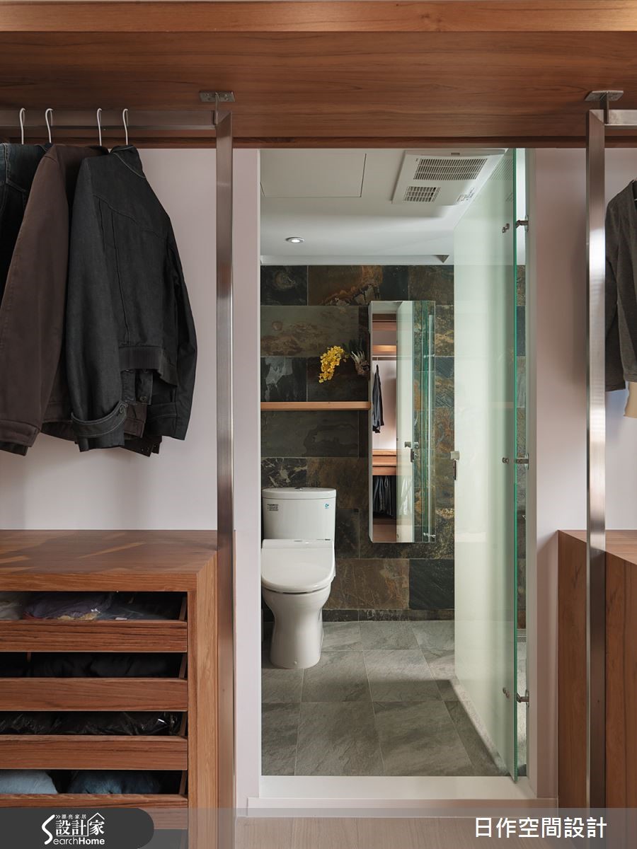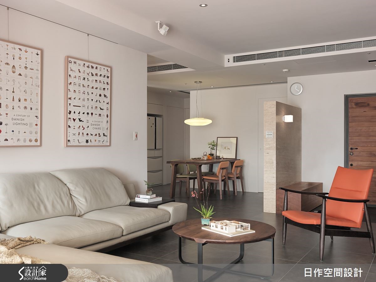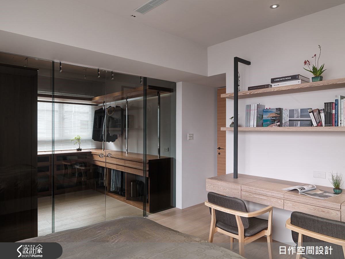 这户高楼层住宅已然拥有超脱城市喧嚣的开阔视野,佐以设计师擅长的日式禅意风格,为一家四口打造出富有自然气息的木质简约居家;更利用地面材质与阶差,营造深具层次的视觉ㄒ效果。【中性米灰,造宁静氛围】玄关左侧设有中心挖空的木质悬柜,表面细密的叶面制造精致和谐的景象,右方带有天然纹理的洞石墙面上嵌入一盏小灯,为下方的穿鞋座位点亮贴心微光。客餐厅全面开放,地面铺设板岩砖,让无多余杂饰的客厅空间巧妙与玄关作出区隔。客厅墙面采用灰色涂抹,并搭配米色沙发,营造宁静特质。临窗区域则铺设木质地板,身兼和室与阅读场所等多功能用途。餐厅同样运用清爽的大地色调搭配实木桌面,散发纾压氛围。拆除一室隔断与主卧合并,便多了更衣间。巧妙以黑玻门片区隔,透光设计让主卧不阴暗,也能适时遮蔽凌乱衣物。而更衣室采用U字型柜体设计,获得充足收纳机能;内部更安排卫浴空间,打造顺畅的入浴更衣动线,完善主卧机能。