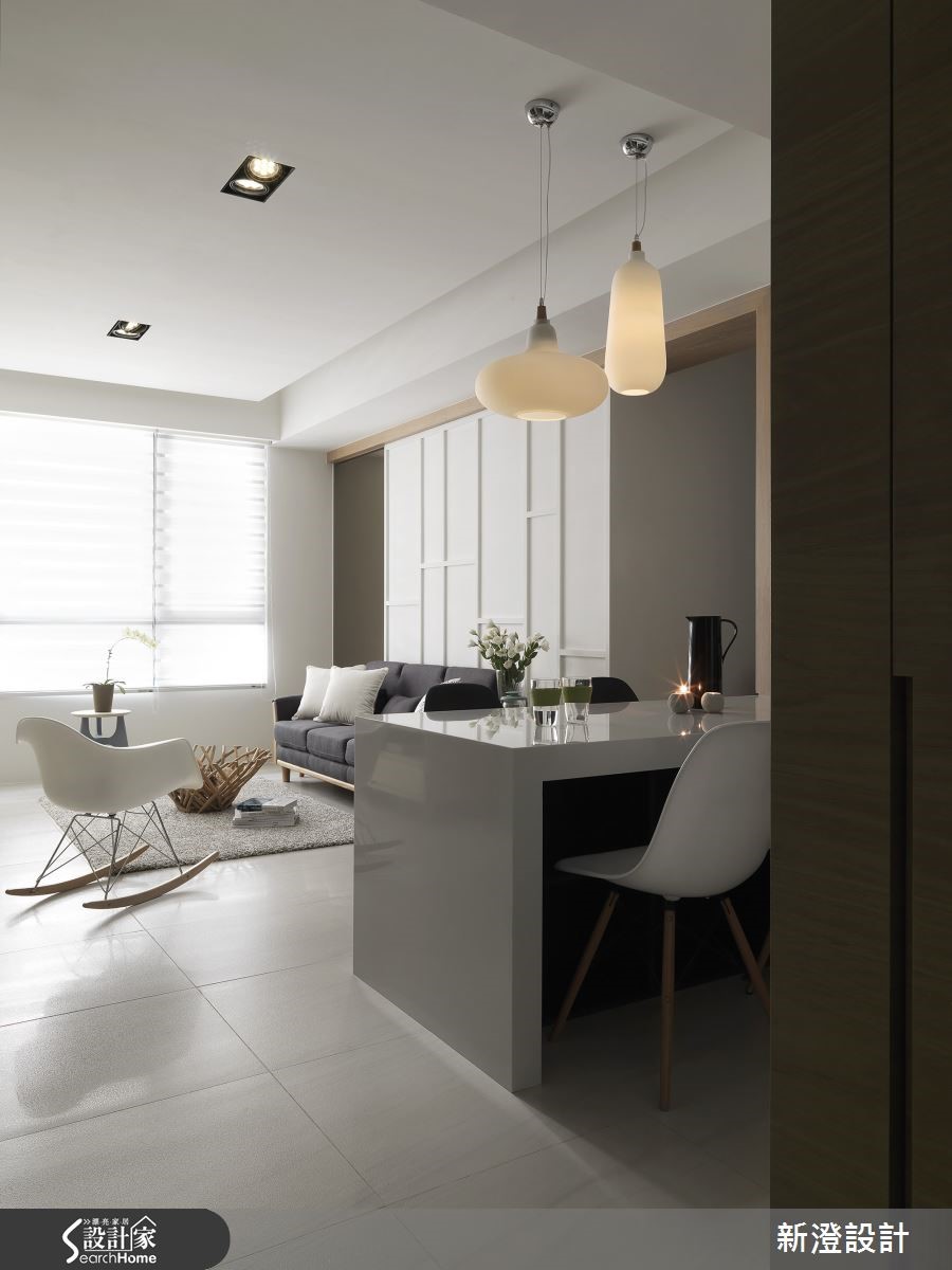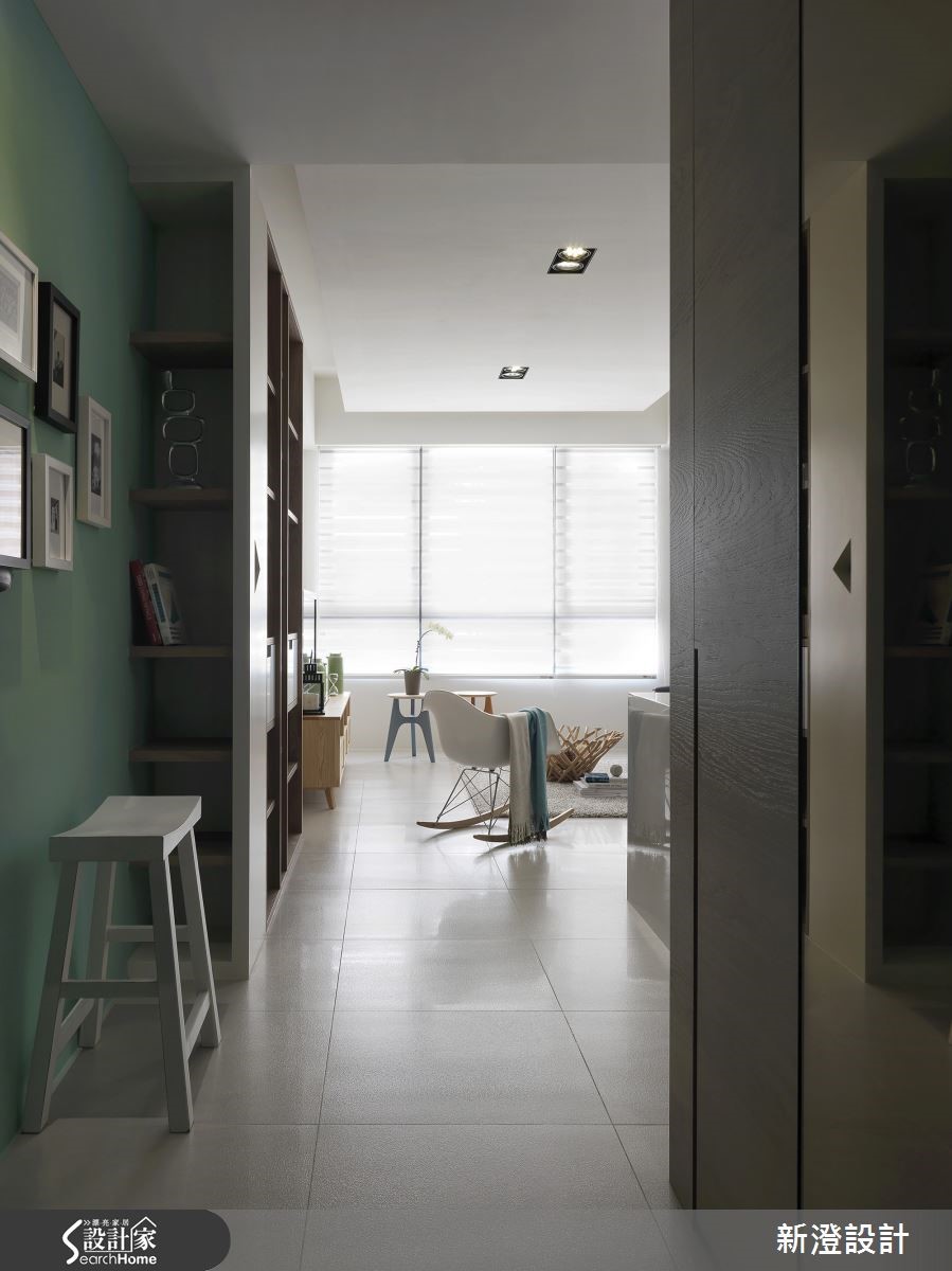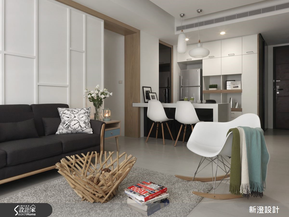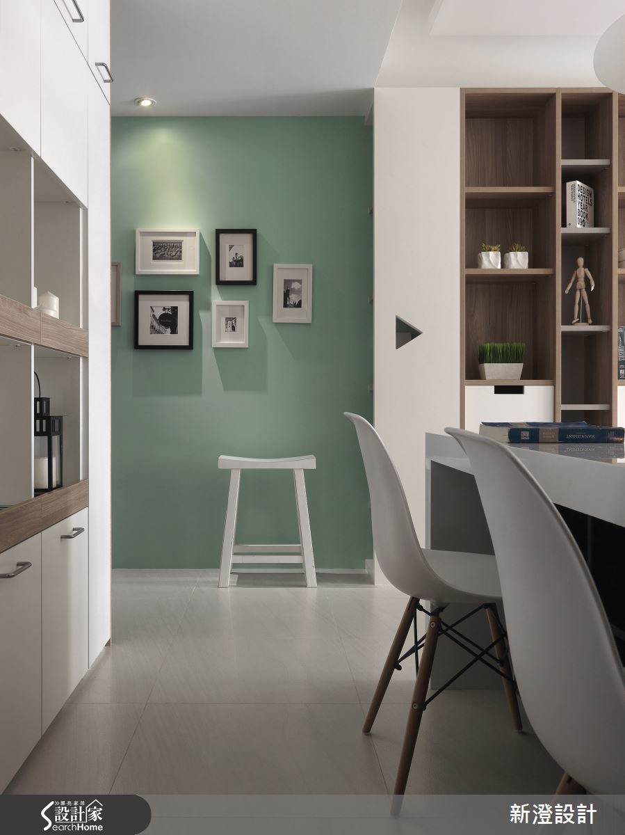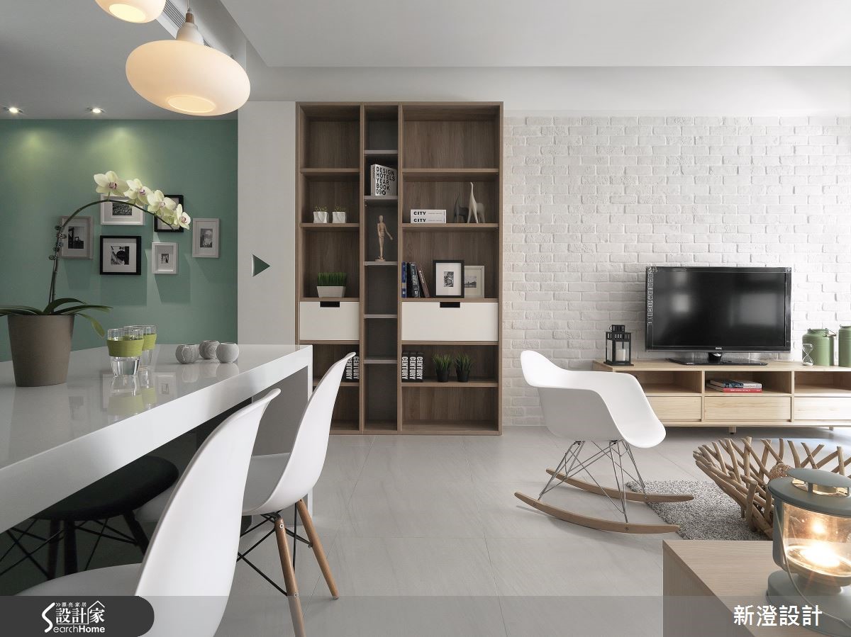 106平方米居所,设计师注入简约净白的空间架构,并添入几笔缤纷色彩,佐以质朴材质、舒适的家具软件等,让白调居宅更显层次。【清新色调,为空间带来朝气活力】走进大门,可见廊道侧墙铺述清新的绿色背景,加入相片装饰,构成美好的墙面表情,延伸入内,则让整体呈现白色基调,透过窗户引进自然采光,与空间互映成明亮宽阔的视感,带来朝气与活力。【温润木质,营造北欧舒适气息】电视墙则以白色文化石砌造而成,旁边连结木作柜体,运用木皮、石材带出质朴的居家气息,同时透过家具软件表述北欧风格,像是白色单椅、木沙发等,皆以流畅的流线造型、朴素的质材,带来舒适的生活体验。