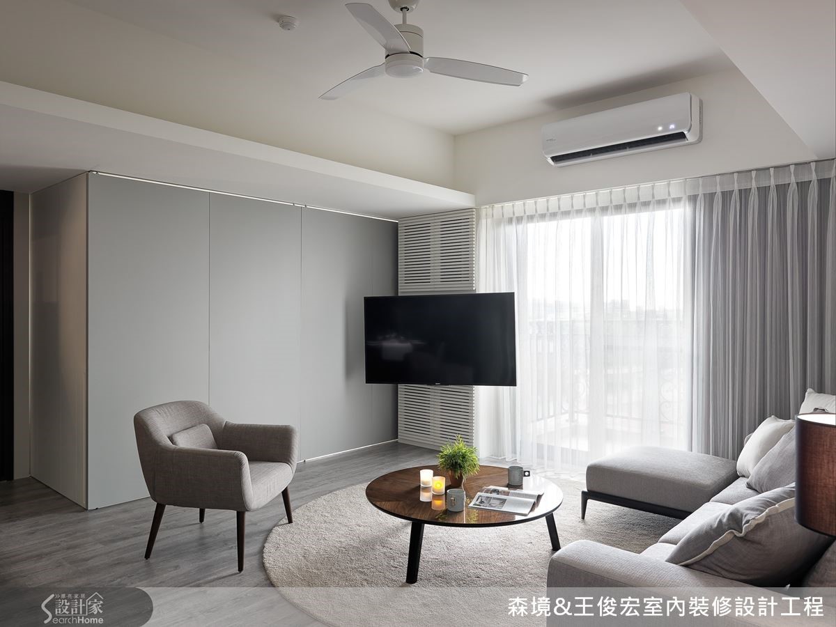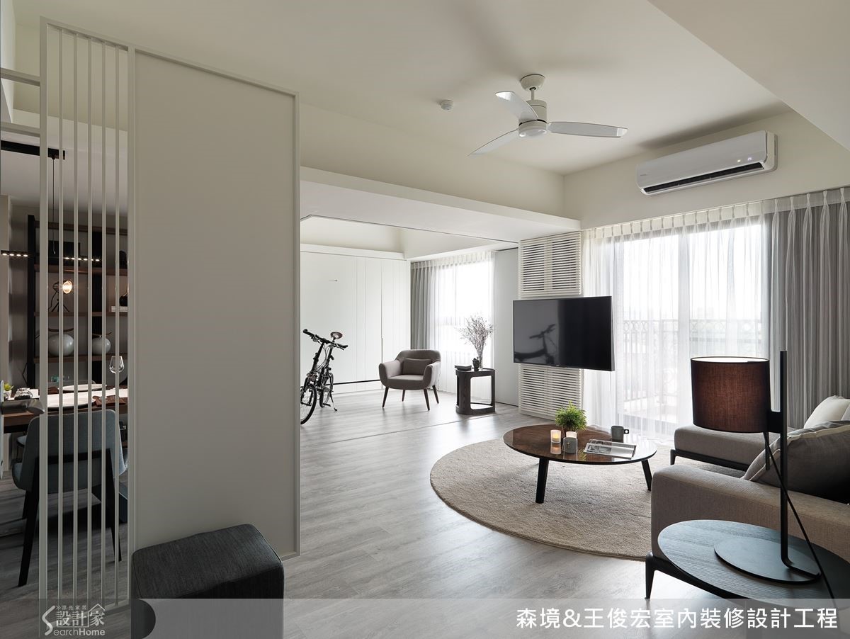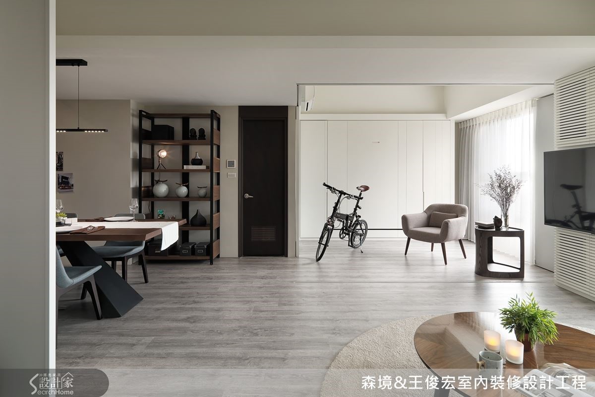 客厅不做隔断,改以折门区隔。可收折的设计不占空间,也能随需求变化空间。不论是多人聚会,或是客人过夜的需求都能满足。折门仅用上轨道支撑,维持平坦干净的地面,呈现俐落效果。