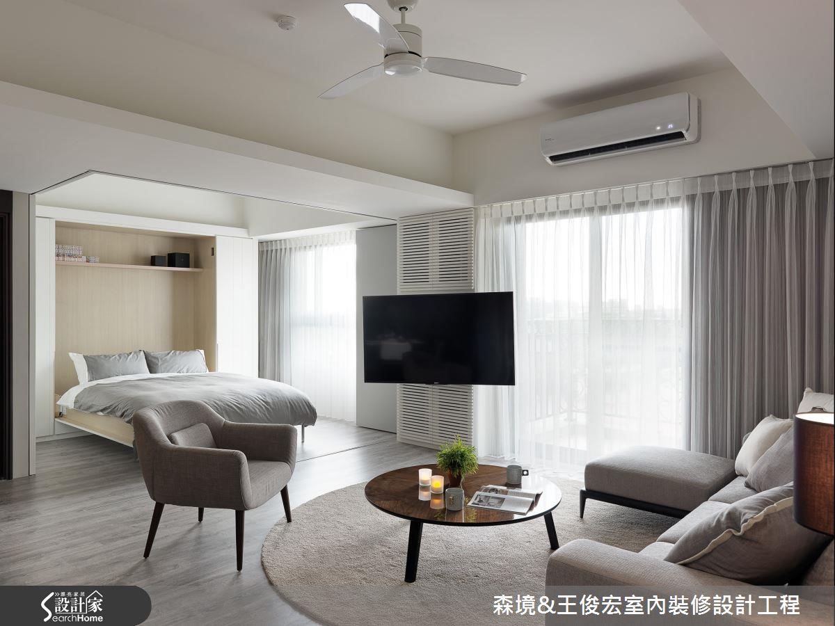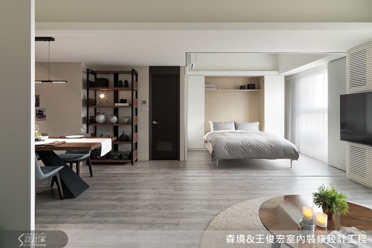 原本的屋况较为阴暗,房间也多,因此拆除客厅隔断,视野瞬间开阔。藉此迎入大量光线,也多了一区多用途的宽敞空间。多用途的区域特地选用可收合的机能床架,父母来访或日后有小孩都能瞬间变出一间房,无须再大肆装修。