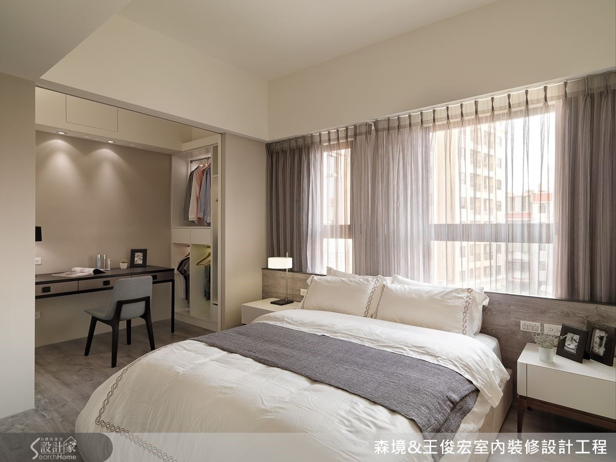 将原本狭小的两室合并,扩容主卧空间,就能规划出女主人梦寐以求的更衣间,增加更多收纳量。而卧房重视的是安稳舒适的气氛,整体色调选用沉静的大地裸色,能让纷乱的思绪沉潜,让人一夜好眠。